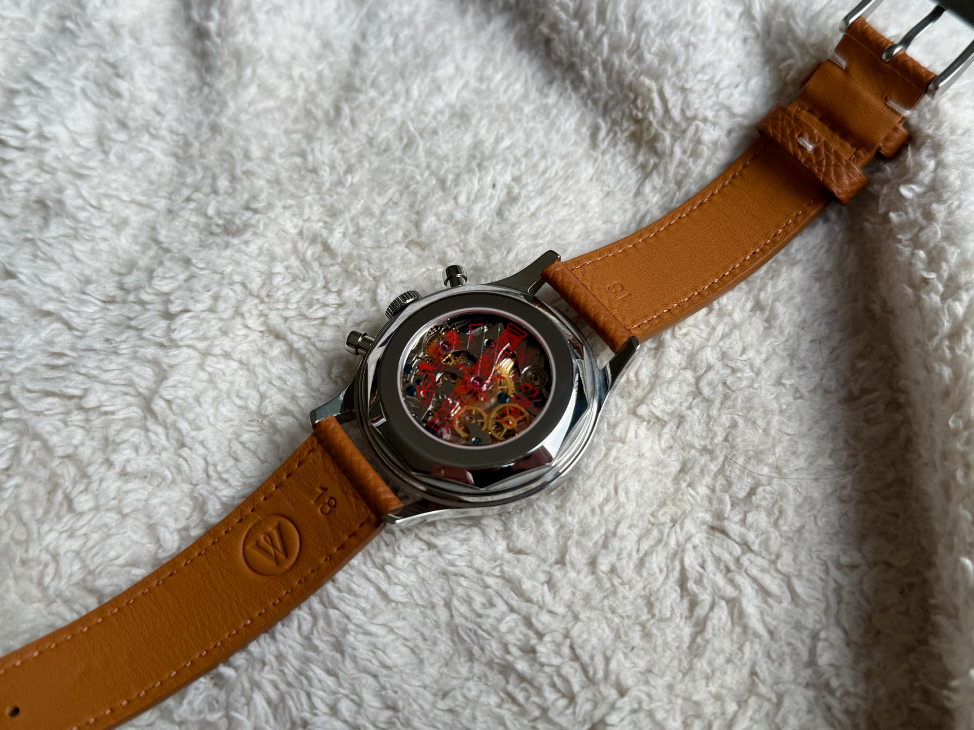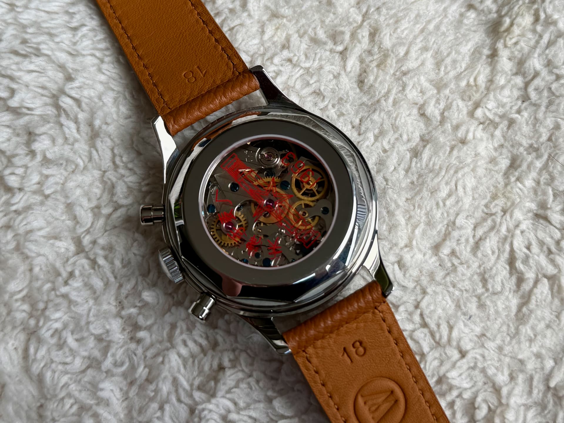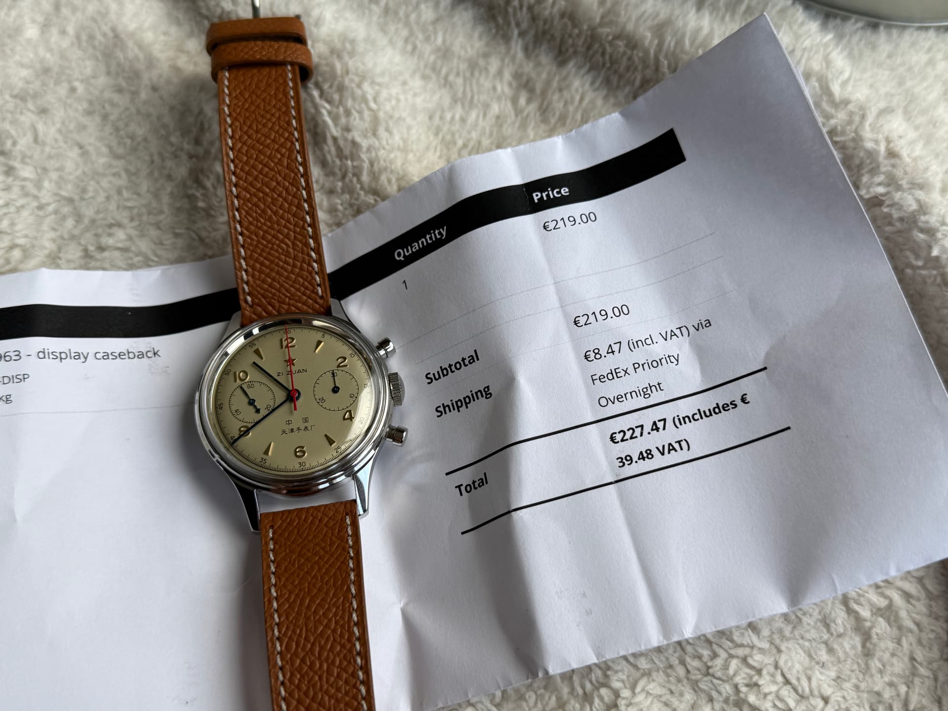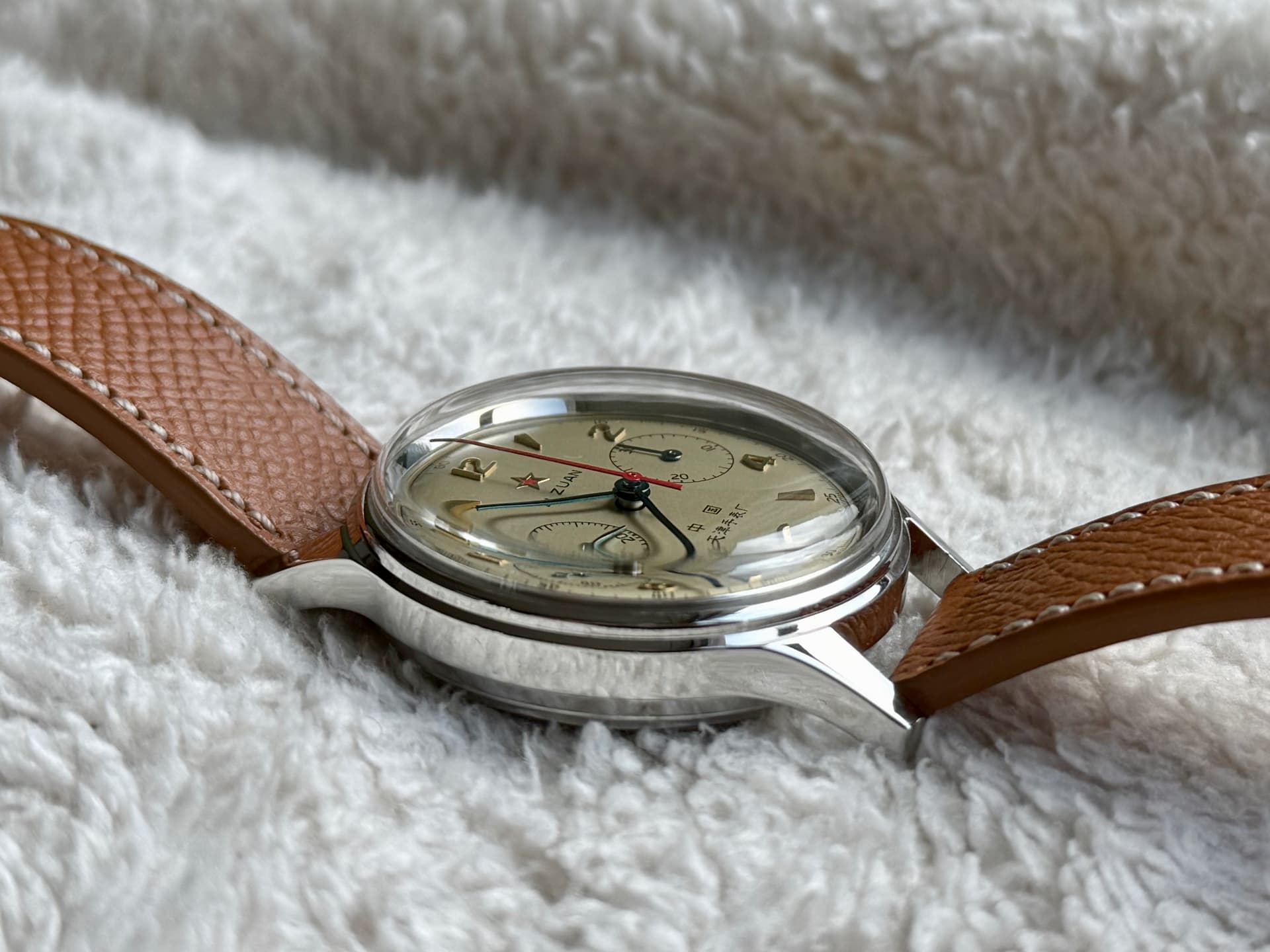 Dit iconische (doch bezahlbare) chronograaf horloge komt op een heel mooi lichtbruin leren bandje van Watch Works Haarlem kuch ‘Molequin’ t.w.v. 110 piek, maar doe ik er voor een geeltje bij. Haalt het horloge wel enorm op. ![]()