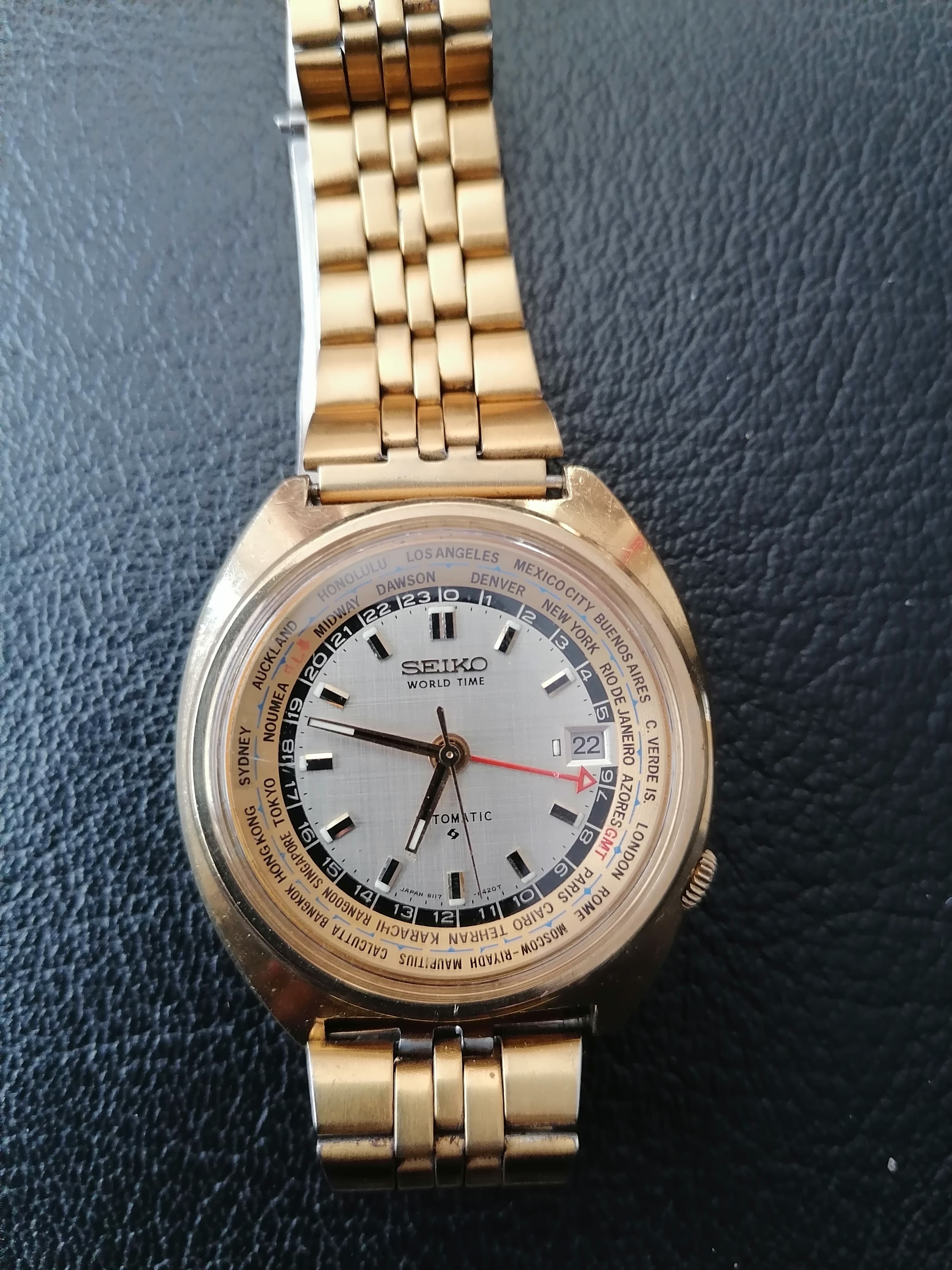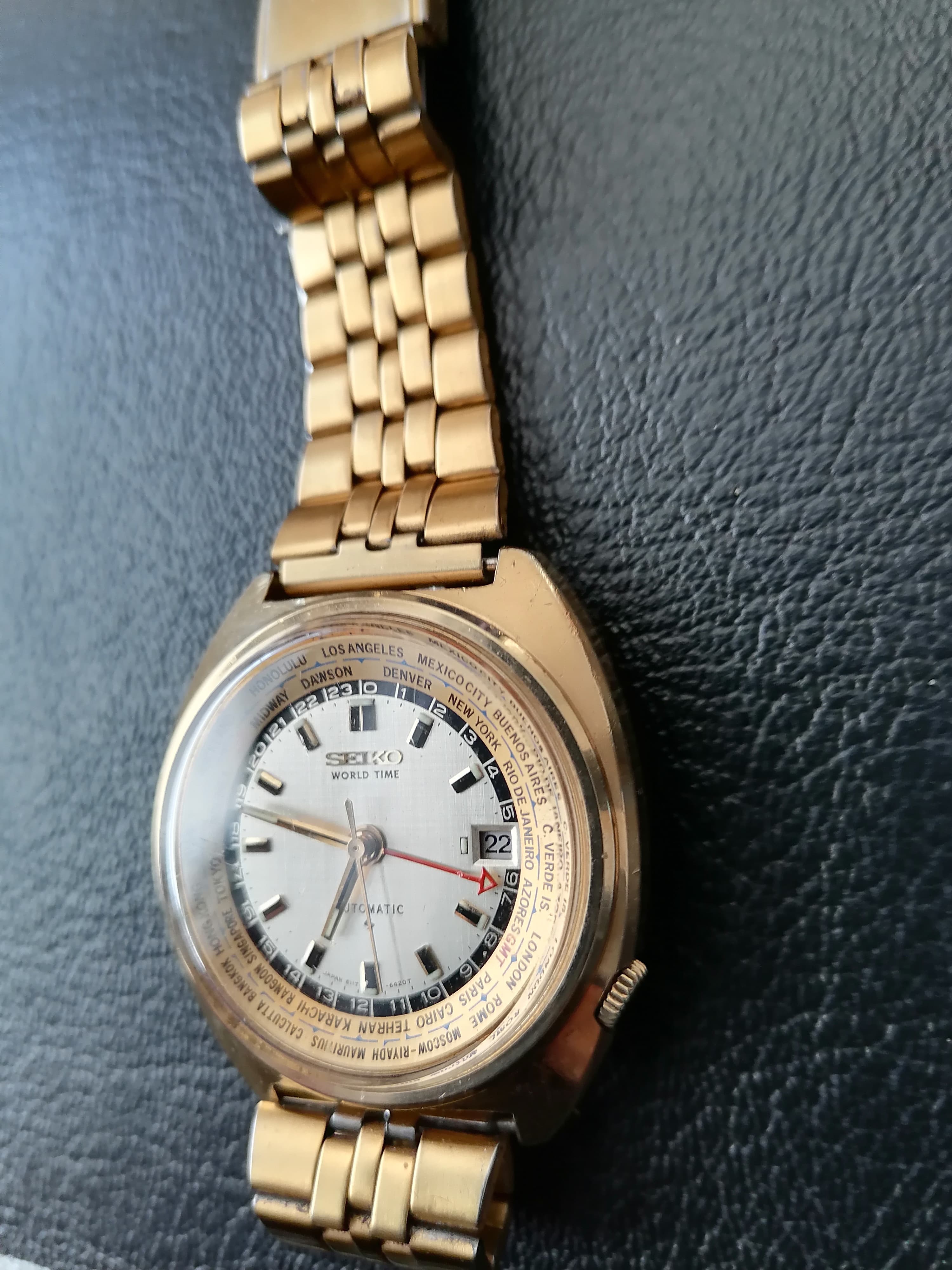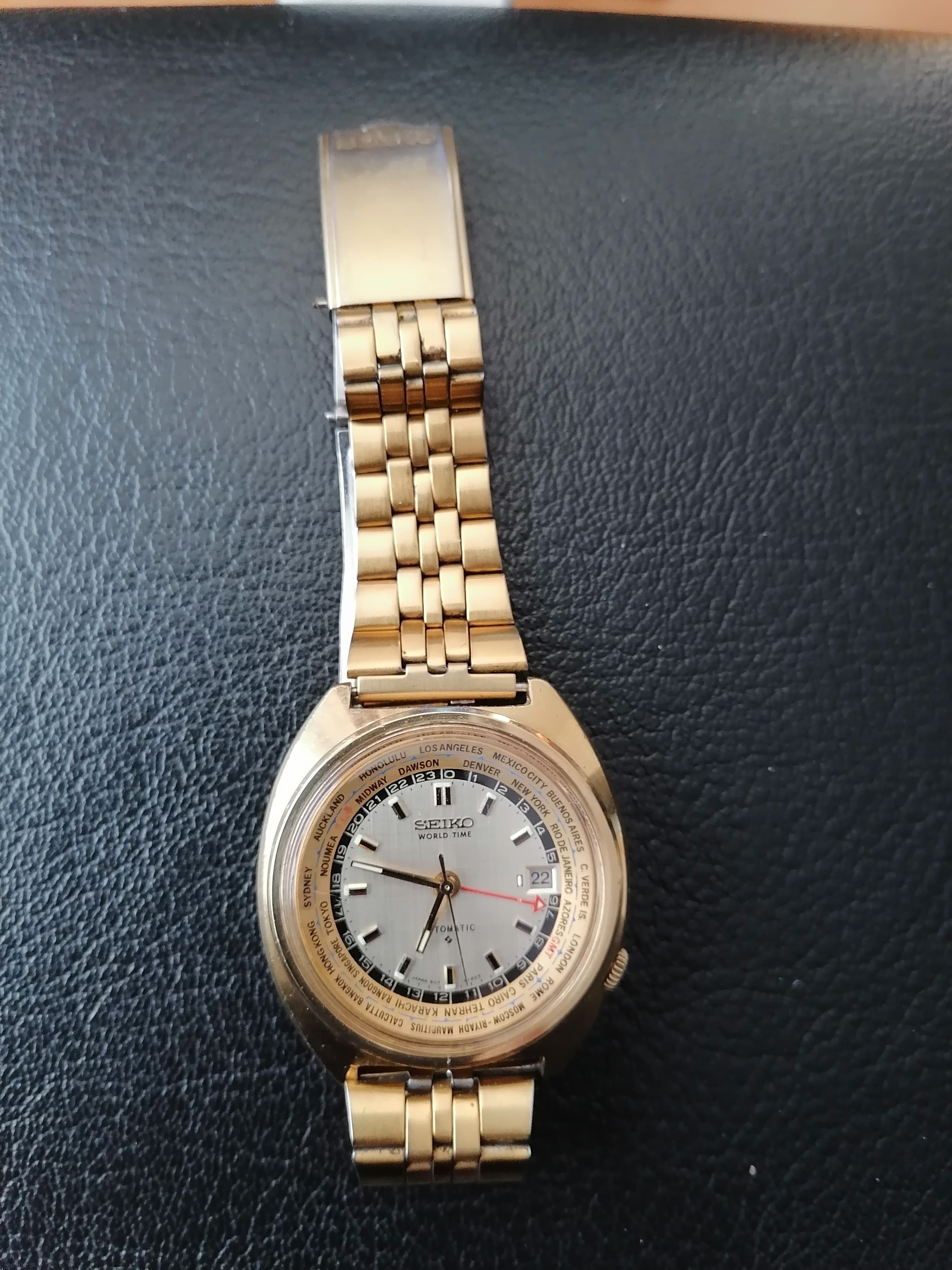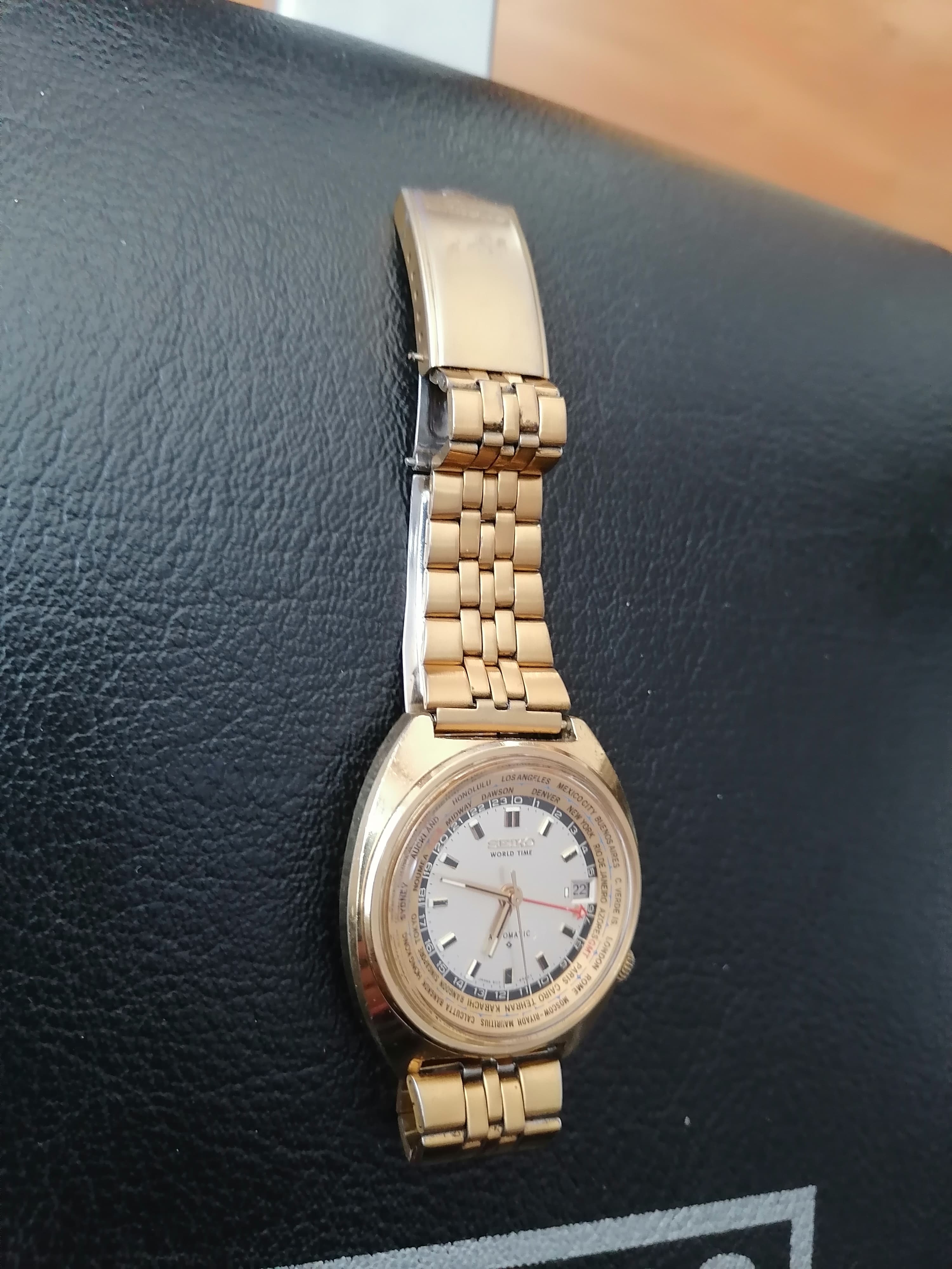 Mooi en goedlopende Seiko GMT goudkleurig. Met goudkleurige niet originele Seiko band. Binnenring draait perfect. Vraagprijs 525 euro. Mocht je geinteresseerd zijn of vragen hebt, stuur een PB.