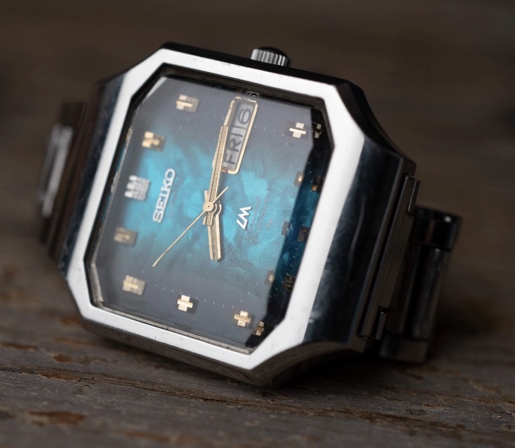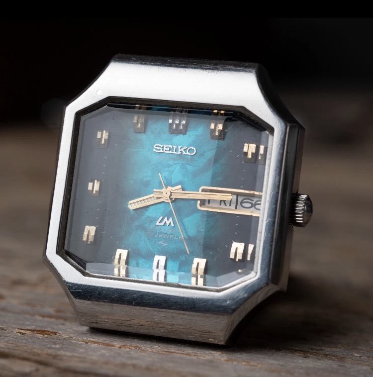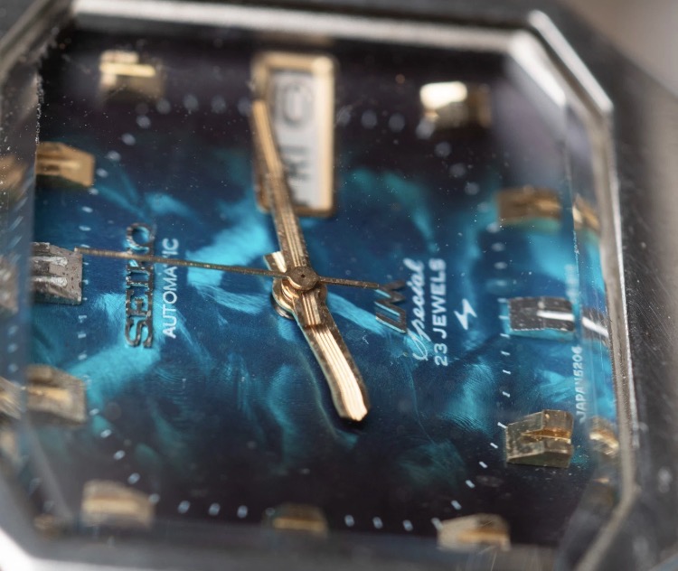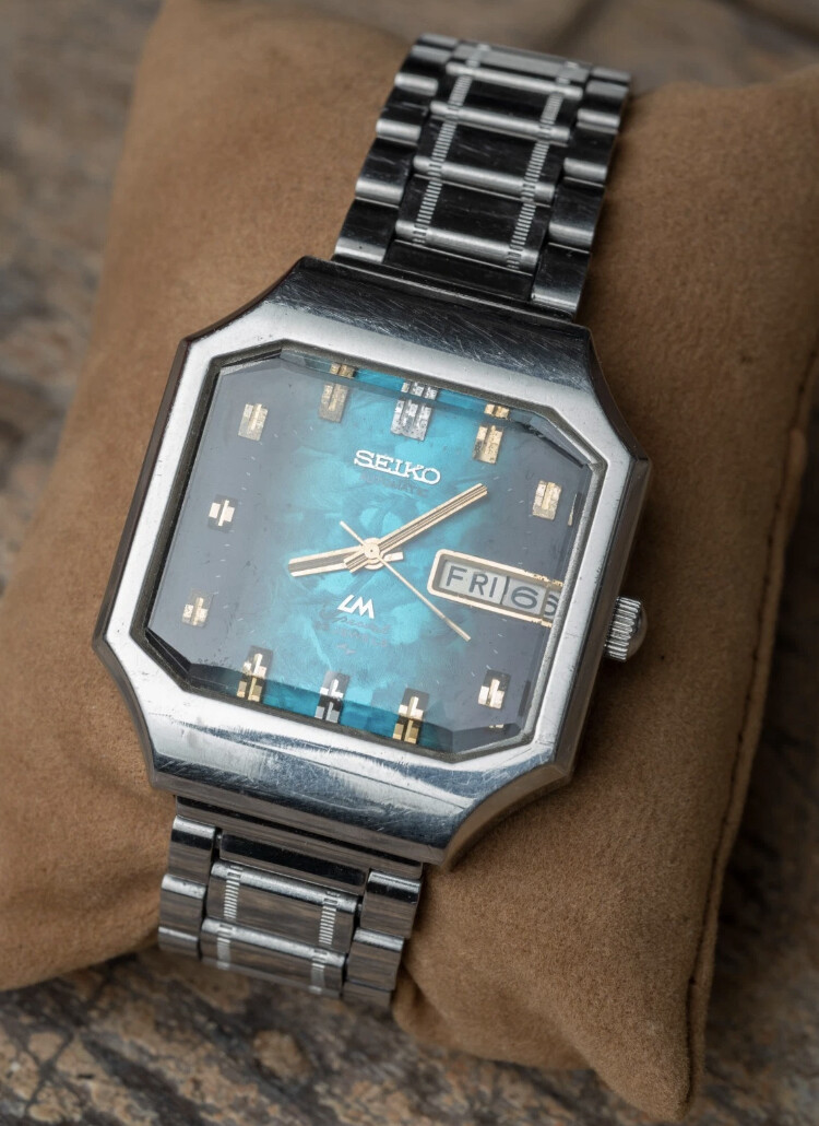 Zeldzame Seiko LM Special 5206-5080, slechts een korte periode in 1973 geproduceerd. Het horloge heeft een 9 facets kristal, een ‘arctic aurora’ wijzerplaat met mooie lichtreflecties, met vergulde opgelegde indexen en een dag-datumvenster. Vanbinnen klopt het 5206A high-beat (28.800 bph) automatisch uurwerk. Bracelet is niet origineel Seiko, en hij past precies goed om mijn pols (19cm).