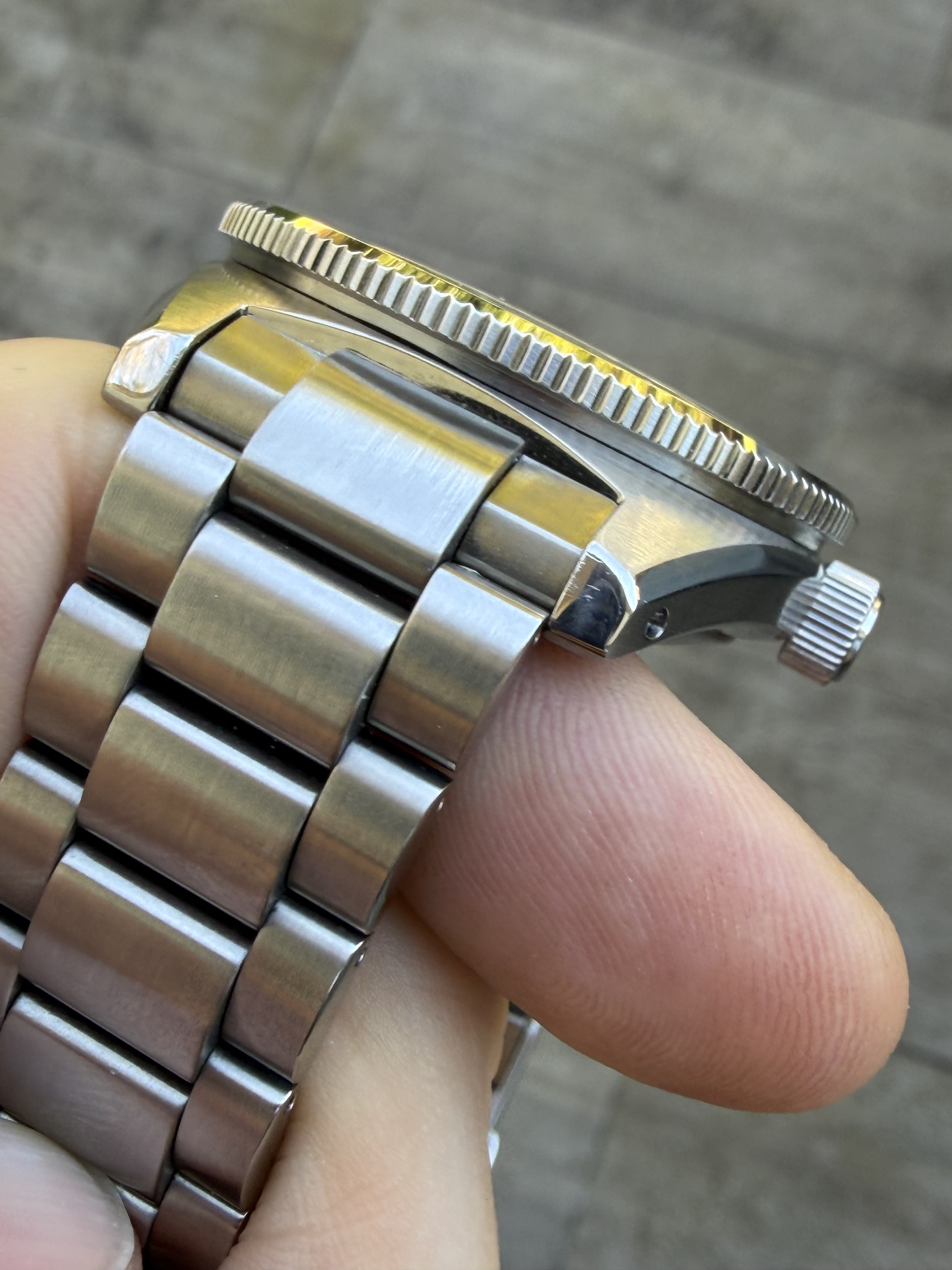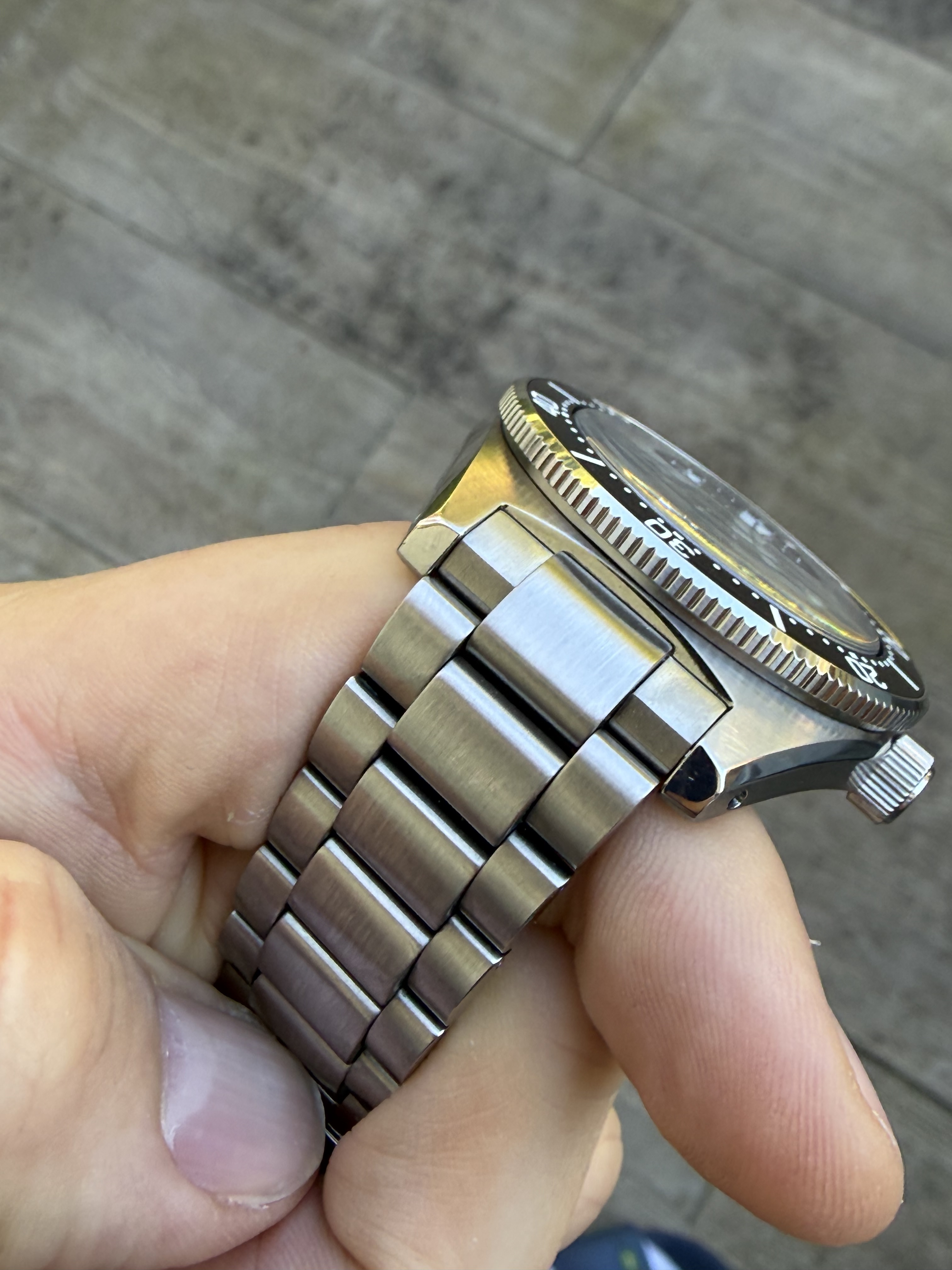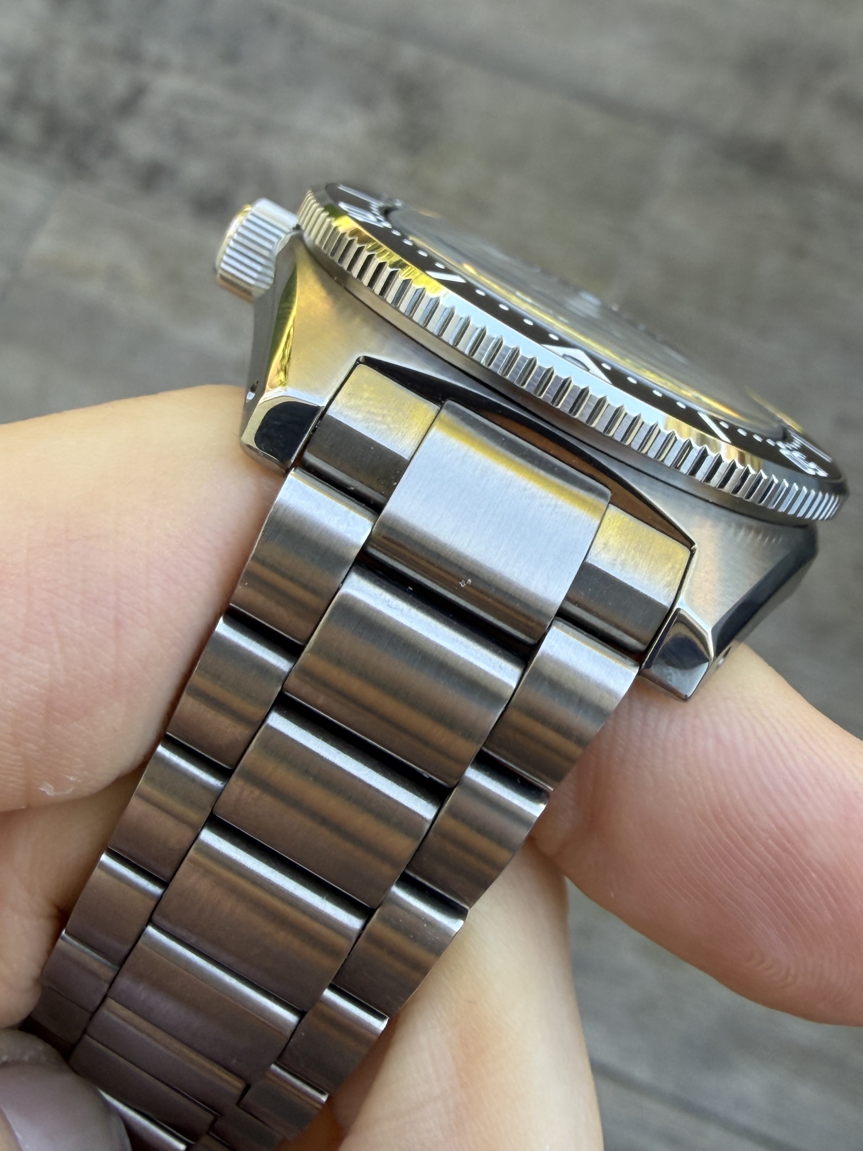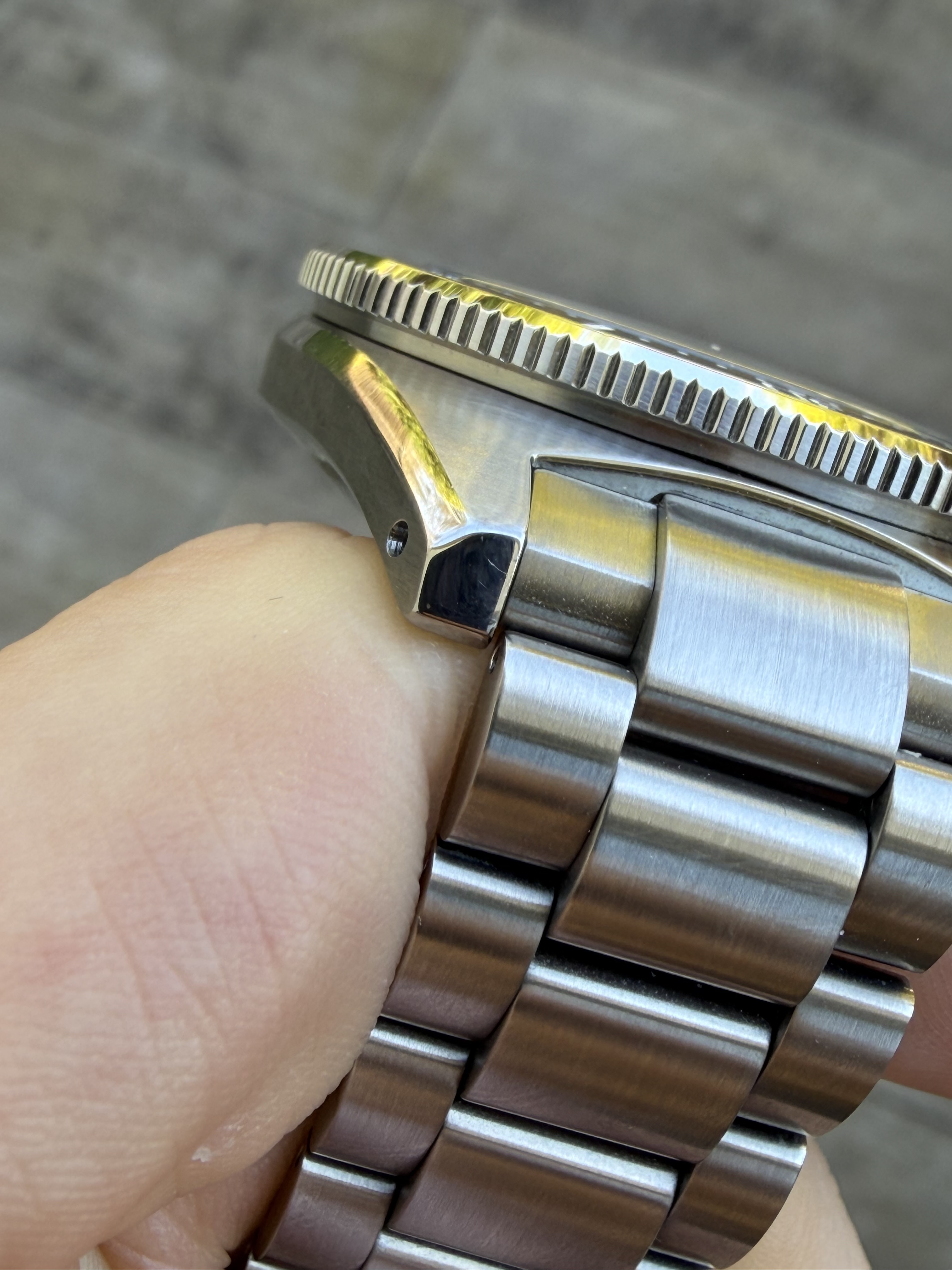 - krasjes op de onderste gepolijste vlakken van de lugs onderaan. Licht krasje links, wat zwaardere krasjes rechts. Zie foto’s 9 tot 16. In het ‘ervaringen met’ topic in kwestie staan ook wat uitvergrootte tegenlicht closeups. Ga die zeker checken.