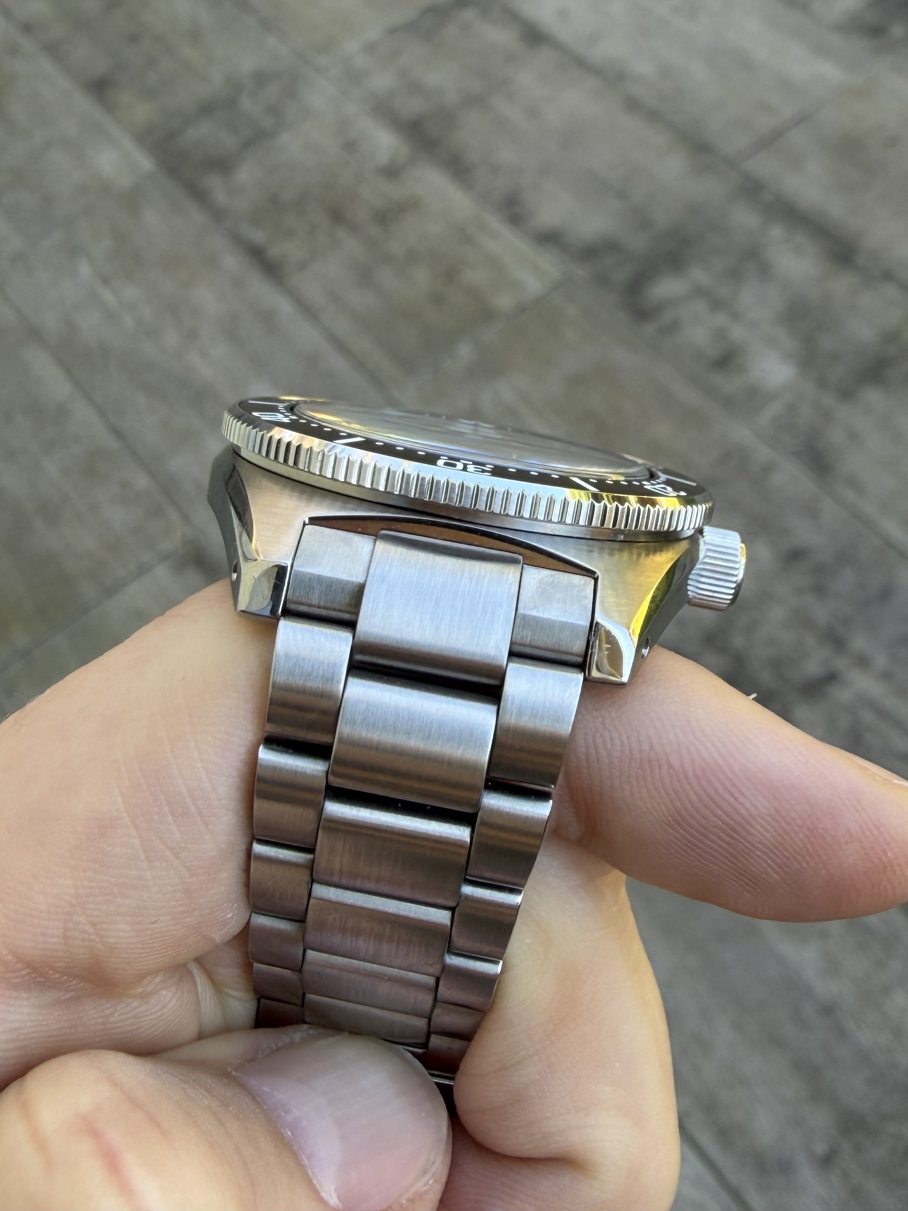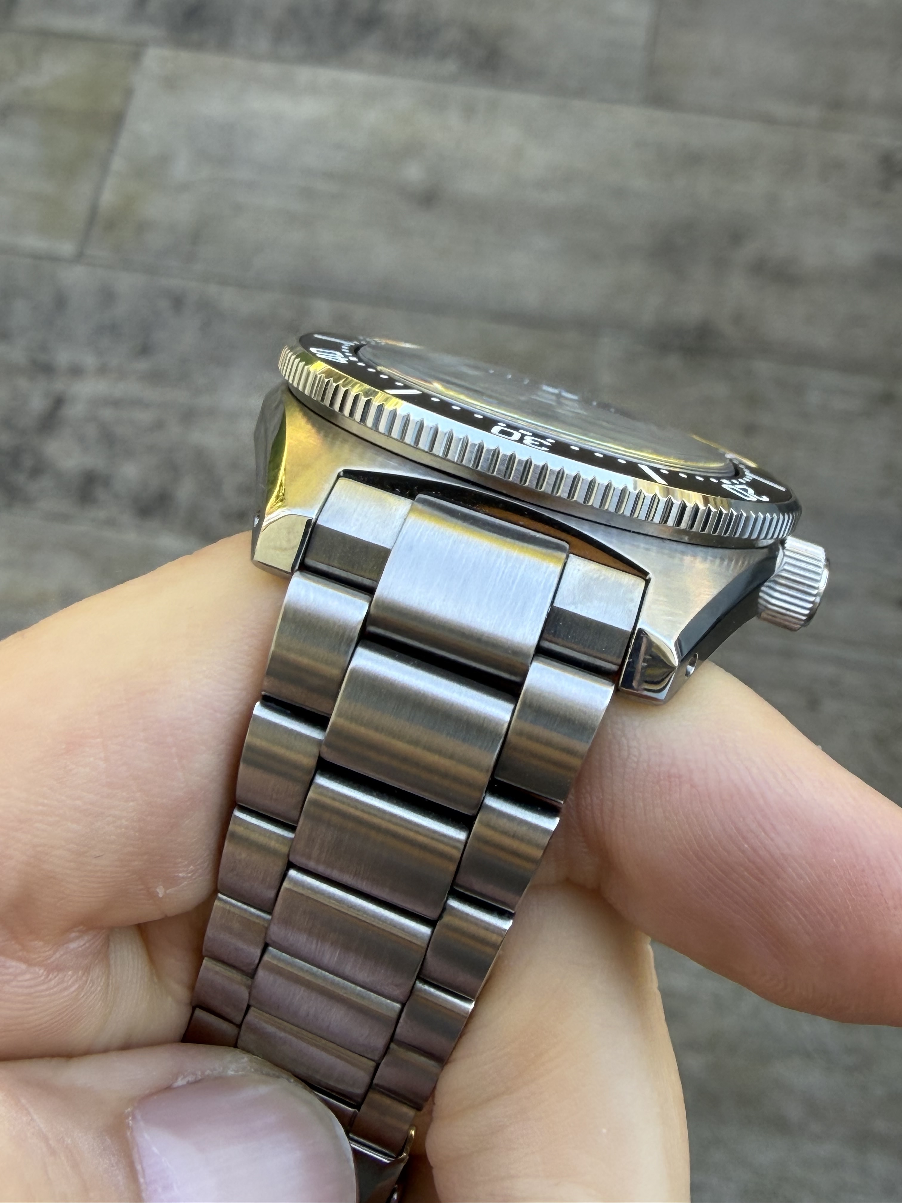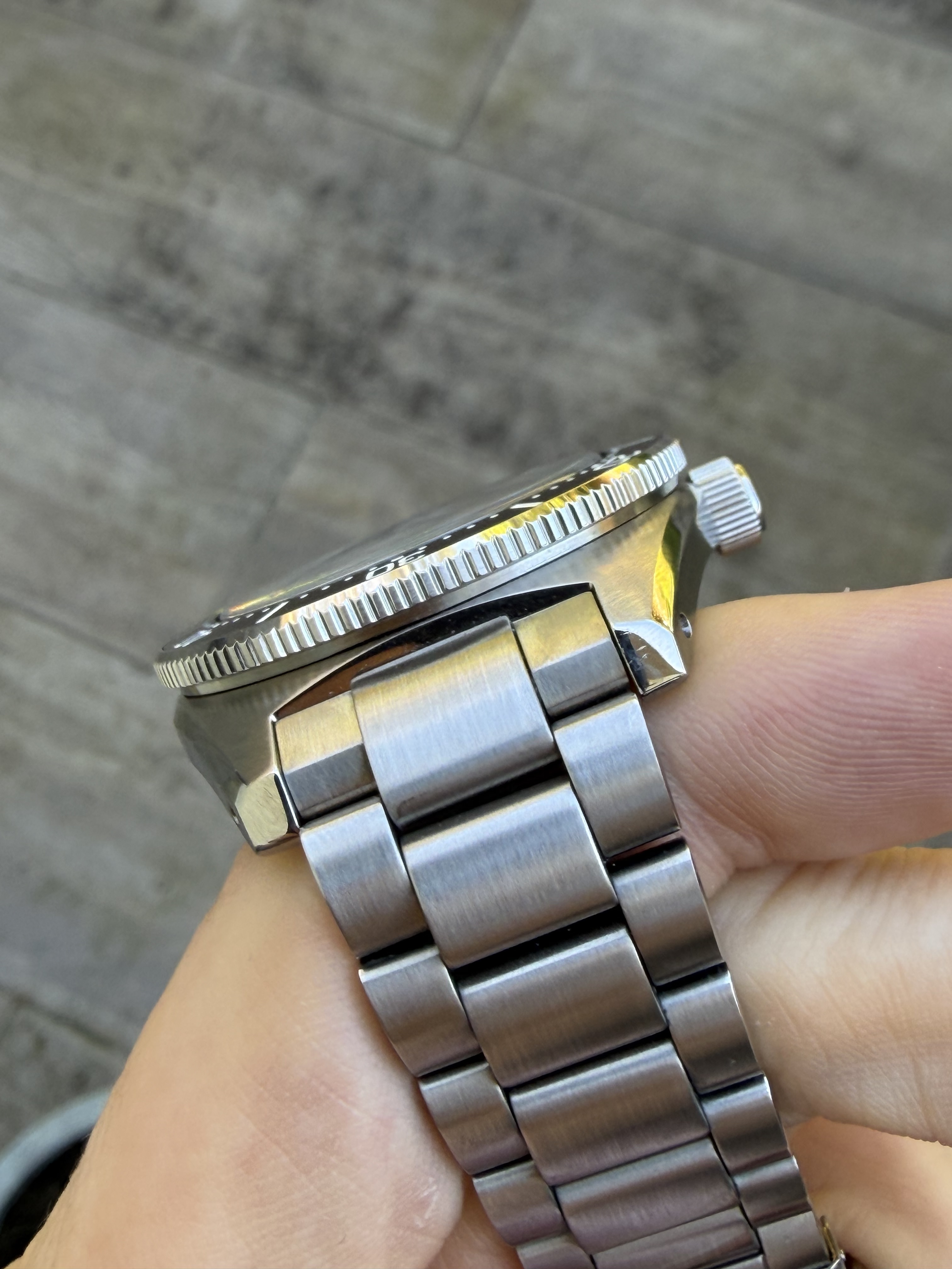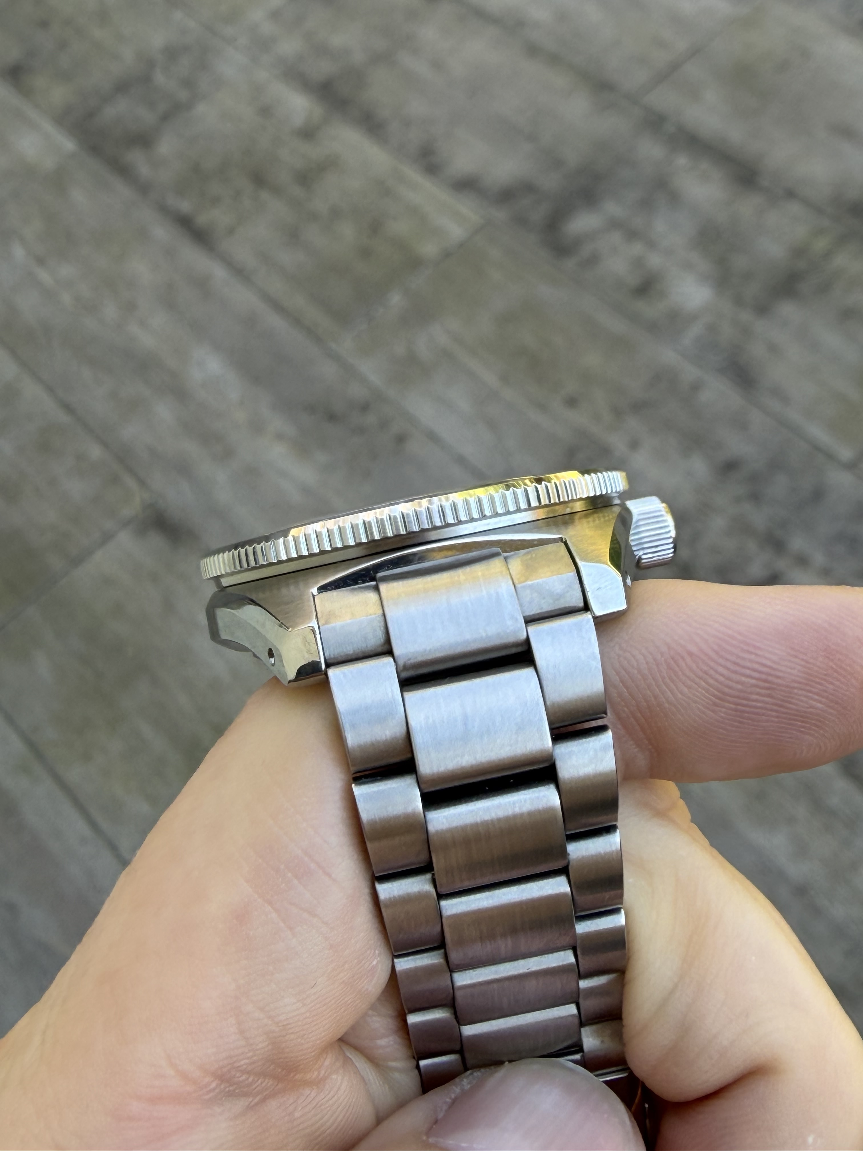 - krasjes op de onderste gepolijste vlakken van de lugs onderaan. Licht krasje links, wat zwaardere krasjes rechts. Zie foto’s 9 tot 16. In het ‘ervaringen met’ topic in kwestie staan ook wat uitvergrootte tegenlicht closeups. Ga die zeker checken.