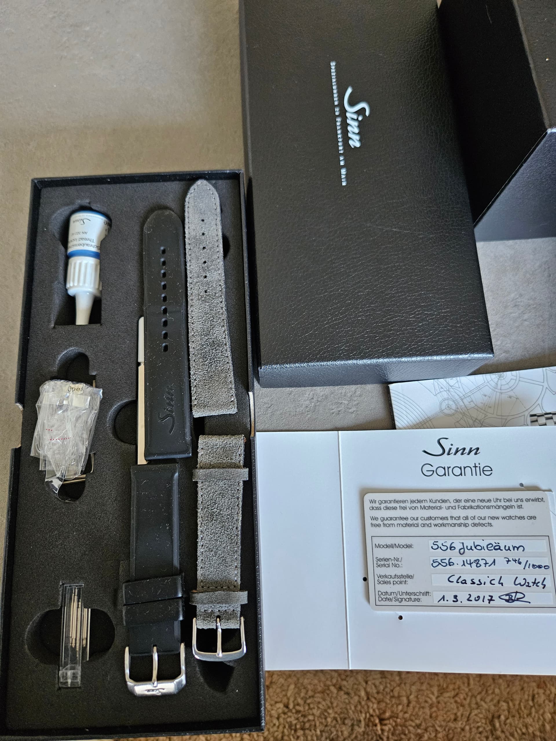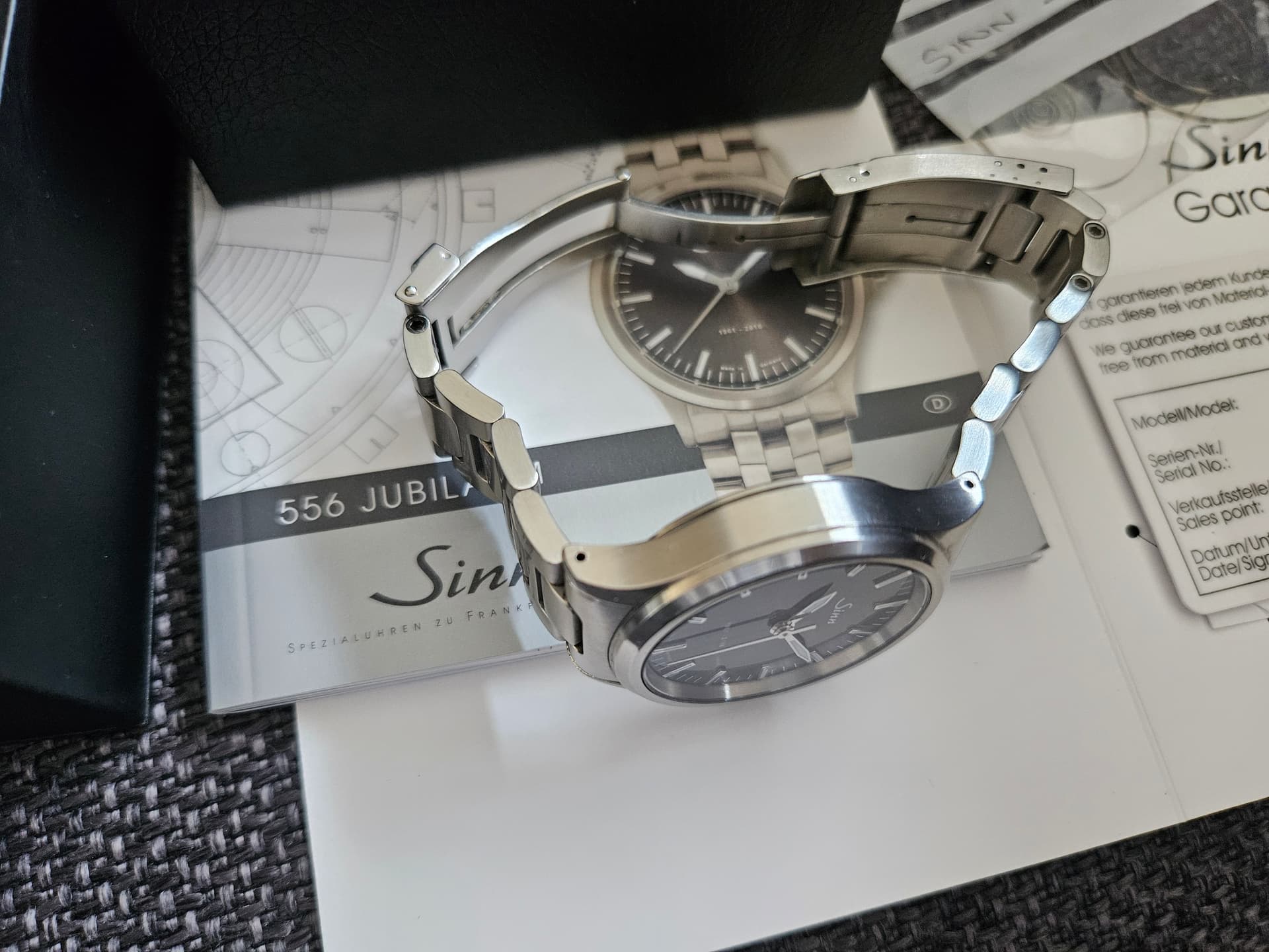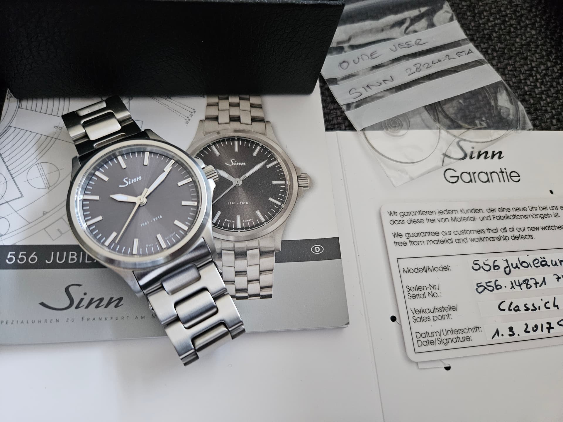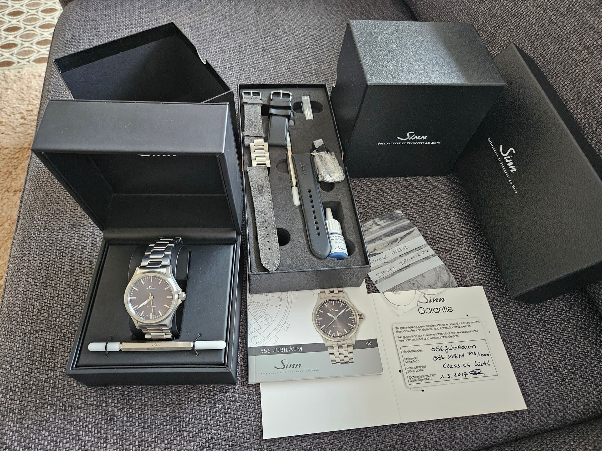Te koop: Sinn 556 jubiläum in prachtige grijze sunburst met een topgrade ETA 2824 en heel veel accessoires. Limited edition nr 746 van een jubileum oplage van 1000 stuks.