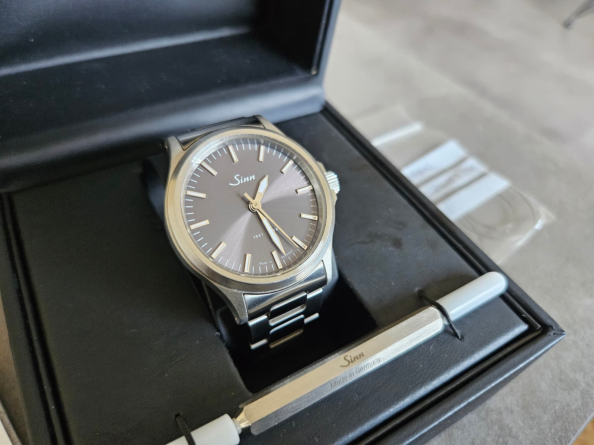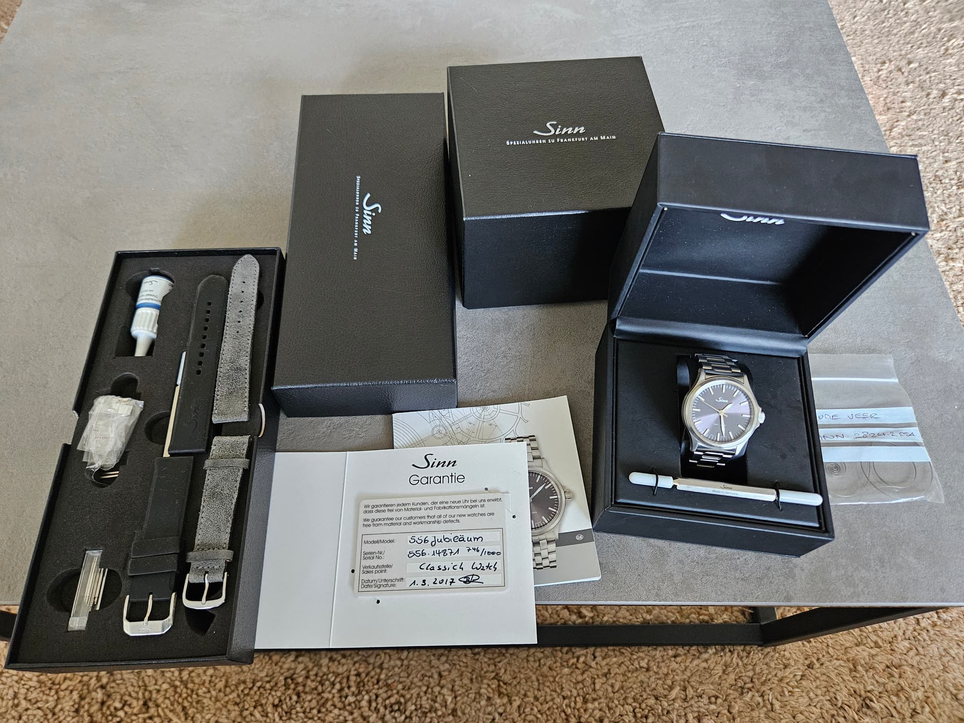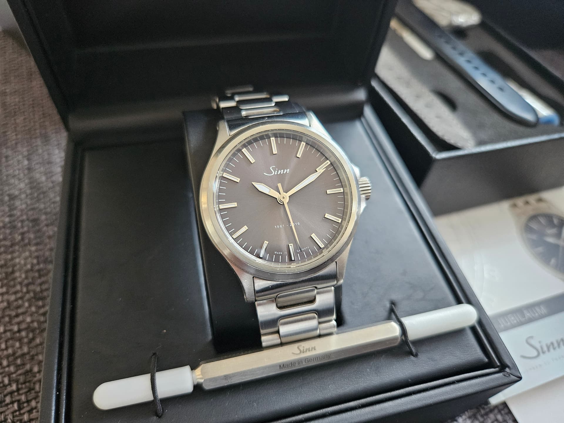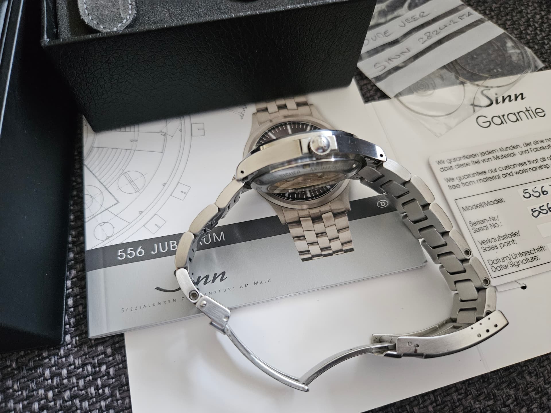 Te koop: Sinn 556 jubiläum in prachtige grijze sunburst met een topgrade ETA 2824 en heel veel accessoires. Limited edition nr 746 van een jubileum oplage van 1000 stuks.
