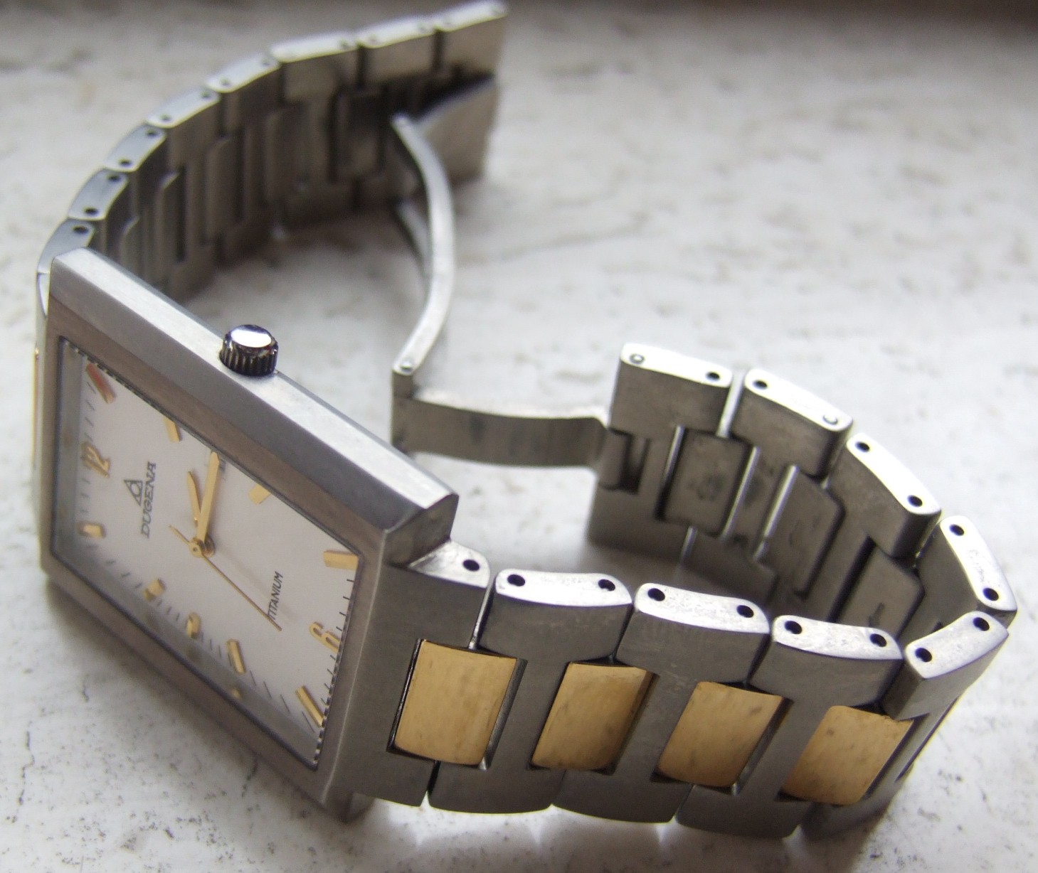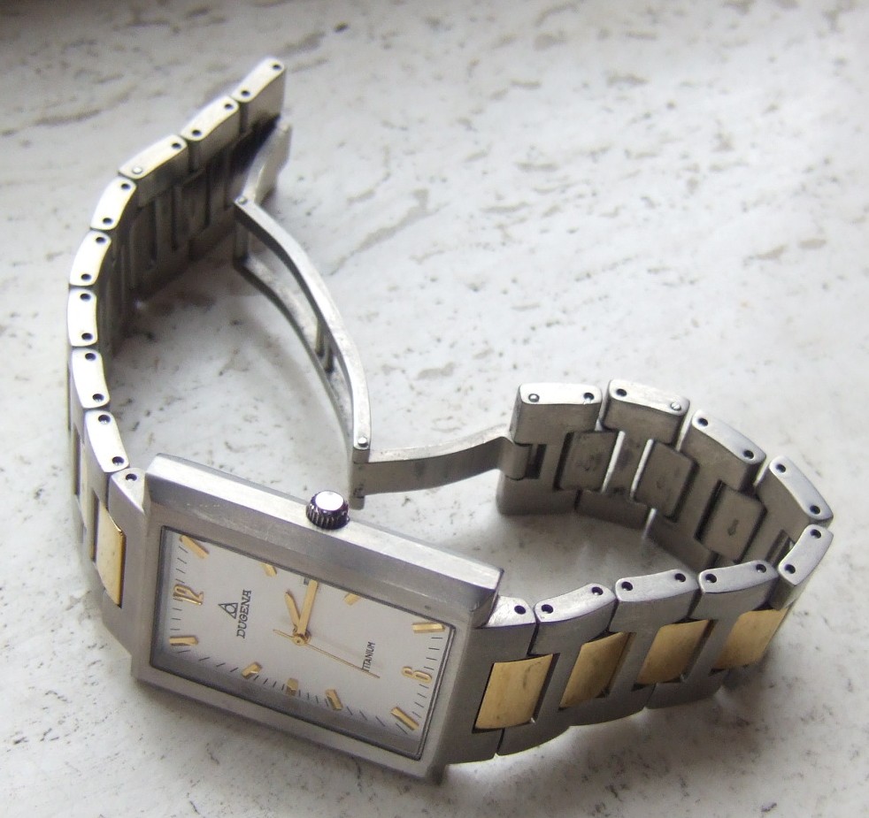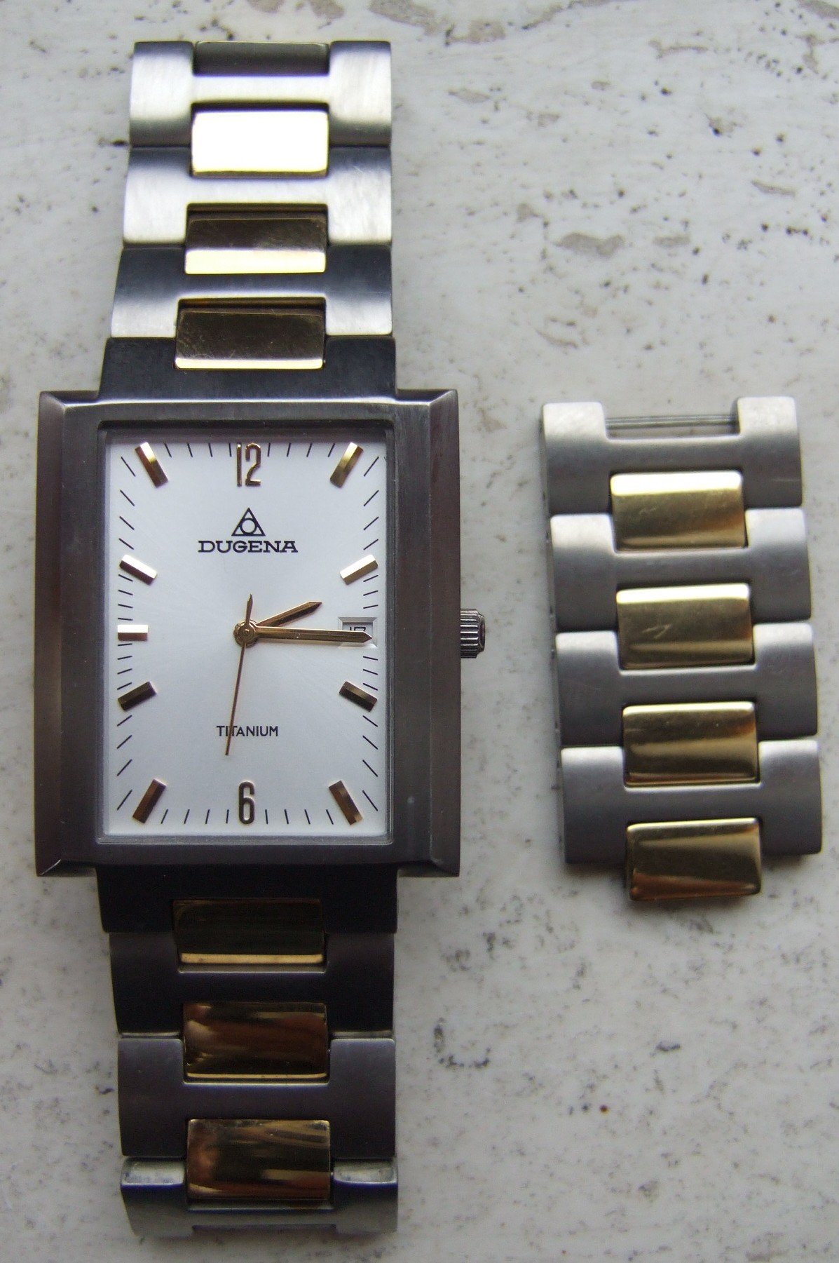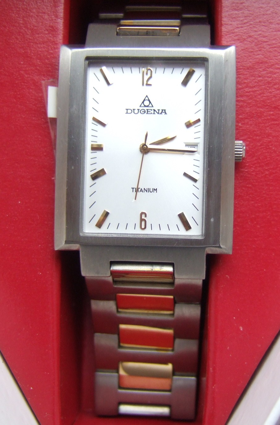 Mooi, en uiterst licht titanium (zowel kast als de bicolor band) quartz horloge van het gerenommeerde Zwitserse merk Dugena. Er zit een Zwitsers Ronda kwaliteits-caliber in gemonteerd, en er werd net een nieuwe batterij geplaatst, dus je bent goed voor jaren!