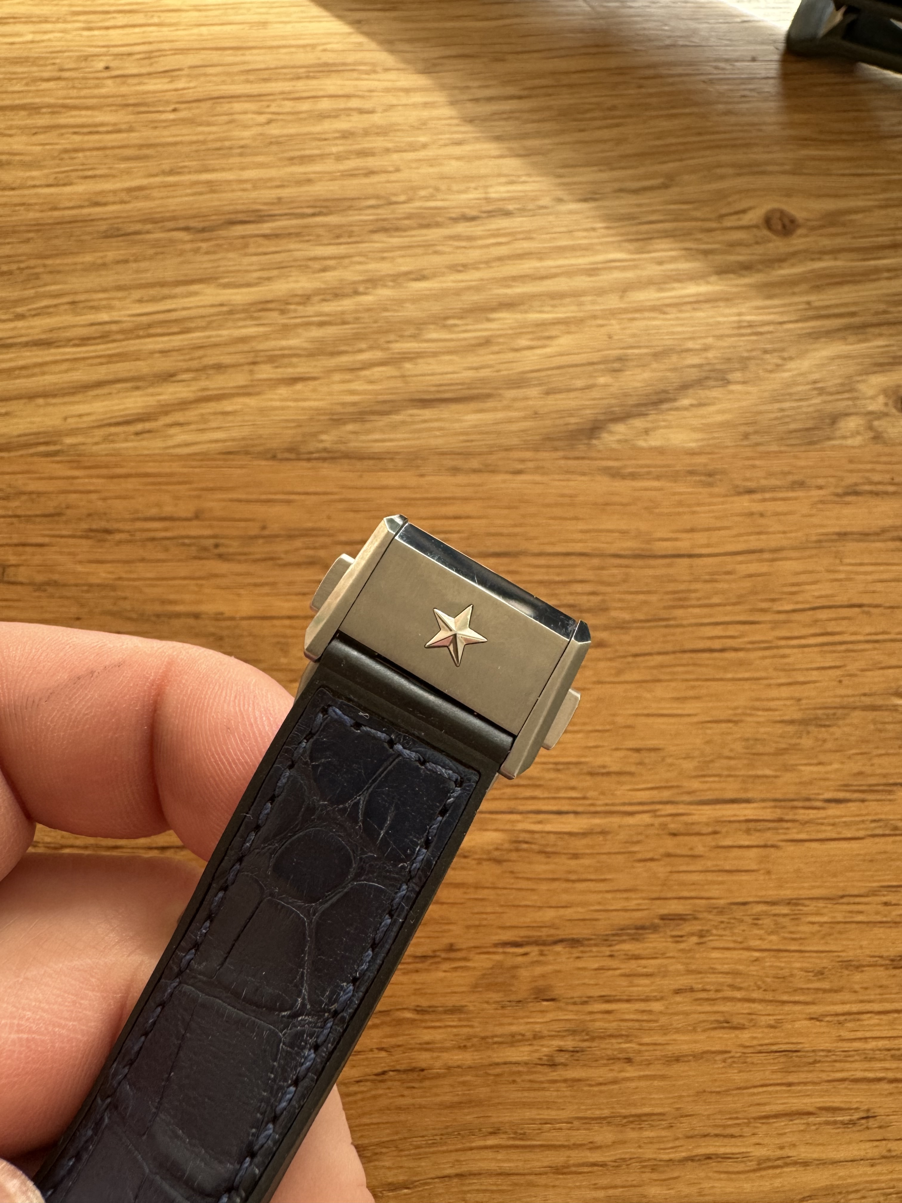 Dan de GS. Heeft een werkelijk waar prachtige plaat, superstrakle wijzers en een uurwerk wat boterzacht opwind. De gesp met het oude type schrift maakt het helemaal af. Heb evt ook nog een GS gesp met nieuwe type mocht je die mooier vinden. Die er nu op zit, is wel wat erop hoort.
