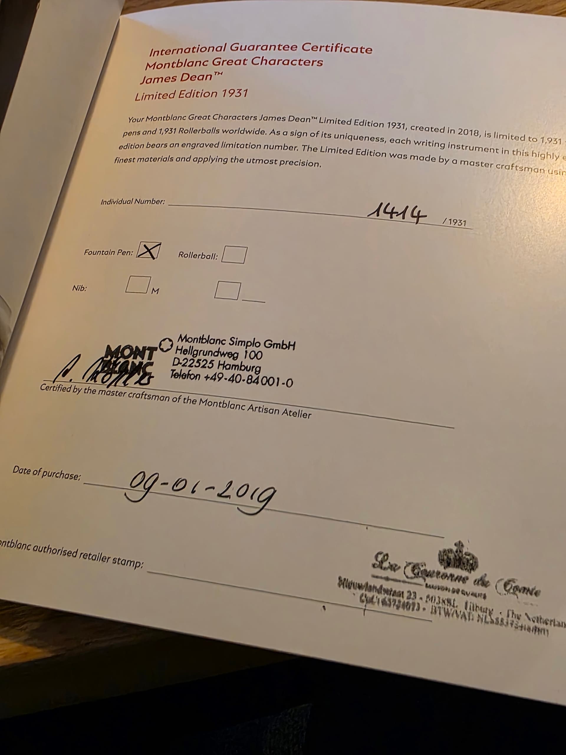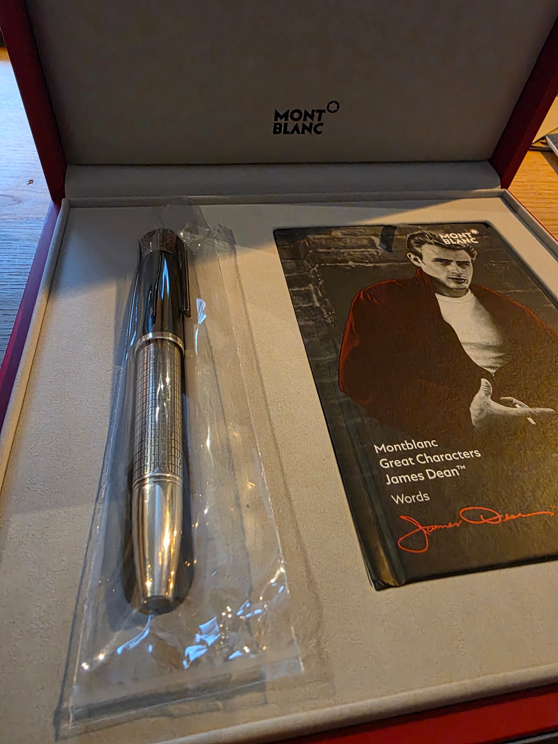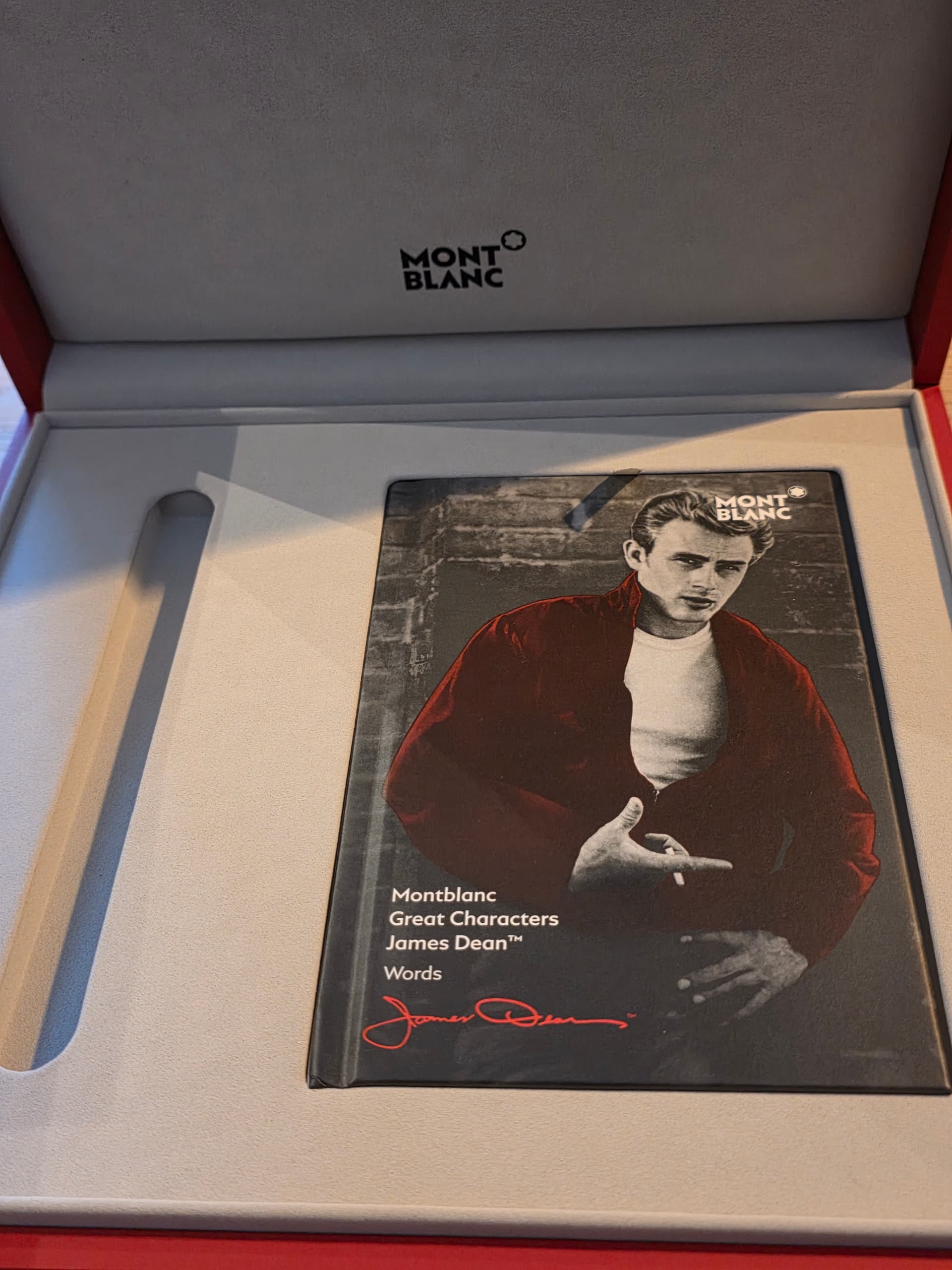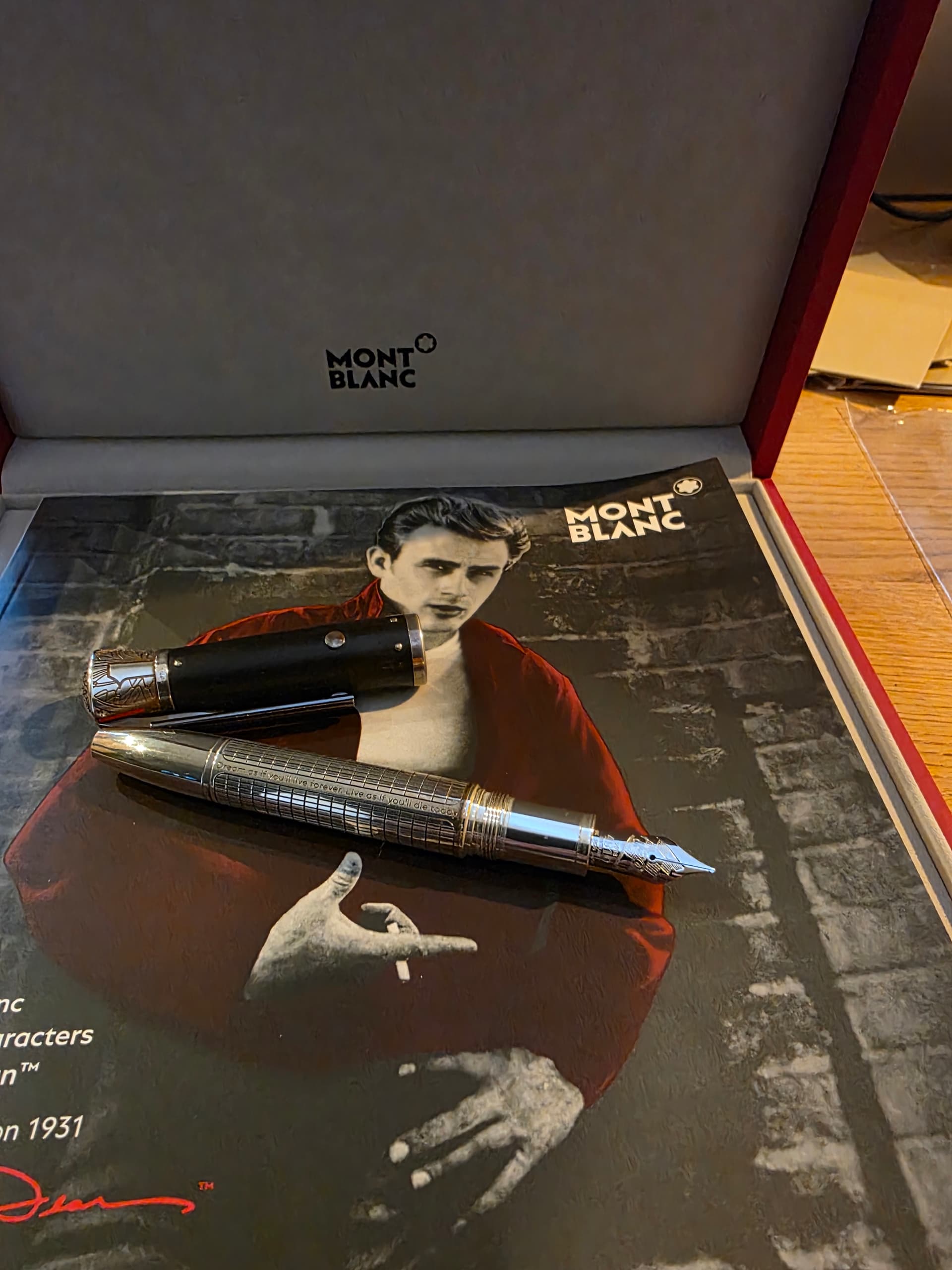 Ter ere van James Dean is er deze limited, zilveren vulpen van Mont Blanc uit 2019 uitgegeven;het komt in de originele verpakking en het horloge is ongebruikt. Het betreft de M nib. Er is natuurlijk de verklaring van garantie van MB bij, alsmede twee boekjes met de uitleg over de pen en het leven van James Dean,