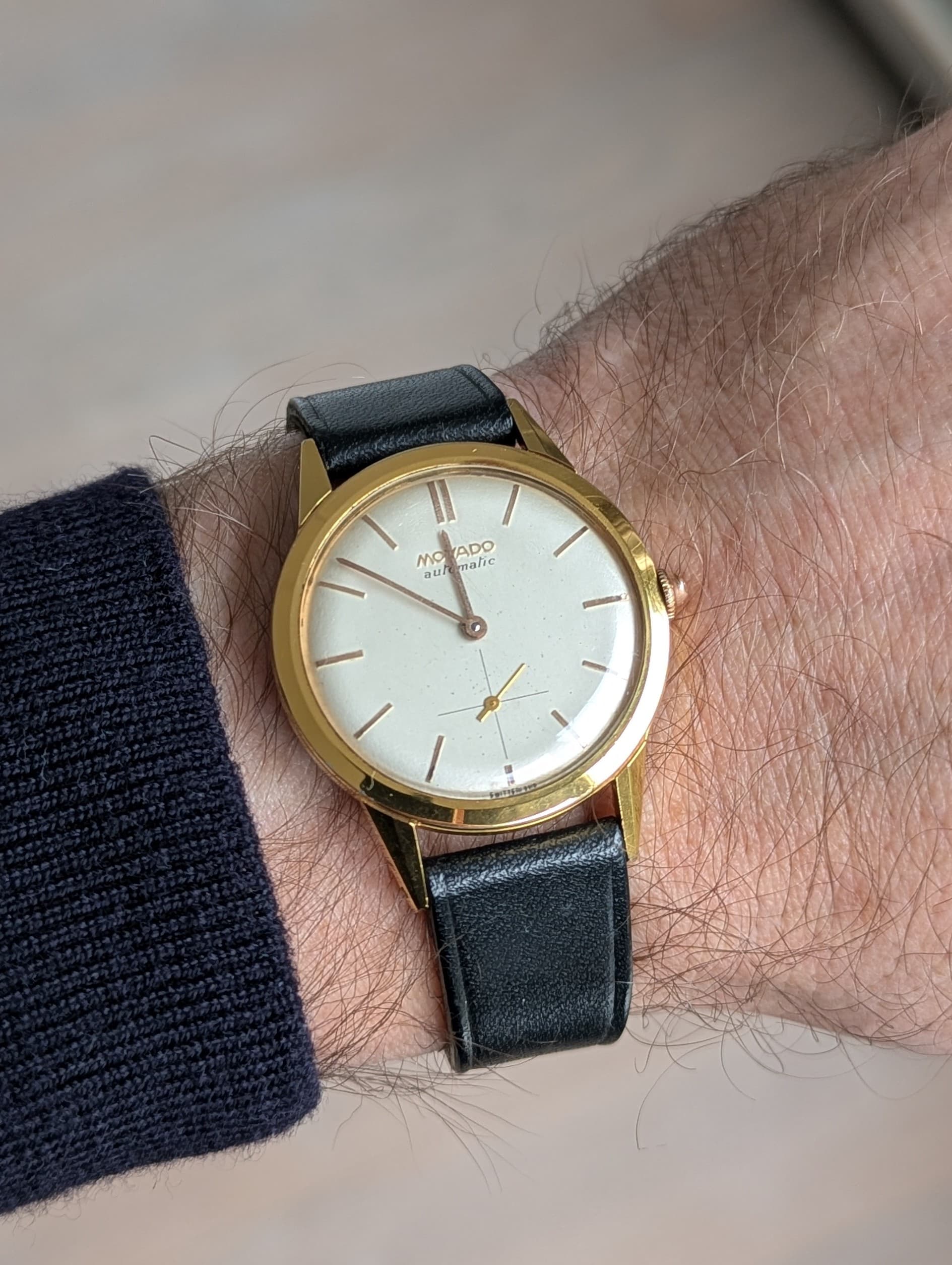 Conditie (krassen, werking etc): Alles origineel, haarscherpe kast, wijzerplaat met patina. Uurwerk heeft service gehad toen ik het kocht. Alles werkt zoals het hoort. Het bandje heb ik laten maken naar voorbeeld van het originele Movado-bandje.