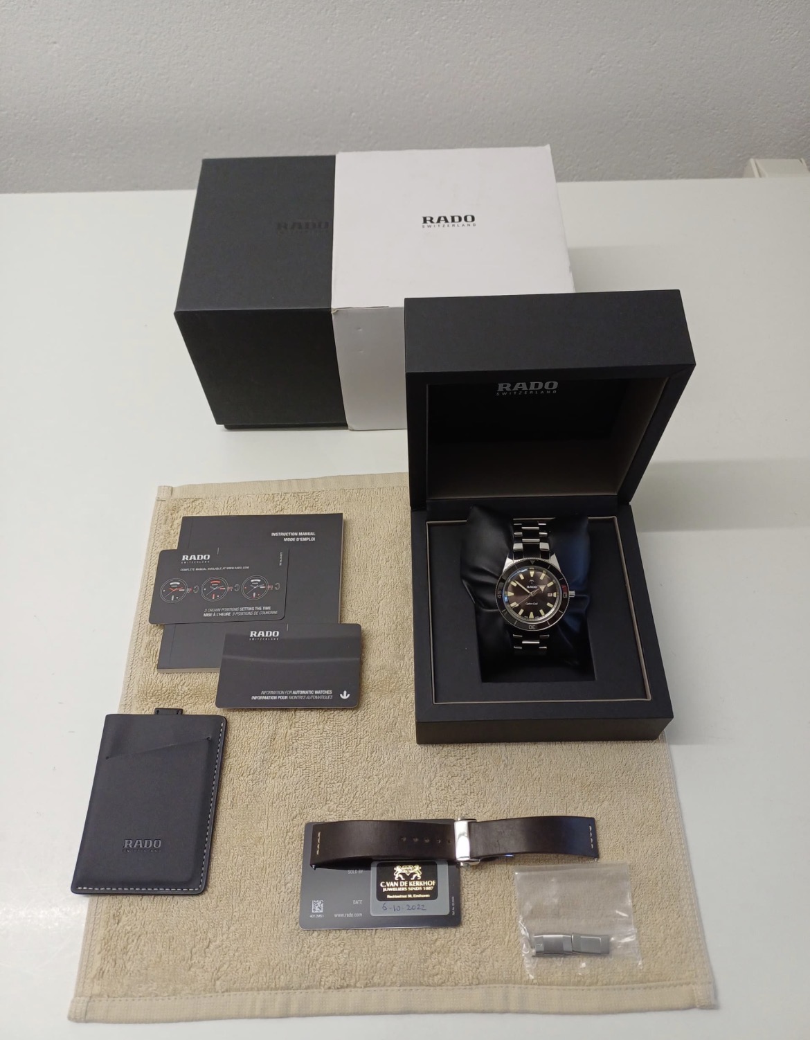 Verzendkosten of afgehaald in regio: Doos, binnendoos, omdoos, pasjes, boekje, originele stalen en originele leren band en een mooie after market bruine nato.