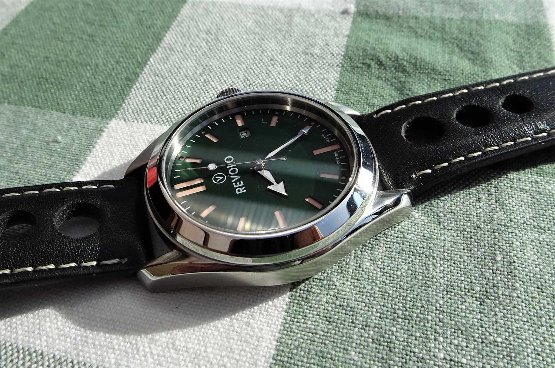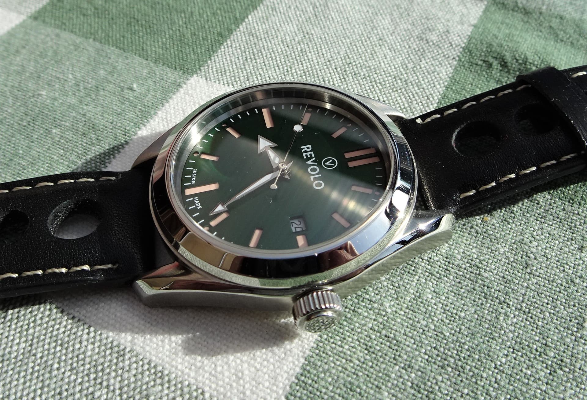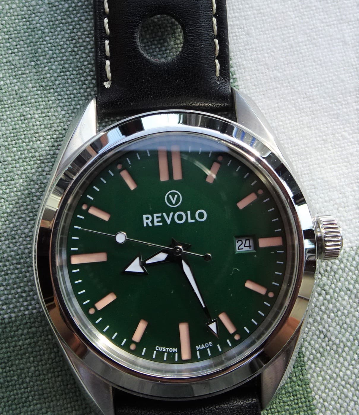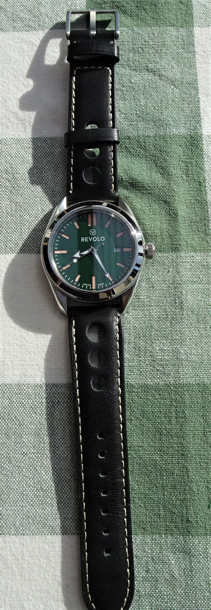 Revolo is een horloge-manufacture waar je je horloge naar je eigen smaak (kast, wijzerplaat, wijzers, binnenwerk, bandje) kan laten samenstellen. Dit horloge bezit een Zwitsers Ronda 515 binnenwerk, en heeft een diameter van 42mm, heeft een spectaculaire groene ‘sunburst’ en “sandwich” wijzerplaat, en donkergroene lederen bandje met prachtige Revolo sluiting. Het kostte 275€. Is nooit gedragen. Net nieuwe batterij geplaatst.