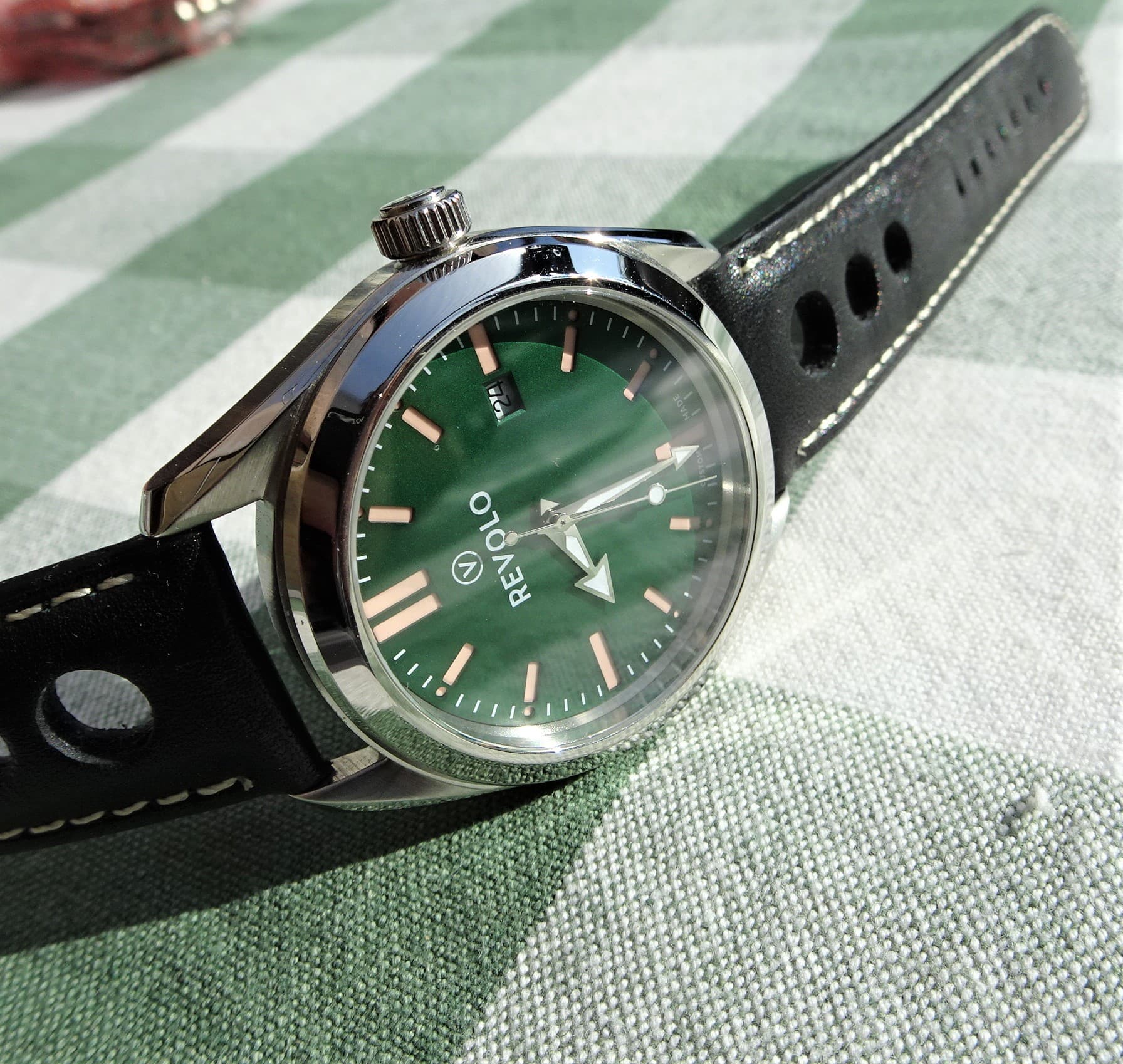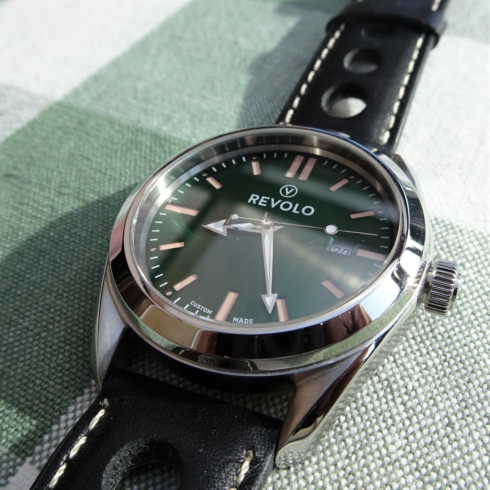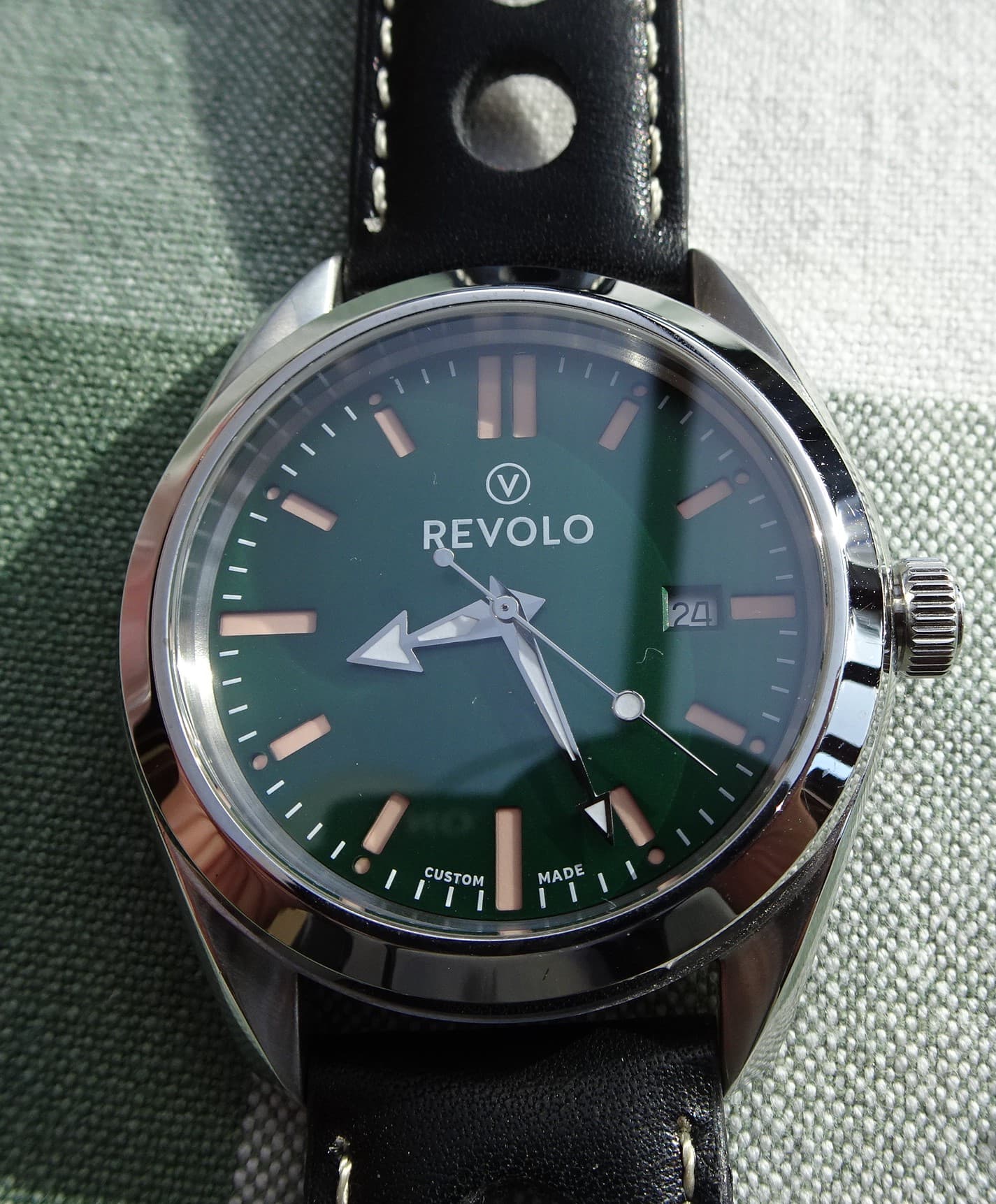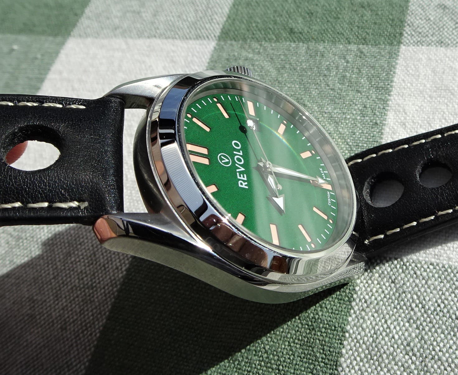 Revolo is een horloge-manufacture waar je je horloge naar je eigen smaak (kast, wijzerplaat, wijzers, binnenwerk, bandje) kan laten samenstellen. Dit horloge bezit een Zwitsers Ronda 515 binnenwerk, en heeft een diameter van 42mm, heeft een spectaculaire groene ‘sunburst’ en “sandwich” wijzerplaat, en donkergroene lederen bandje met prachtige Revolo sluiting. Het kostte 275€. Is nooit gedragen. Net nieuwe batterij geplaatst.