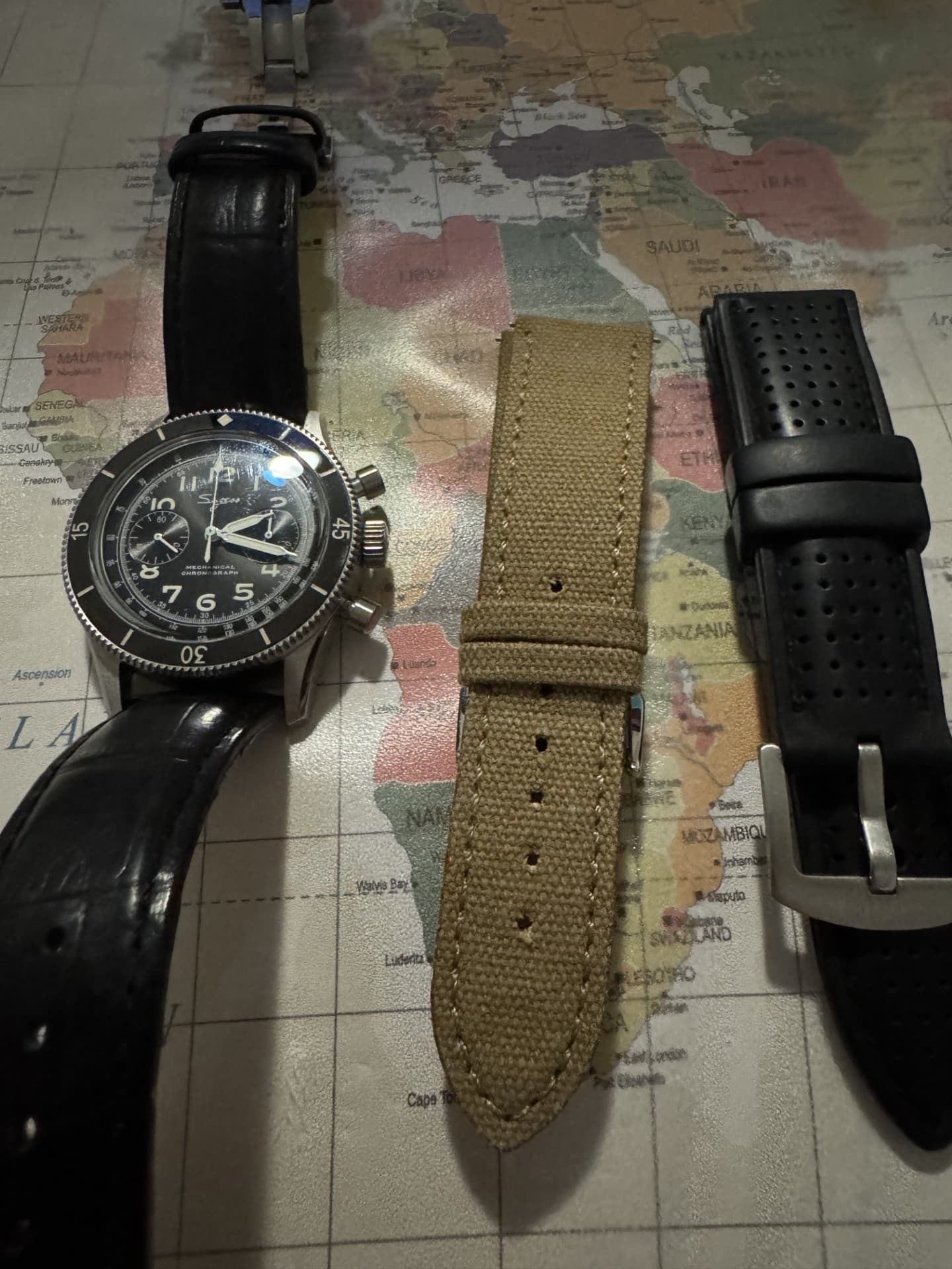 Originele doos en/of eventuele accessoires: origineel doosje is heb ik niet. Komt in generiek doosje. Canvas bandje, zwart lederen bandje en rubberen tropic.
