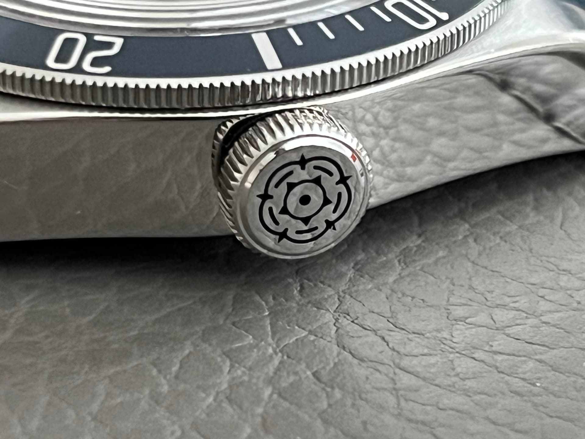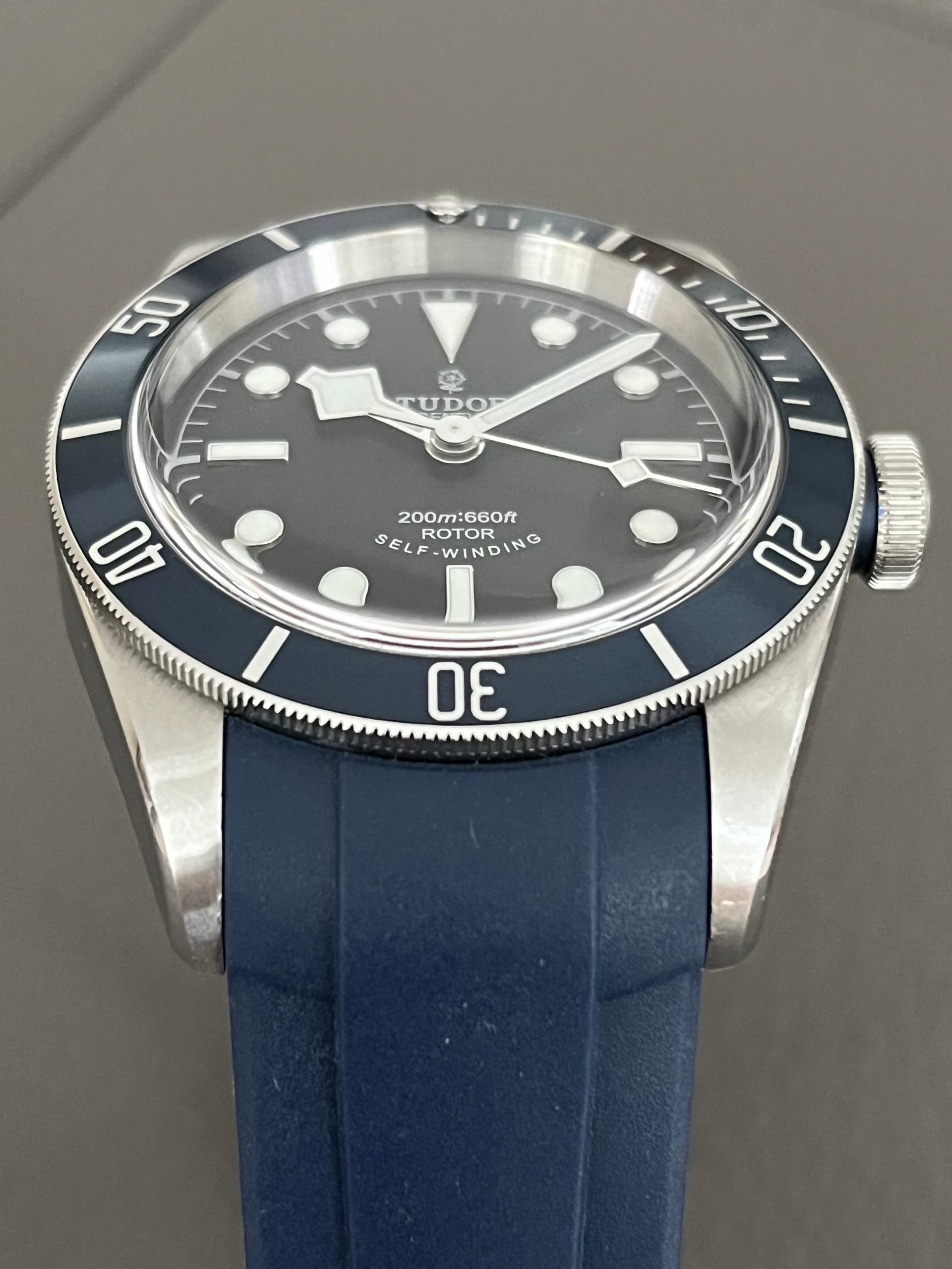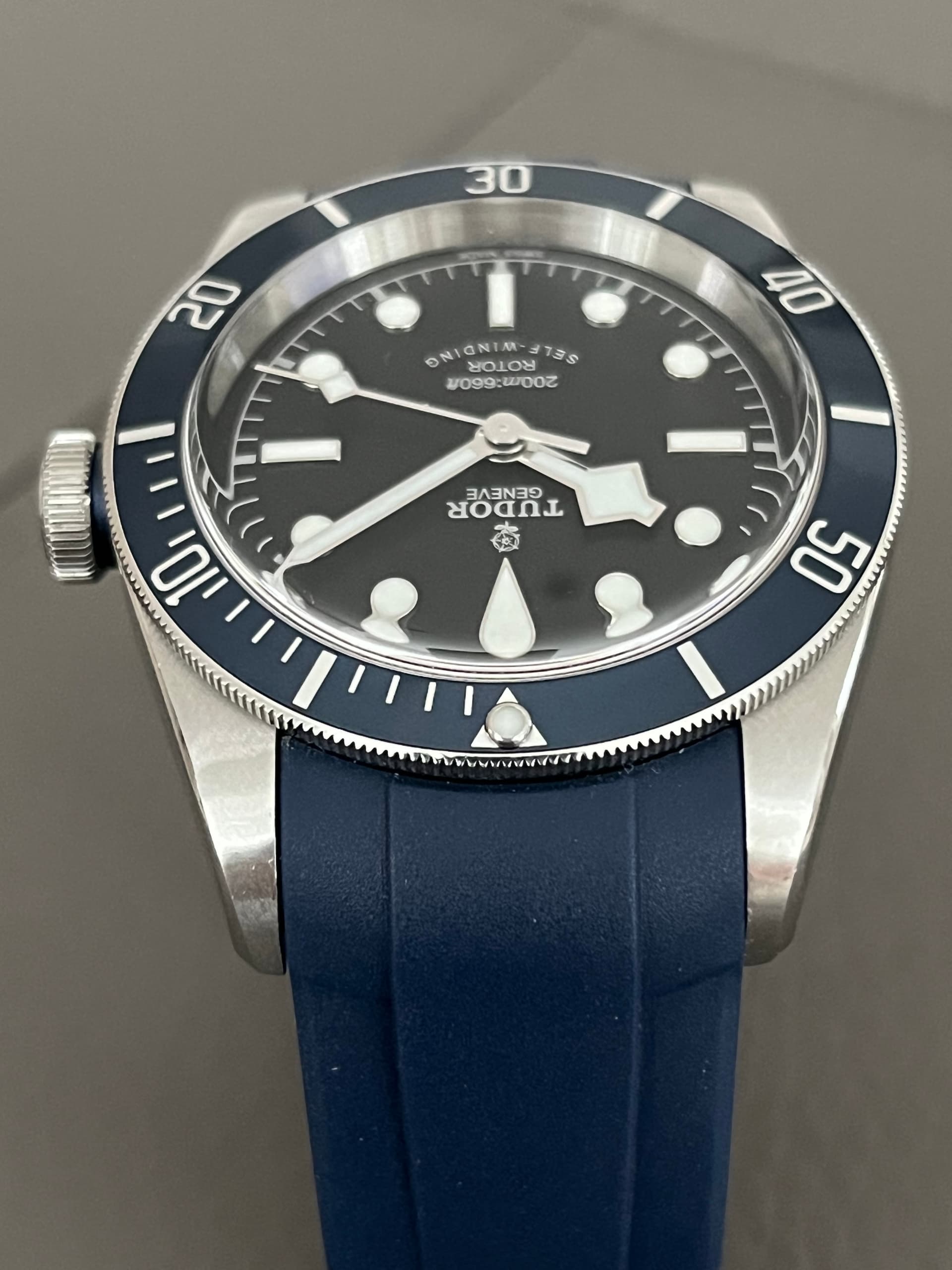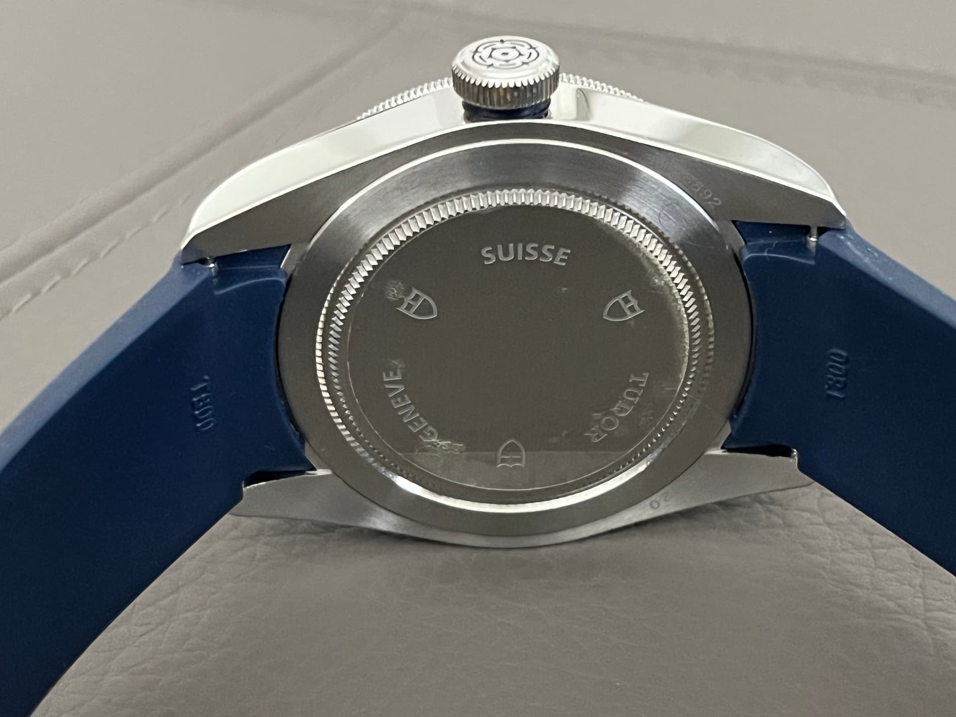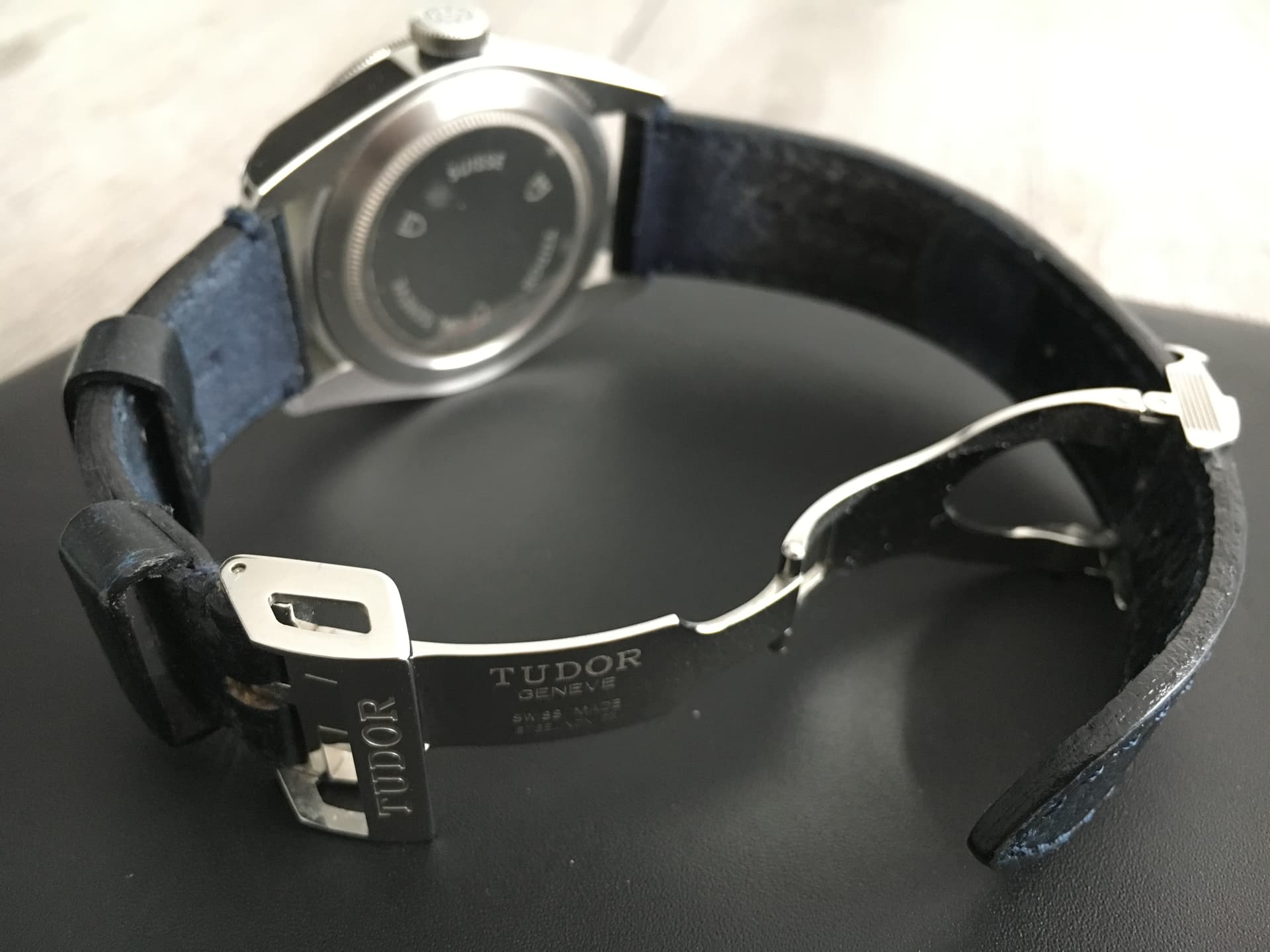 band: donkerblauw leder (origineel Tudor) en RVS vouwsluiting (origineel Tudor), vouwsluiting is vrij van deskdives; de afgebeelde/gemonteerde band is een aftermarket rubberen band van zeer goede kwaliteit, geschikt voor de originele Tudor vouwsluiting