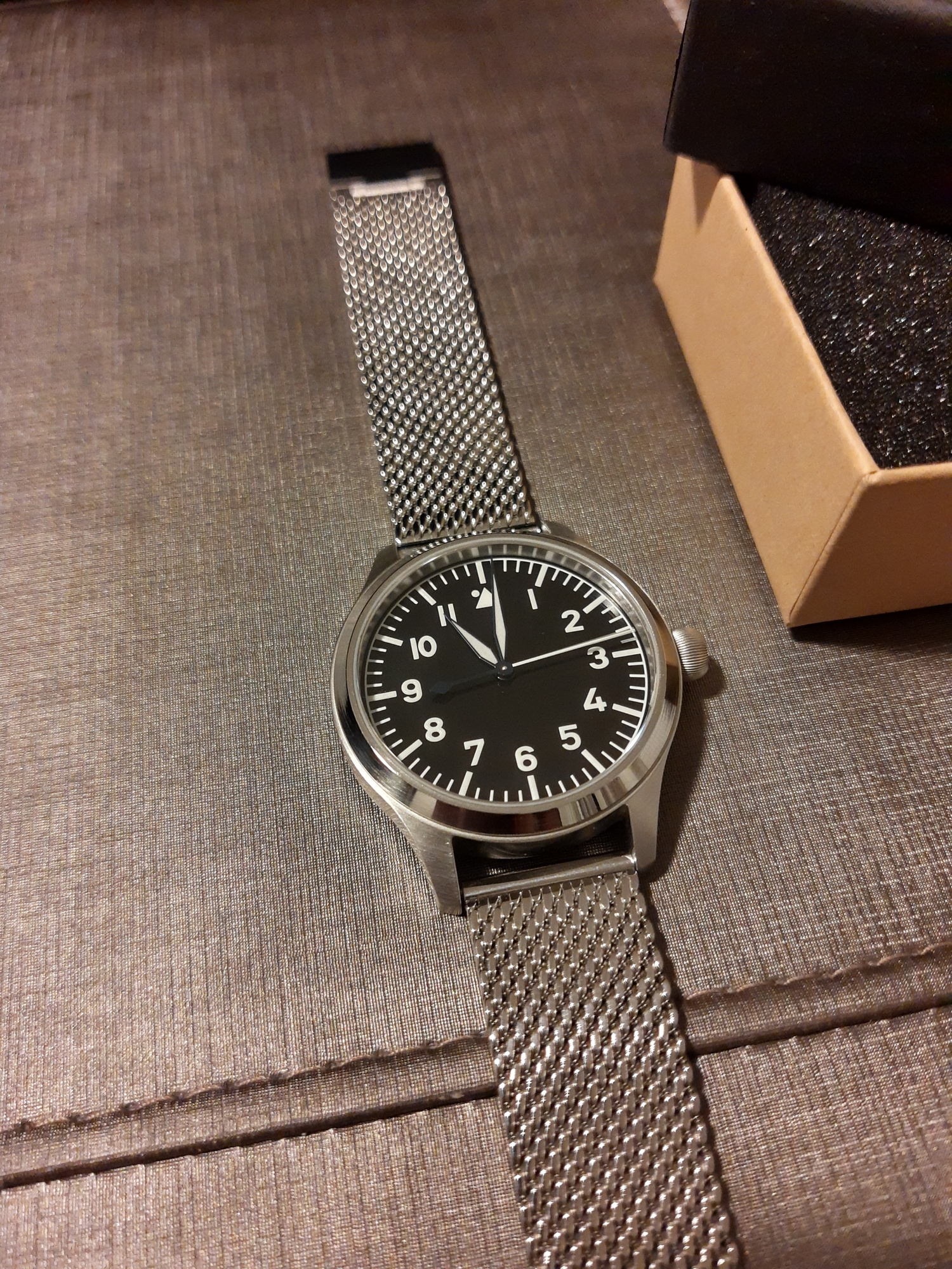 Originele doos en/of eventuele accessoires: Originele doos. Bijzonder fraai horloge, vlak safier glas, nette afgewerkte kast, milsnese band met safety clasp en tot slot WR: 300 m. En dat voor een flieger.