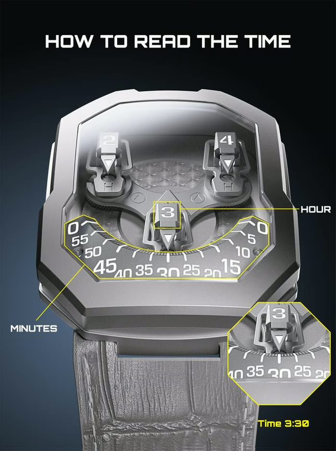 · Grade 5 titanium arm, geanodiseerde aluminium roterende gepatenteerde piramides en een wijzerplaat met visschubpatroon, Swiss Super-Luminova™ gecoate cijfers op de halfronde minutenring, en roterende piramides
