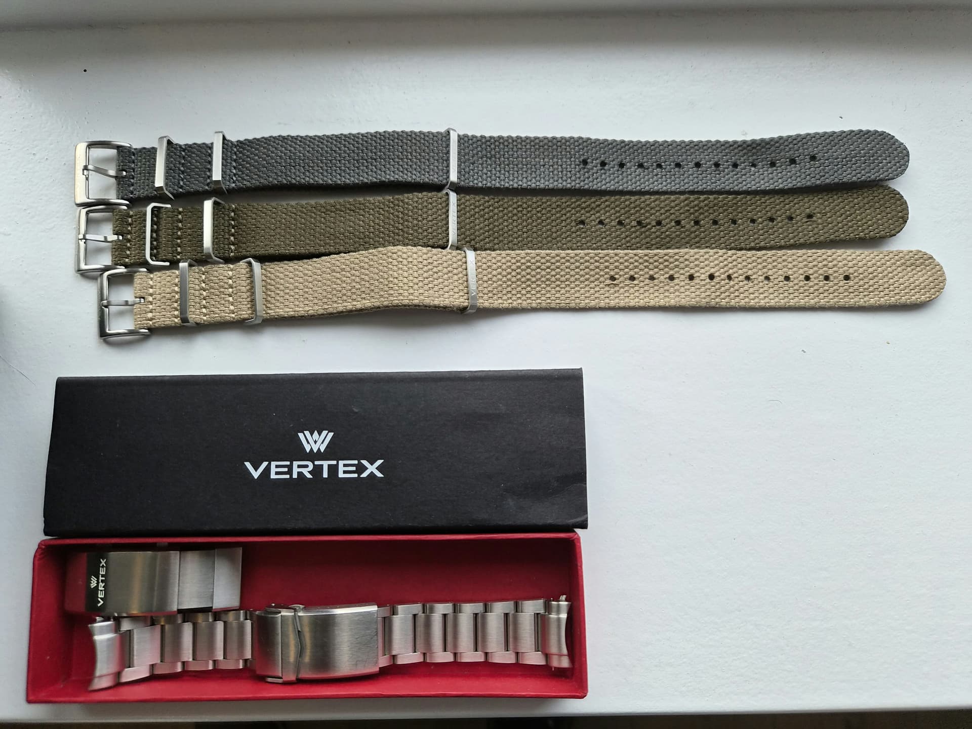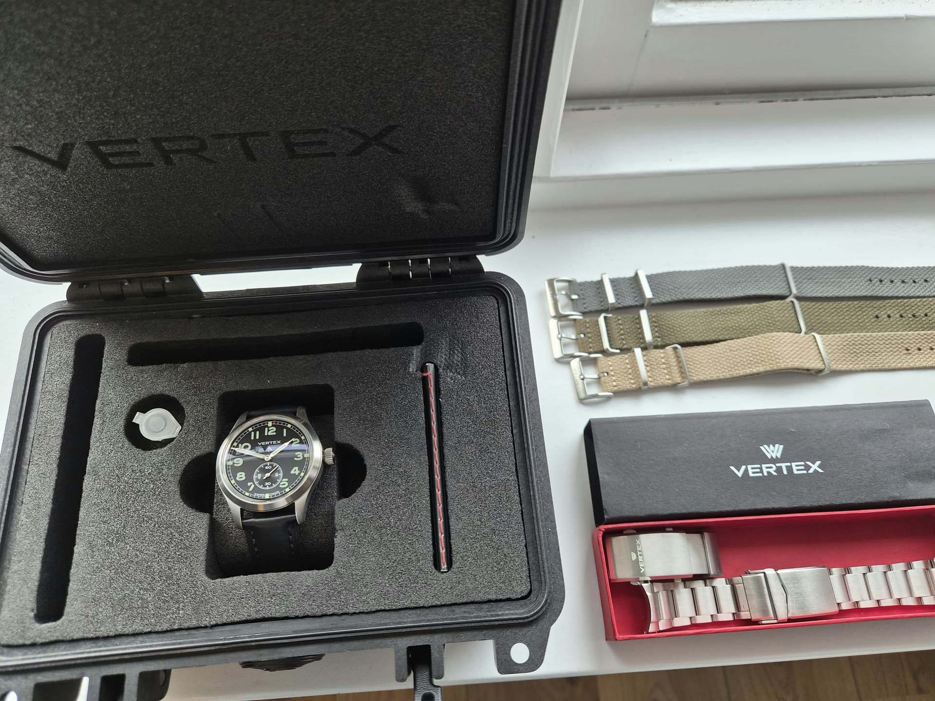 Het horloge komt compleet met 3x vertex nato (nagenoeg nieuw), origineel zwarte lederen band (netjes, gebruikt) en de stalen band. Deze laatste heeft een een andere sluiting omdat de vorige eigenaar de originele sluiting te groot vond. Originele sluiting wordt uiteraard meegeleverd en is makkelijk weer te installeren.