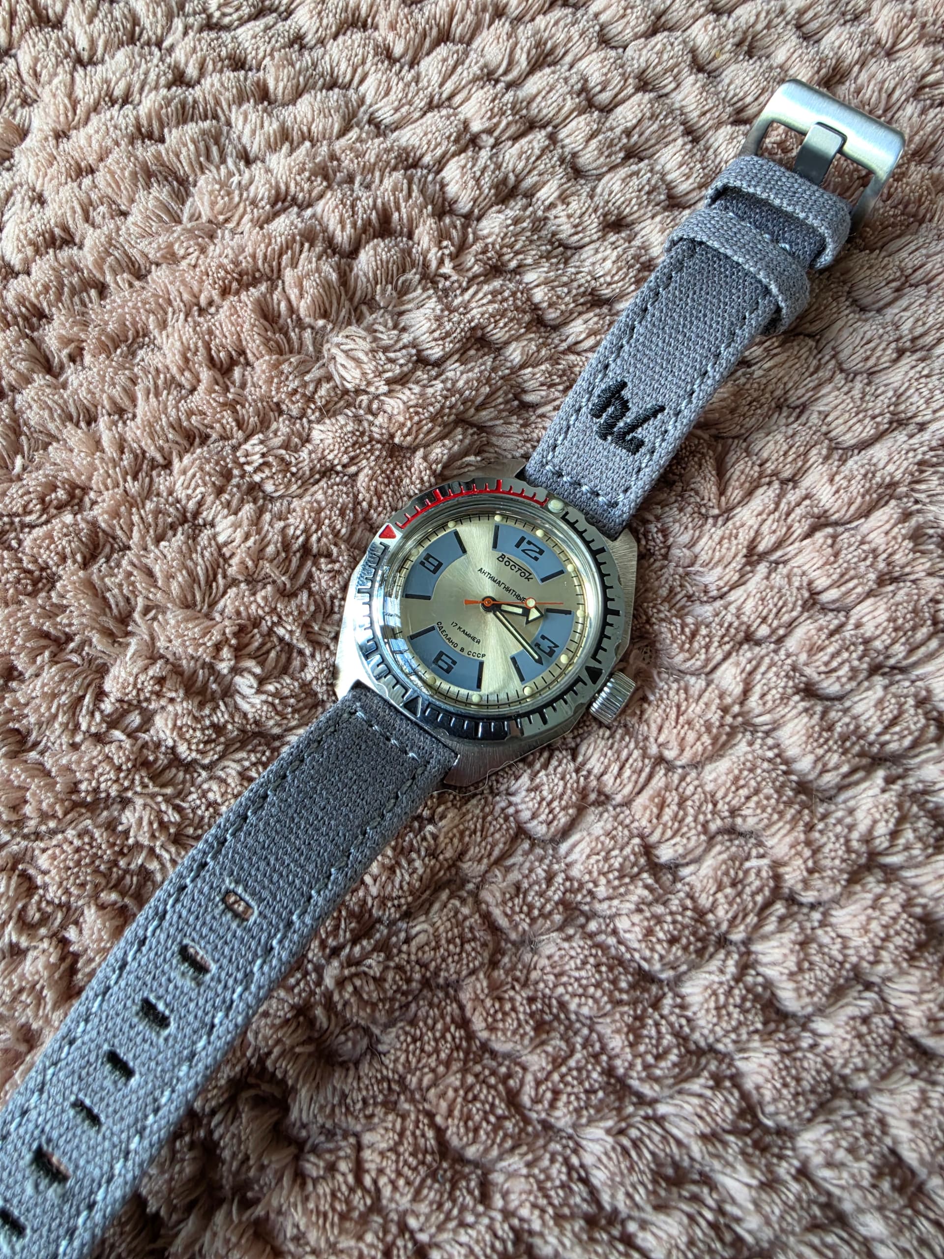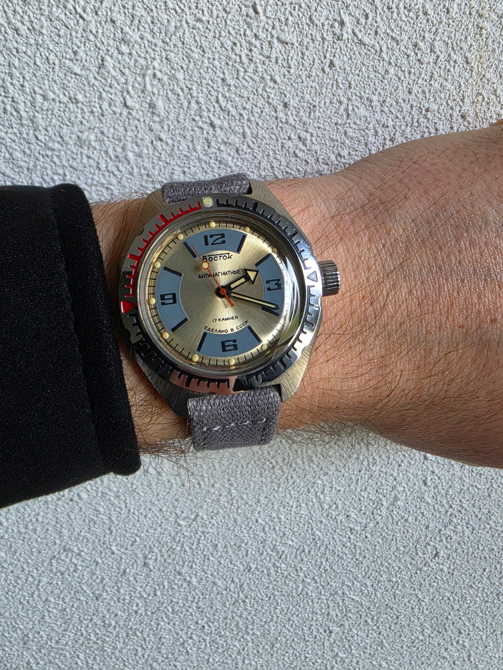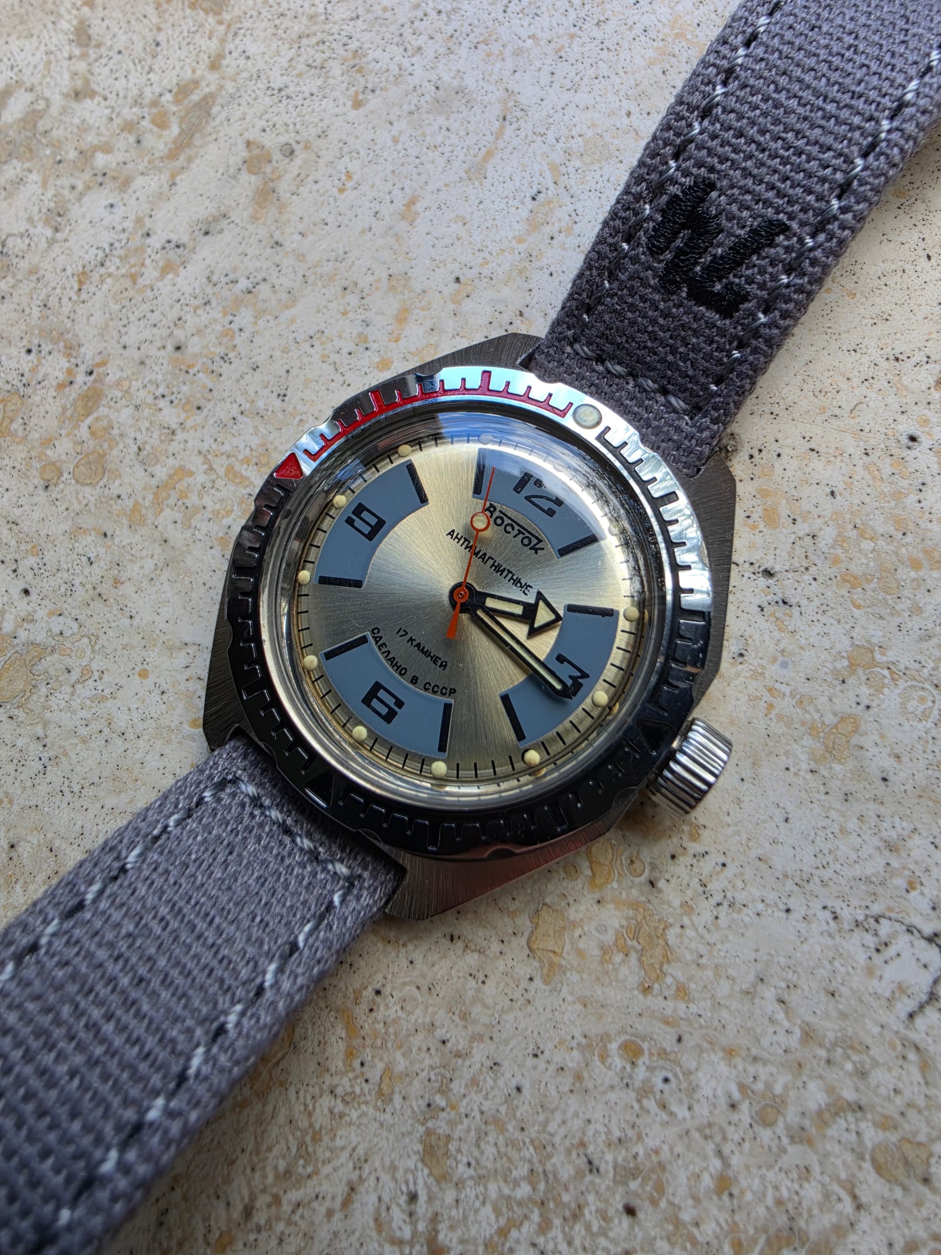 Deze zeer nette Vostok, prachtige onaangetaste sunburst zilveren wijzerplaat met geweldig mooi vanille verkleurde tritium lume op zowel wijzerplaat als wijzers.