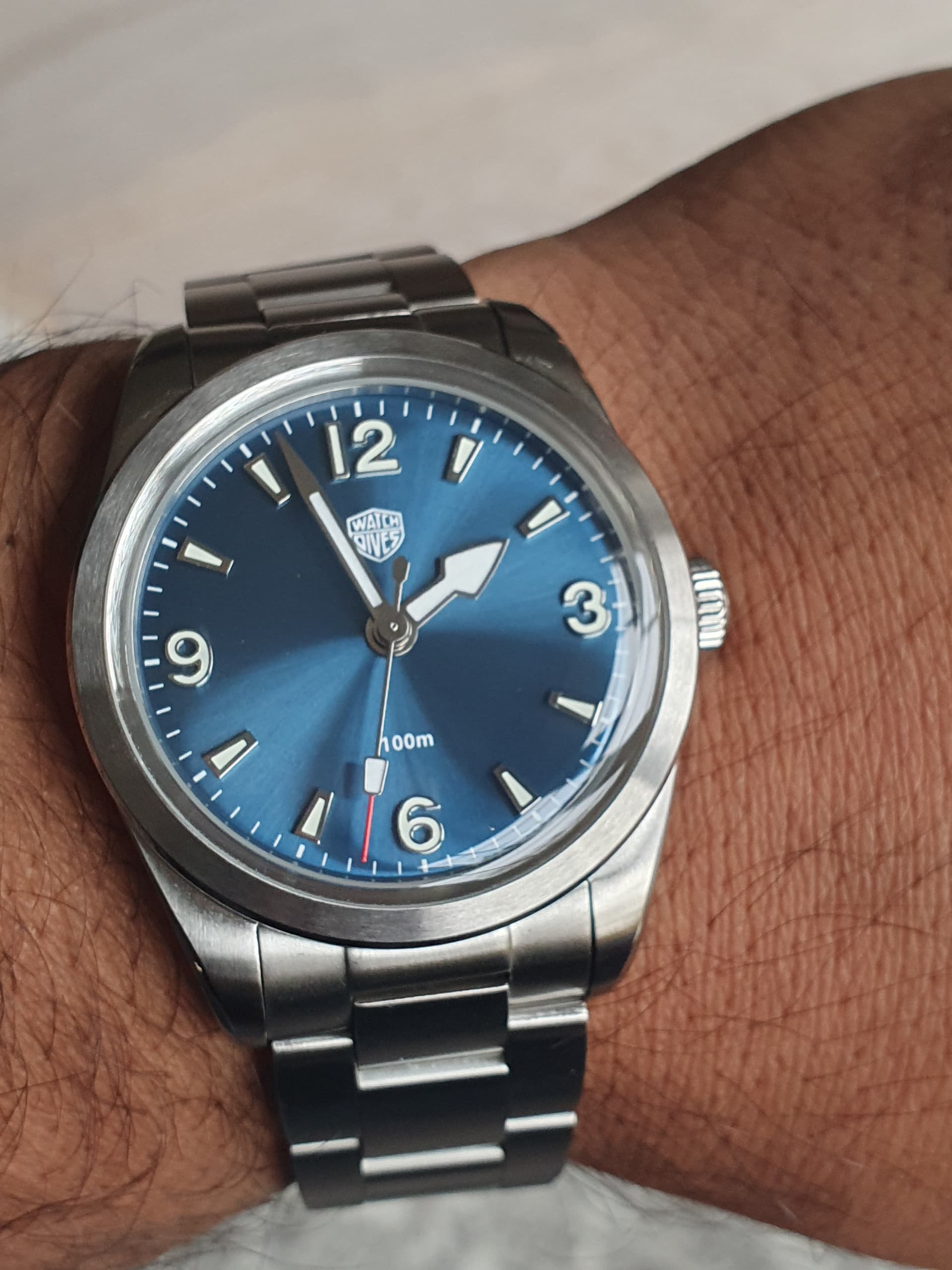 Te koop aangeboden: Watchdives WD1960S met prachtige blue sunburst dial en opgelegde indices. Het horloge is uitgerust met een Seiko VH31 Meca-Quartz uurwerk, dat bekend staat om zijn soepel lopende (smooth sweeping) secondewijzer, de uitstraling van een automatisch uurwerk met de nauwkeurigheid van quartz.