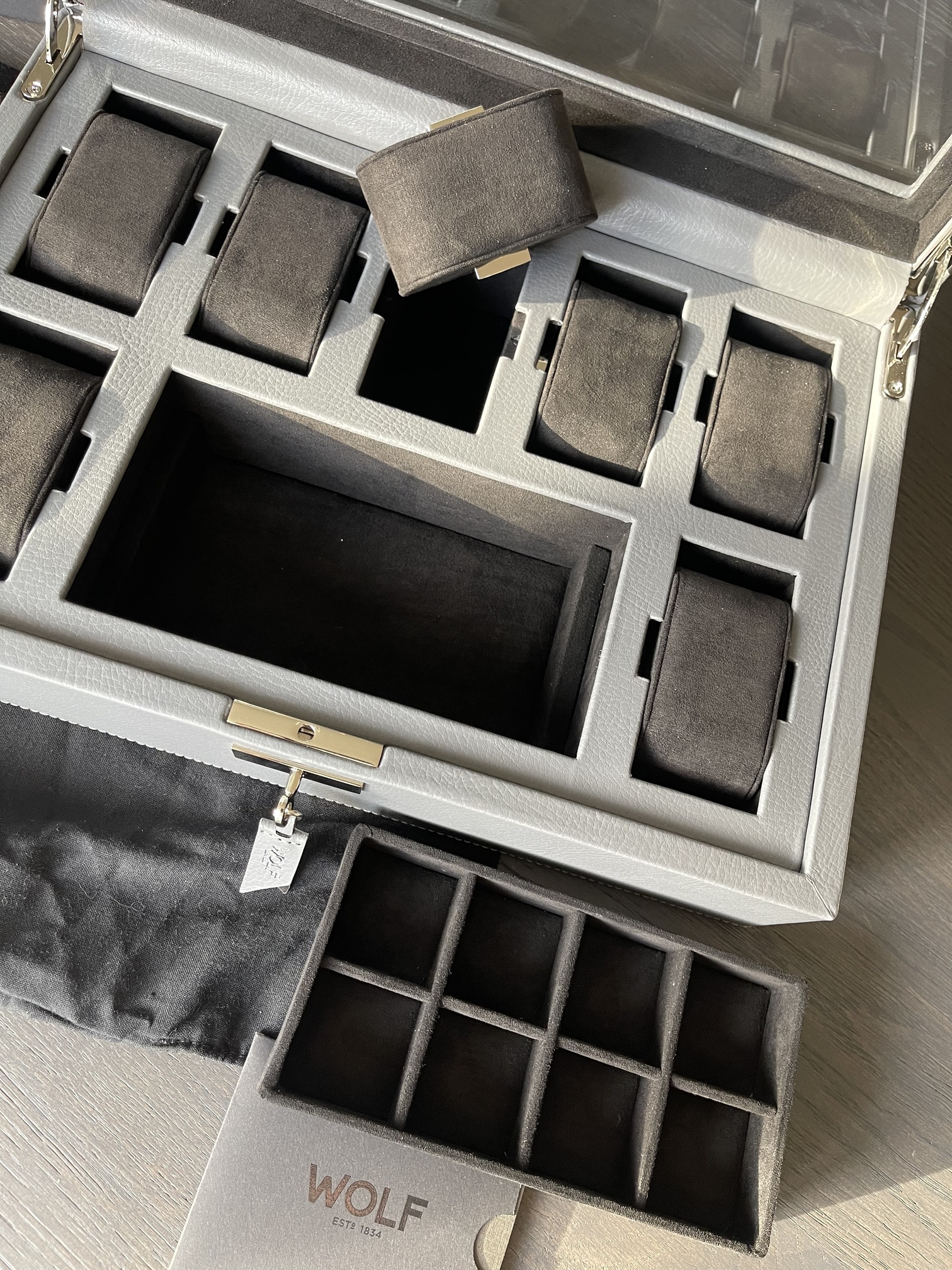 Nieuwprijs 369 euro (zie hier, ook voor stockphoto’s: Wolf 1834 Howard 7-Delige Horlogedoos grijs 465265 | Milikan Juwelier)