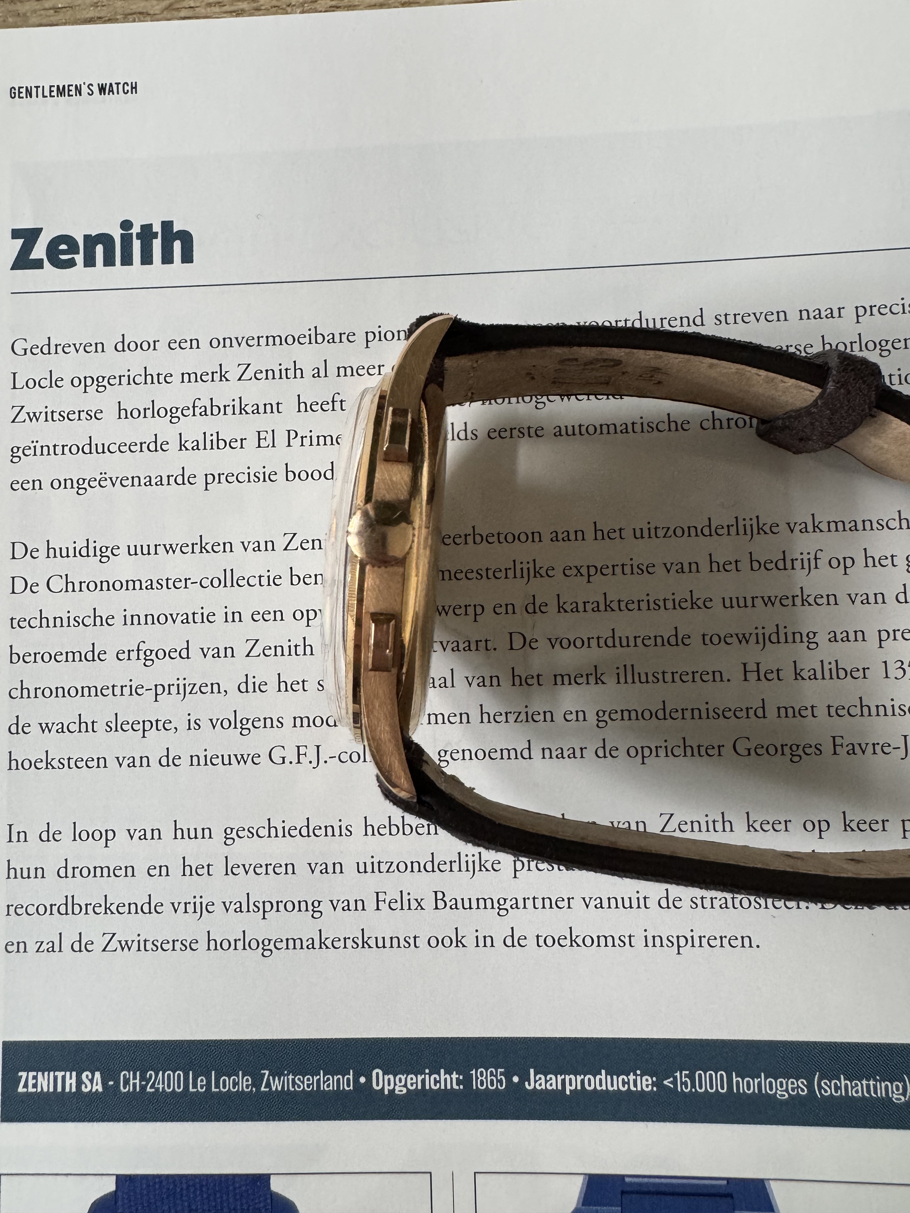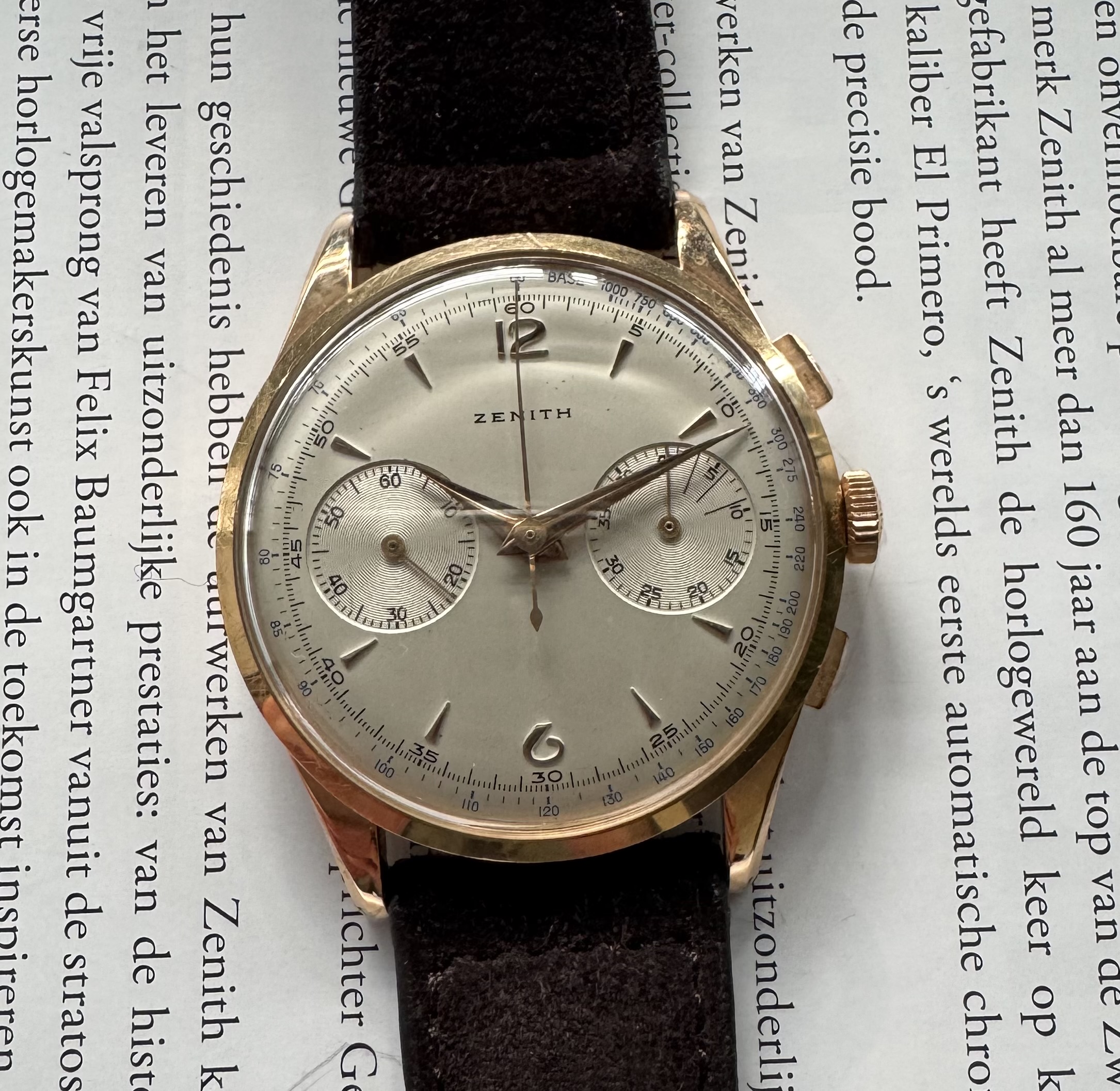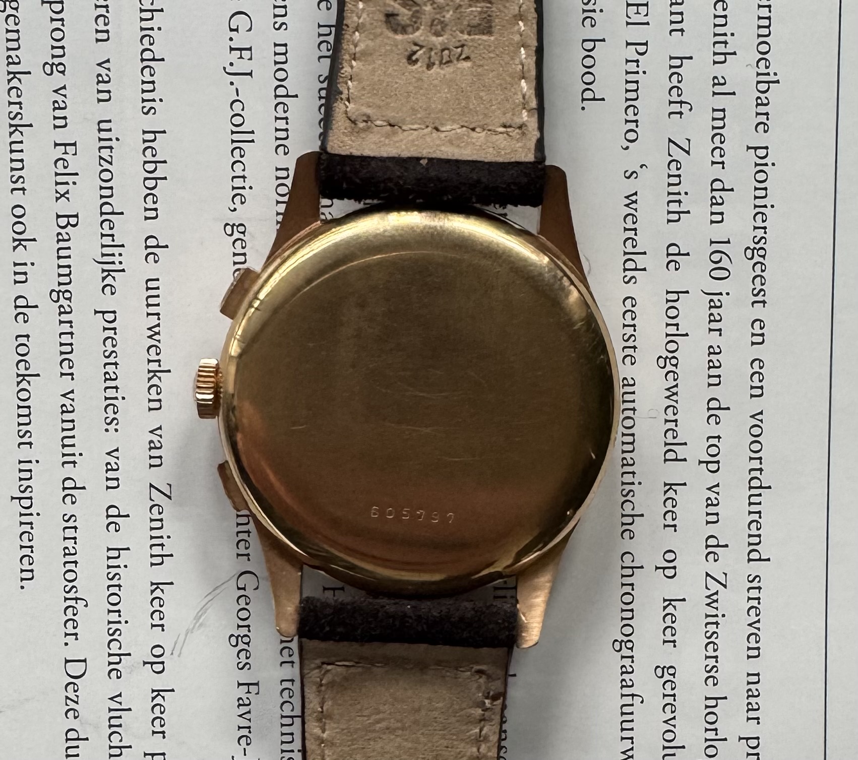 Wordt geleverd op een Bulang bruin suede bandje (kort) met een bijpassende Zenith gesp.