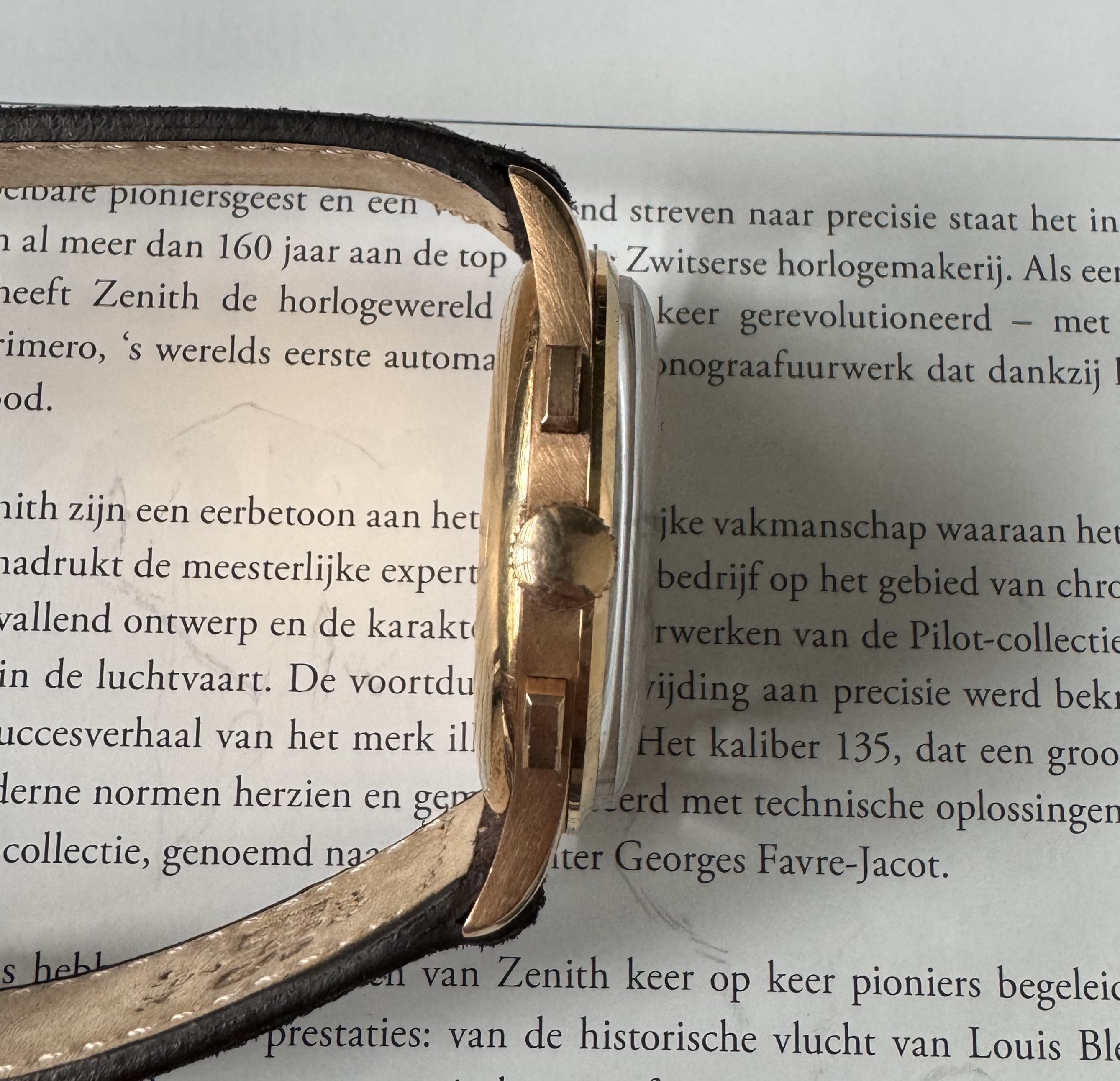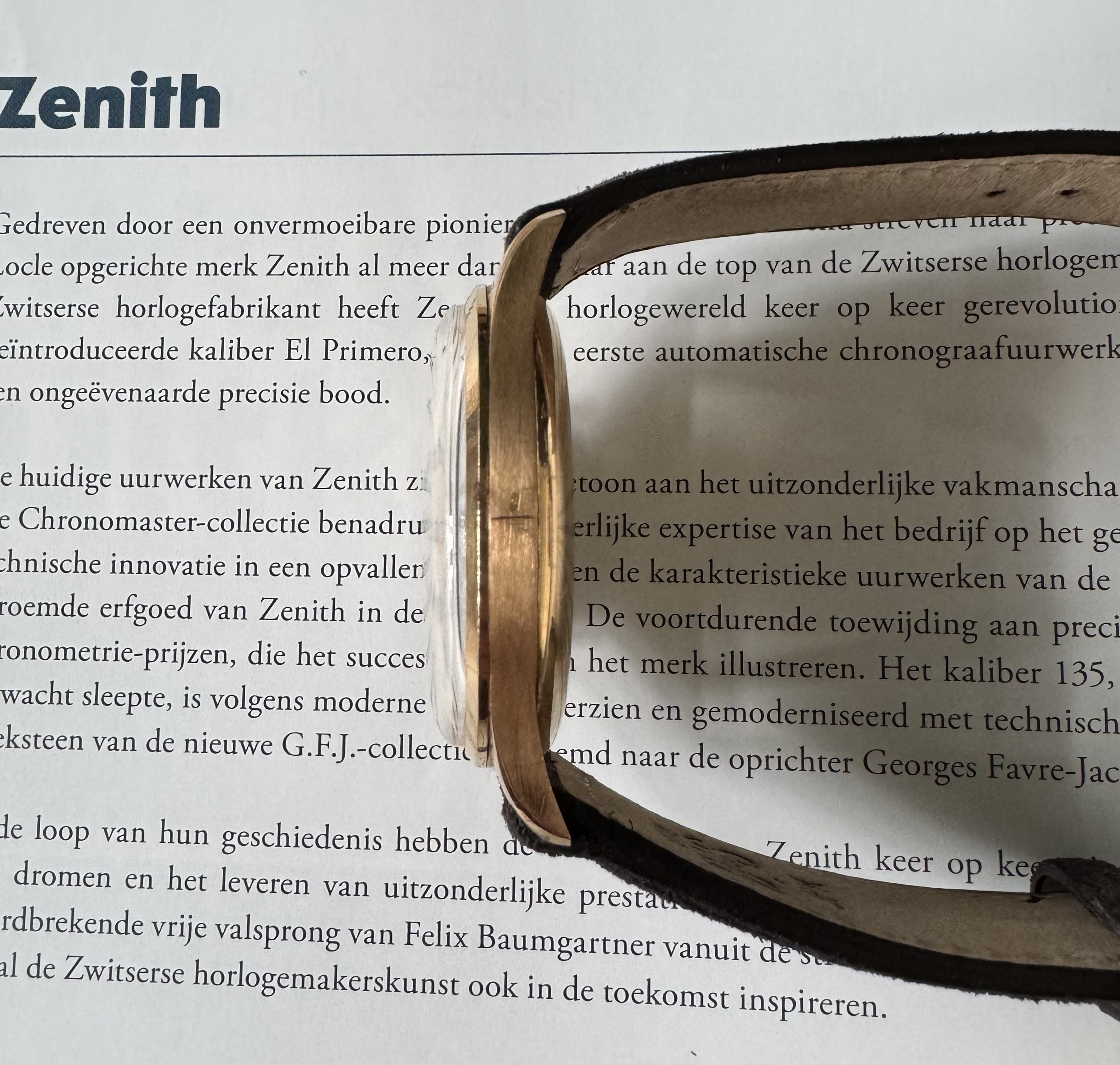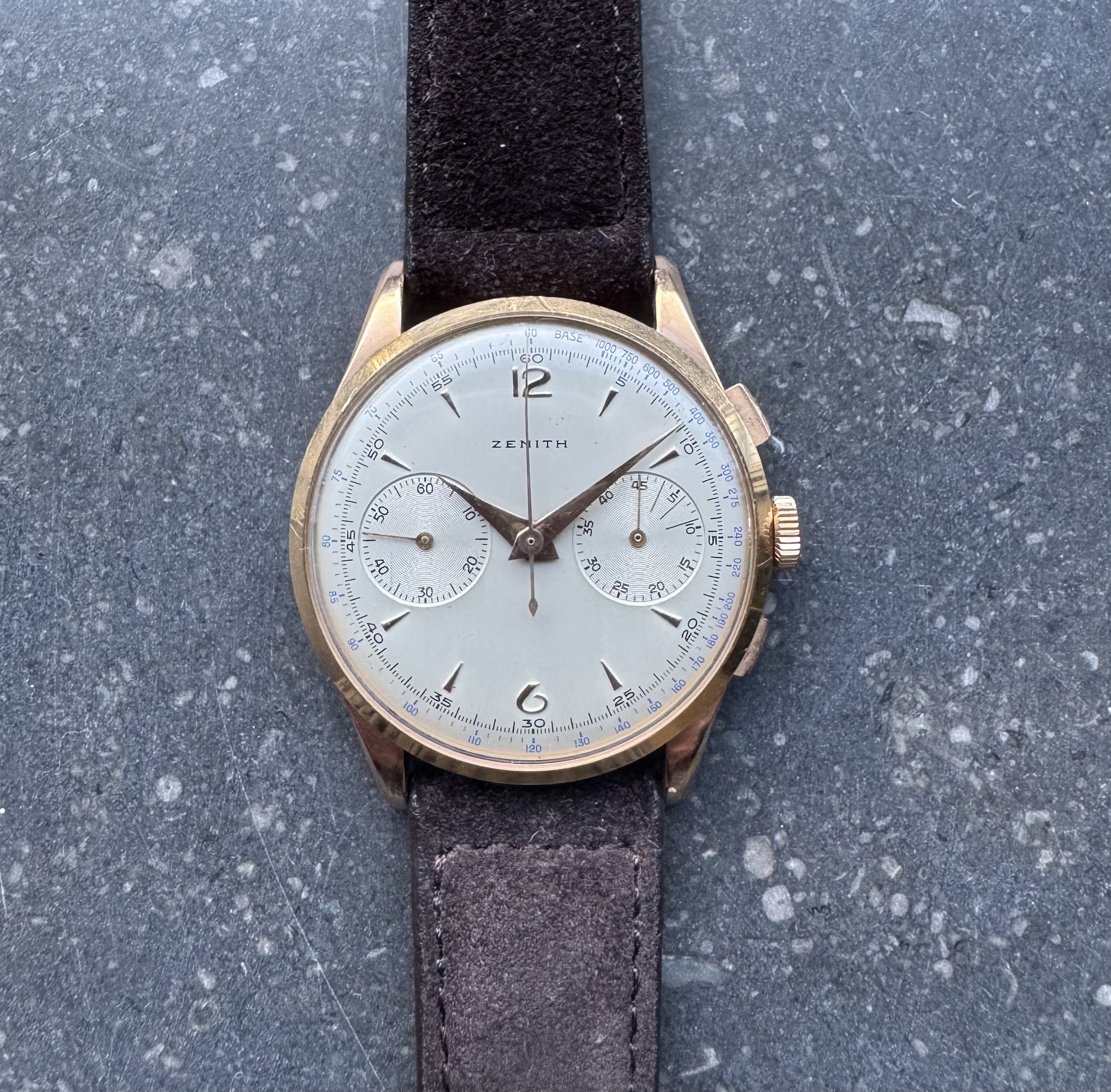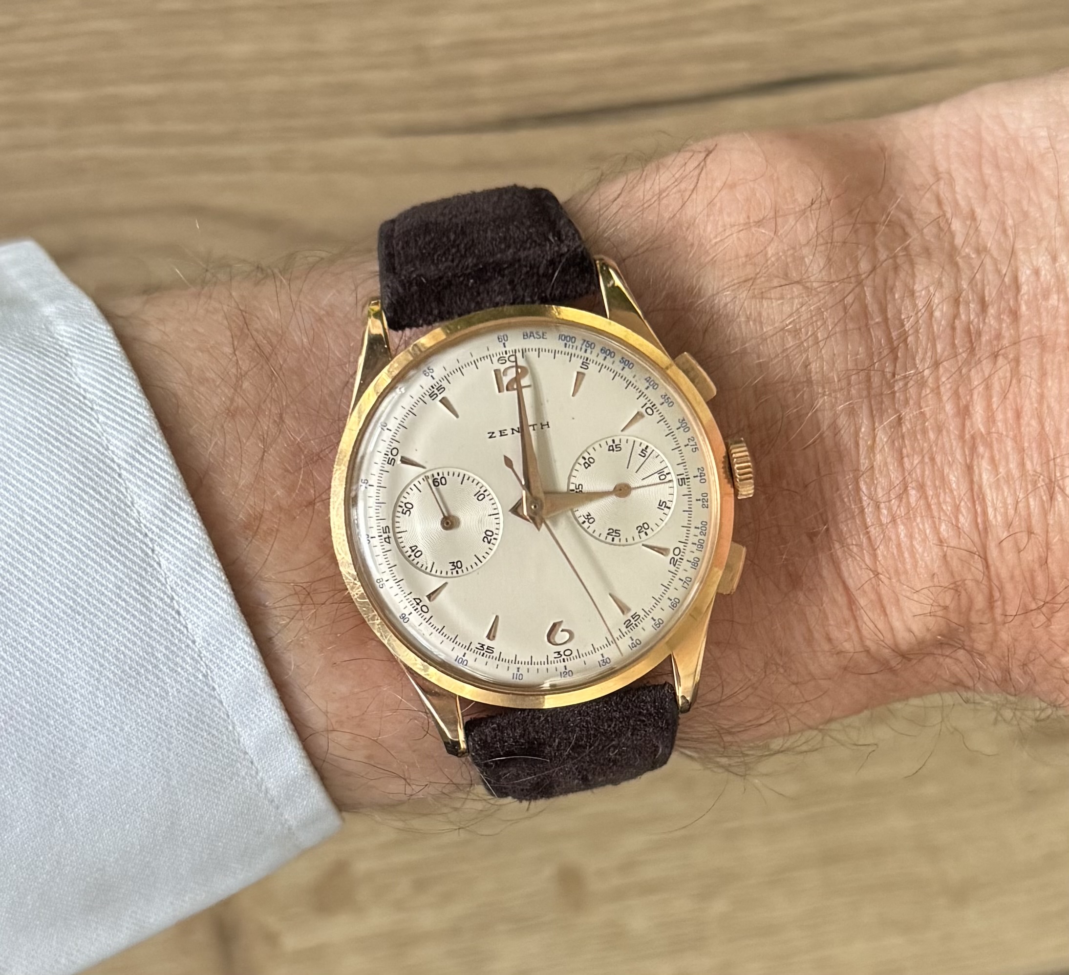 Wordt geleverd op een Bulang bruin suede bandje (kort) met een bijpassende Zenith gesp.