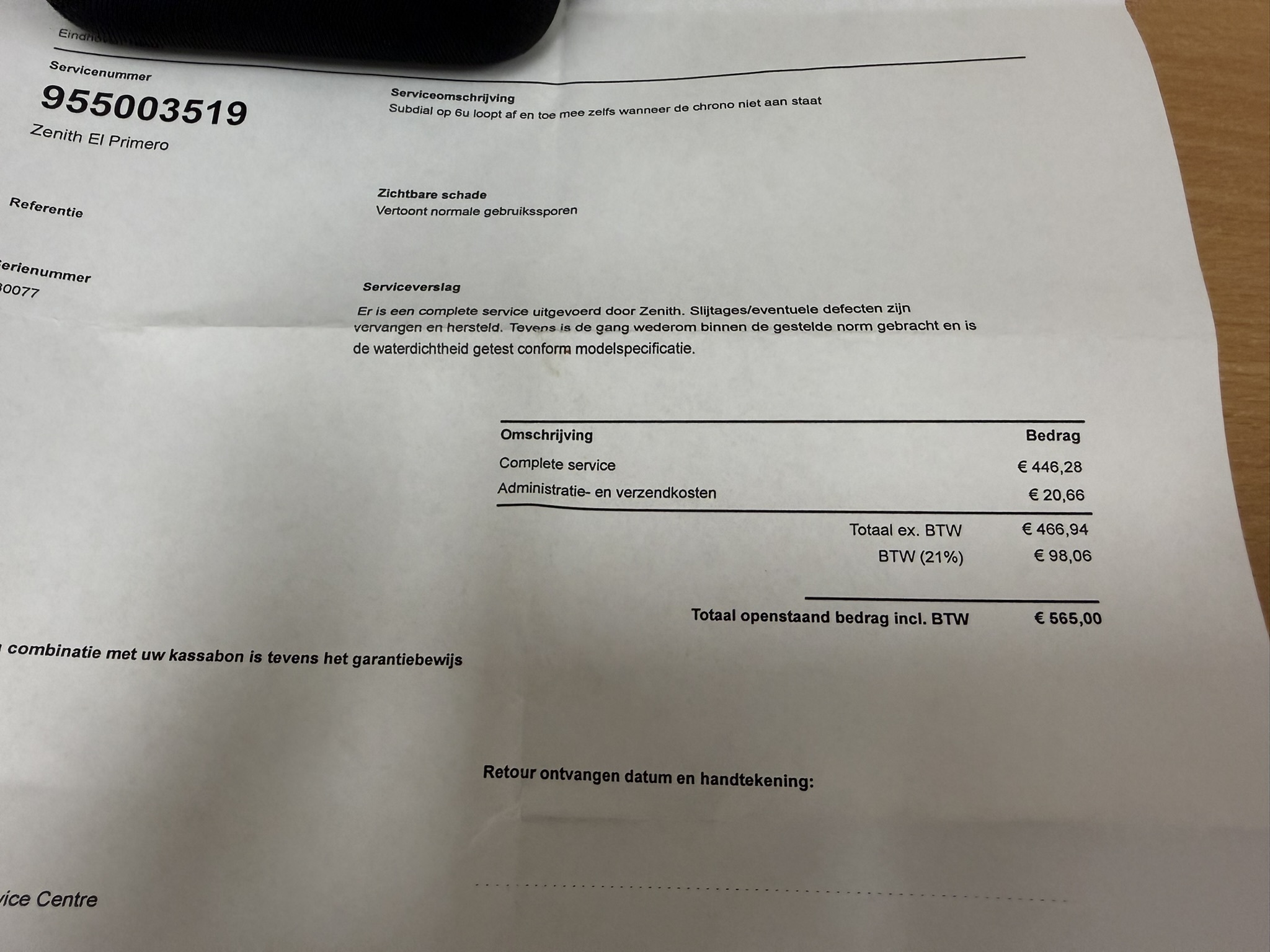 Volledige service door Zenith 11-11-2025 (vandaag opgehaald bij S&C) met 2 jaar garantie (twv € 565,00)