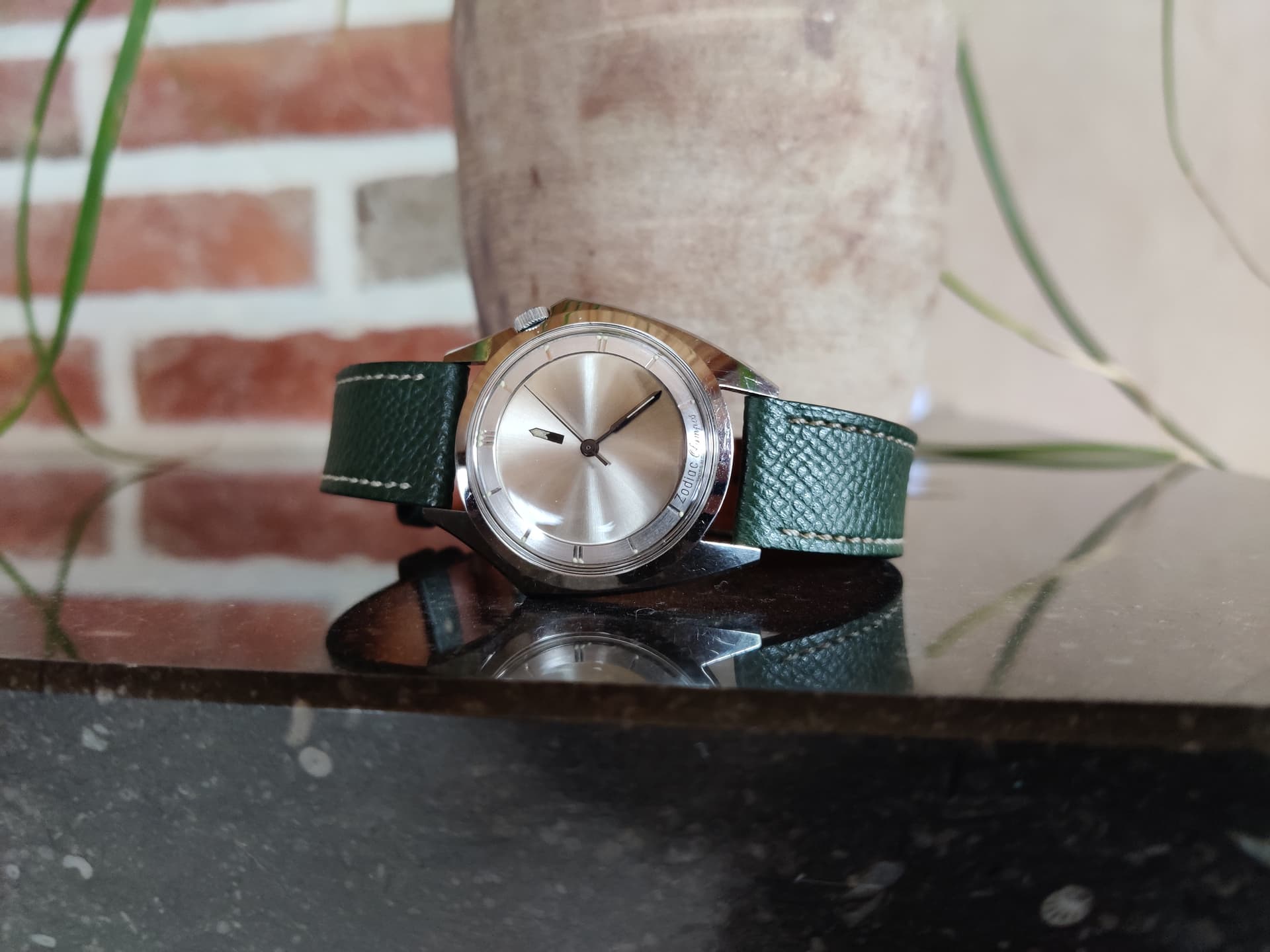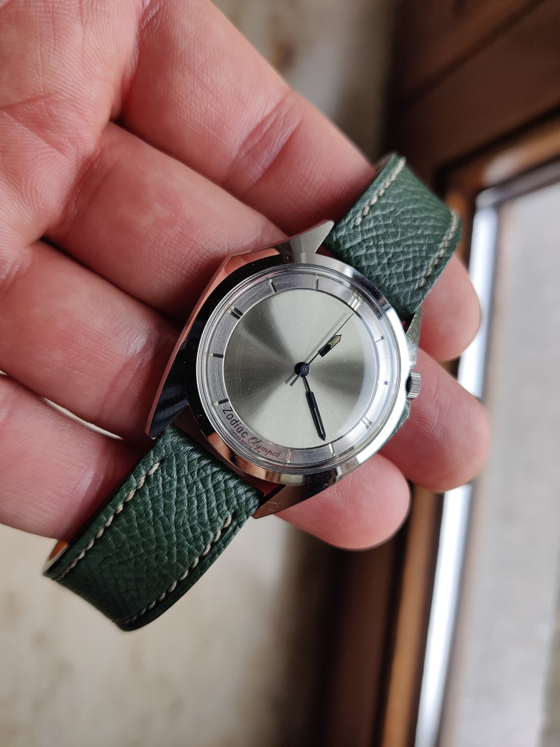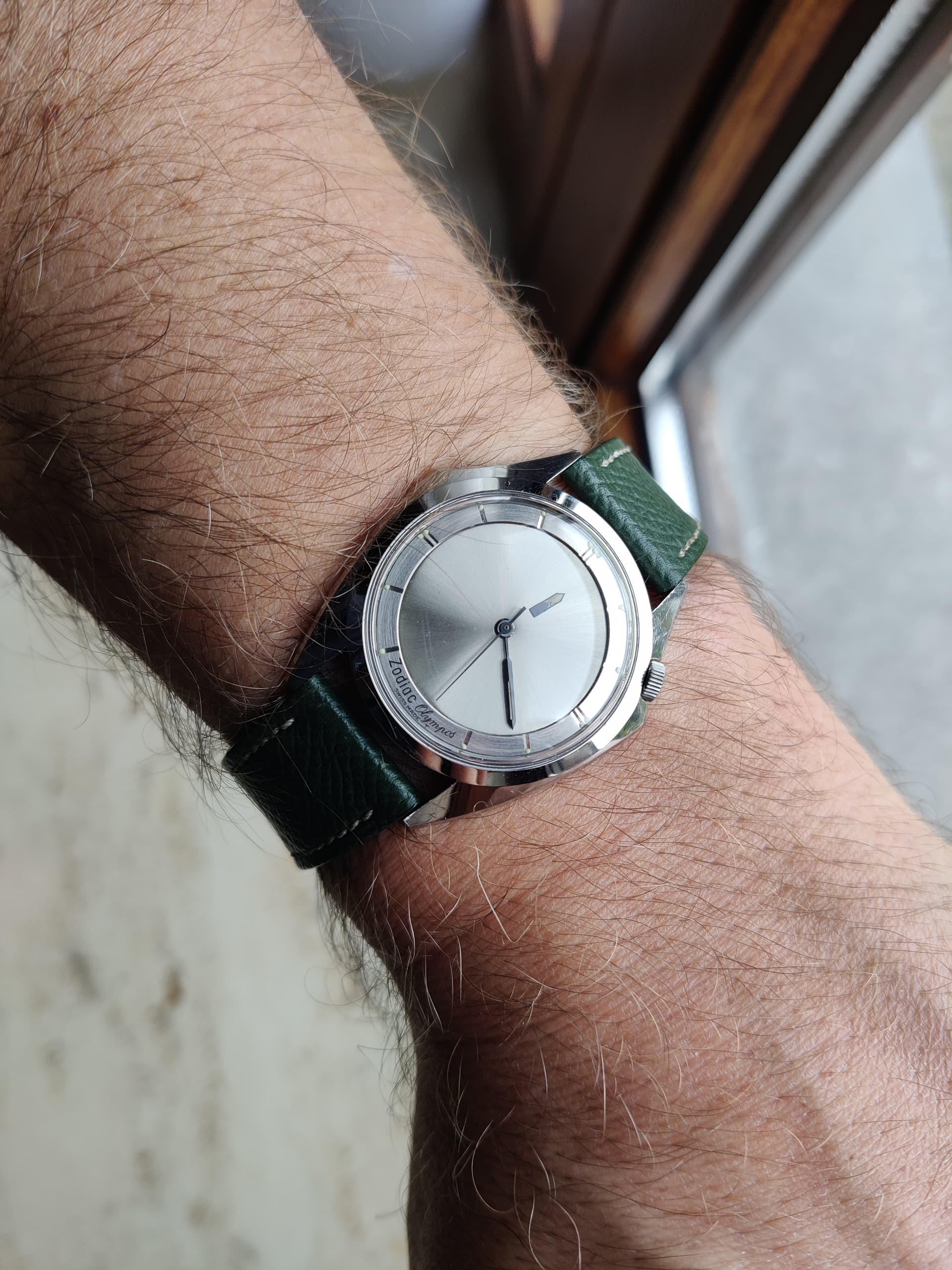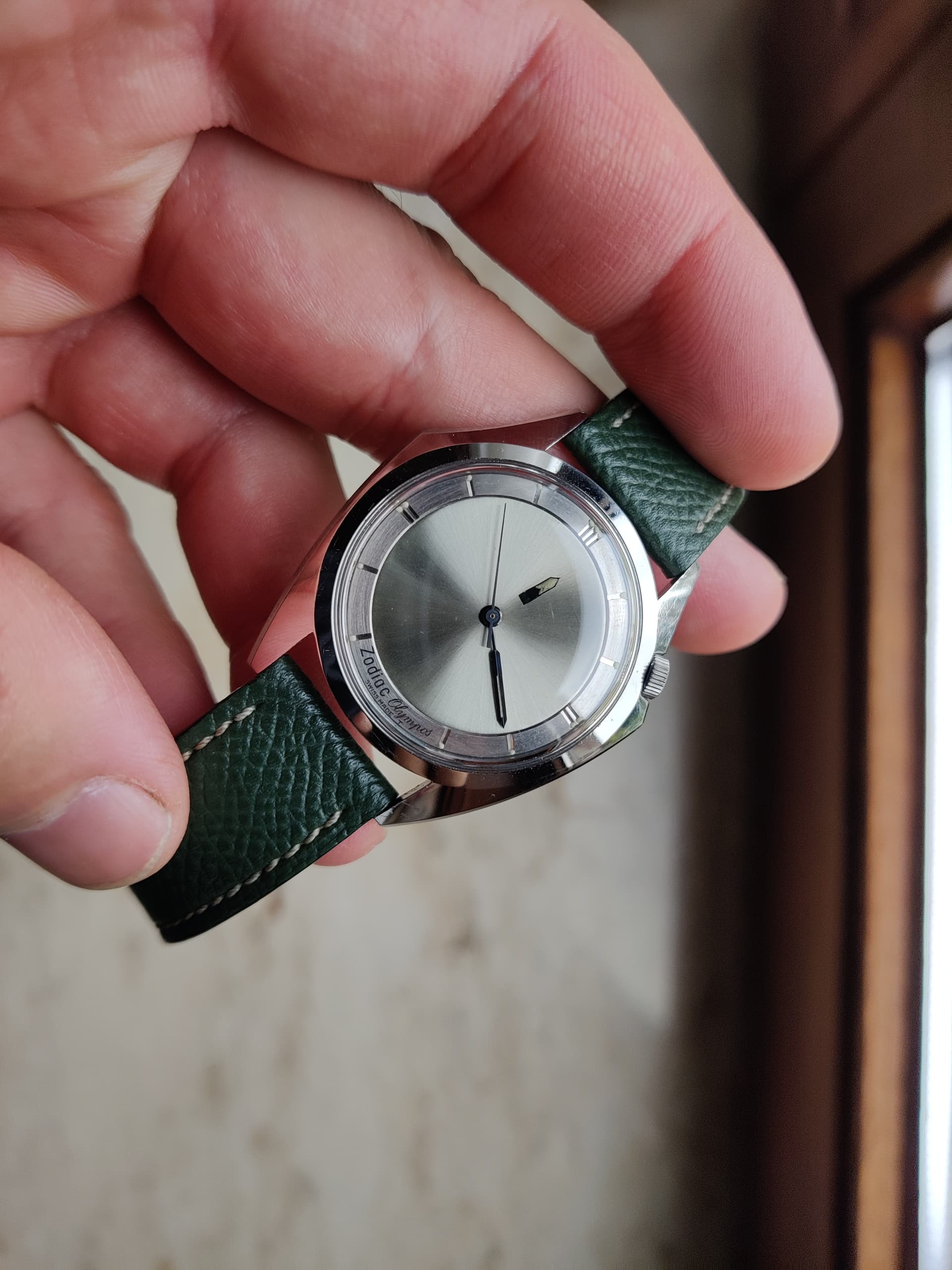 Ik dacht, ik gooi nog eens iets in het blauw. Deze keer deze prachtige vintage zodiac Olympos mystery dial. Het horloge heeft vorig jaar een wellness kuur gekregen bij de bokx in Gent. Het is te zeggen, nieuw glaasje en het caliber zelf is helemaal uit elkaar gehaald en weer gemonteerd geweest. Met andere woorden aan de scherpe lijnen van de kast, en aan de staat van de wijzerplaat/wijzers is niks gebeurd. Ik ben het soort verzamelaar die liever een kras dan een ronde hoek ziet, dus geen polijsten tijdens mijn regeerperiode