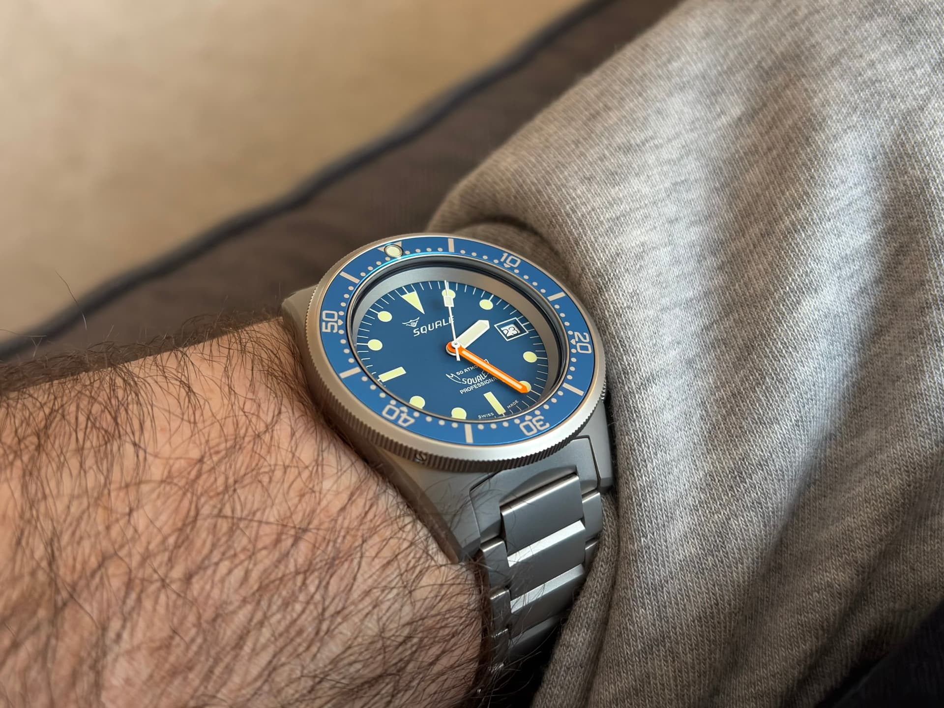 - Merk en model: Squale 1521 Blue Blasted op stalen band