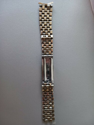Het is een vergulde band die maximaal gebruikt is. Hier en daar is de kleur er dus af gesleten. Verder werd het horloge echt voor alles gebruikt en in de band zit ook nog een onbekende 2 componenten lijm. ( 1cm2 tussen de schakels )