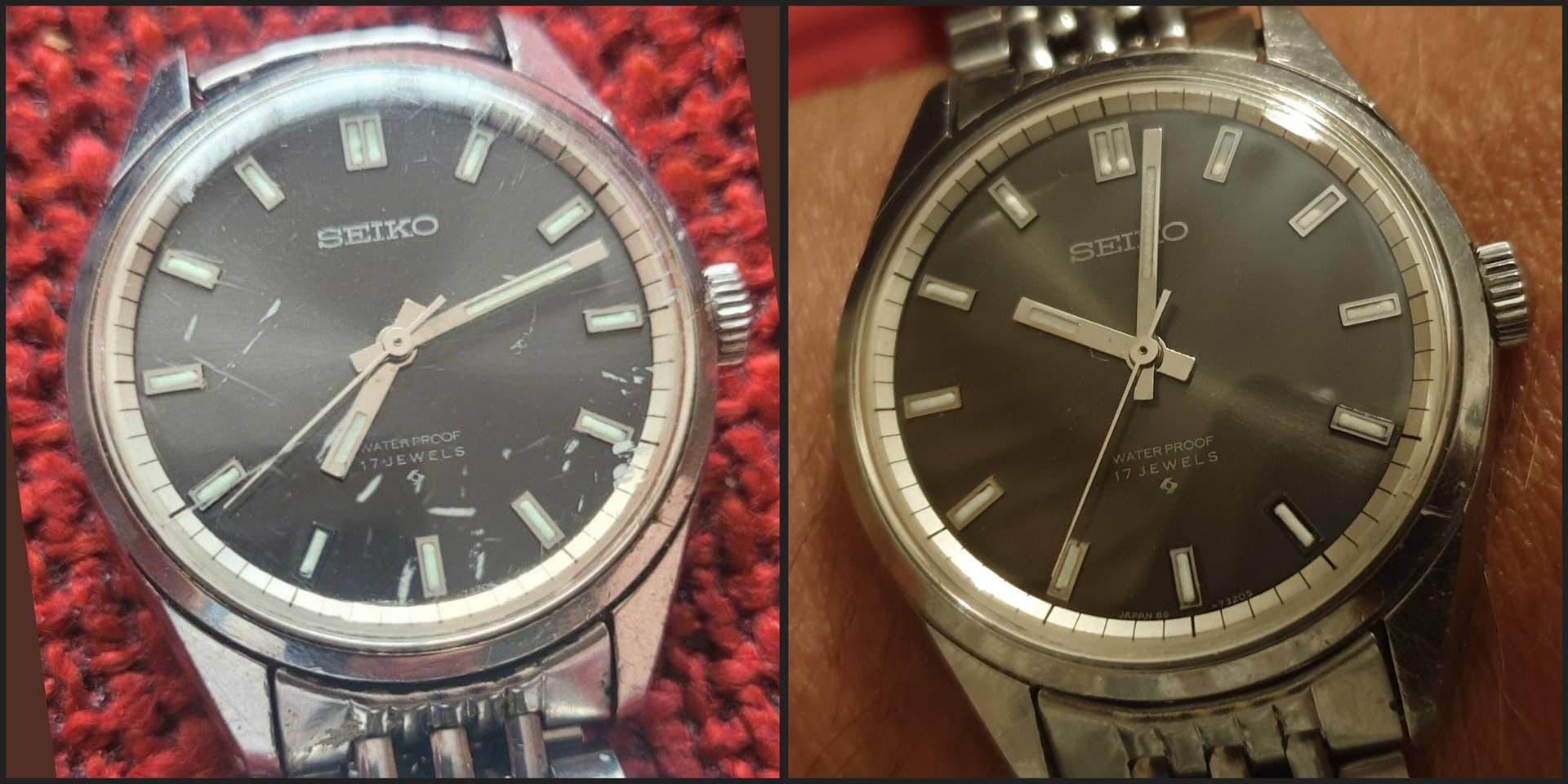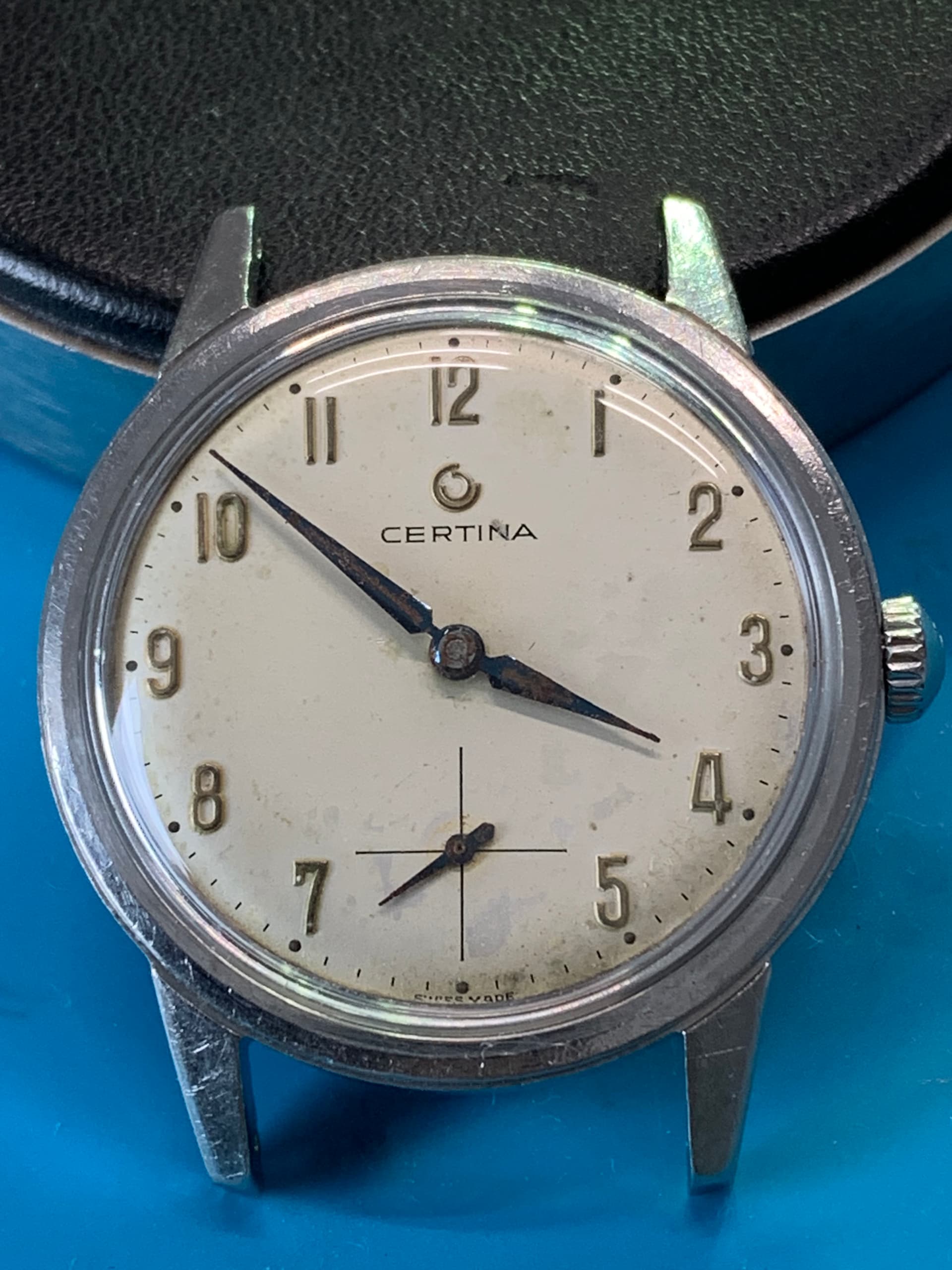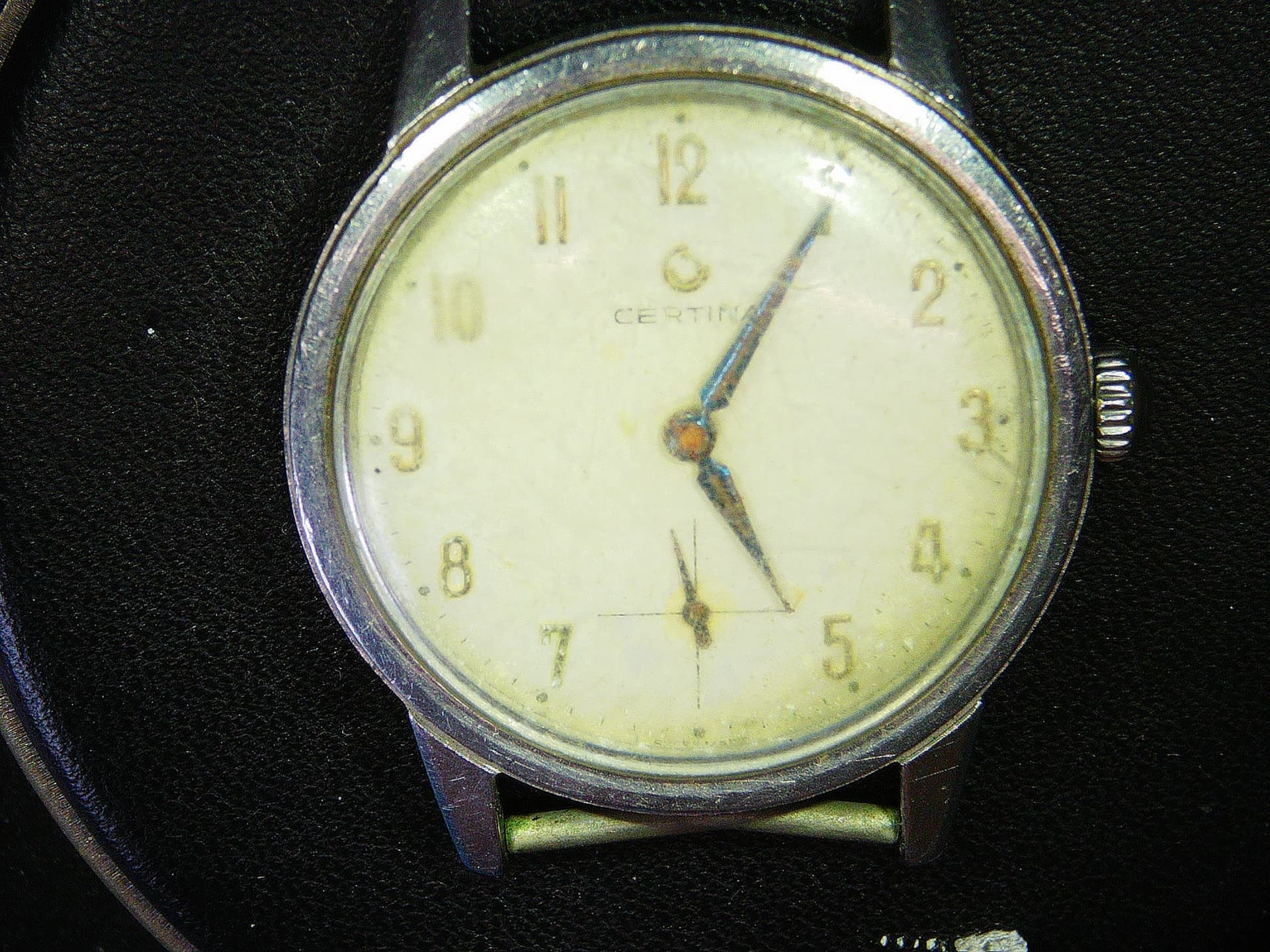 Zat vochtschade in het horloge. Roest aan de minutenpijp, urenrad en wijzers. Glaasje was helemaal dof van de krassen.