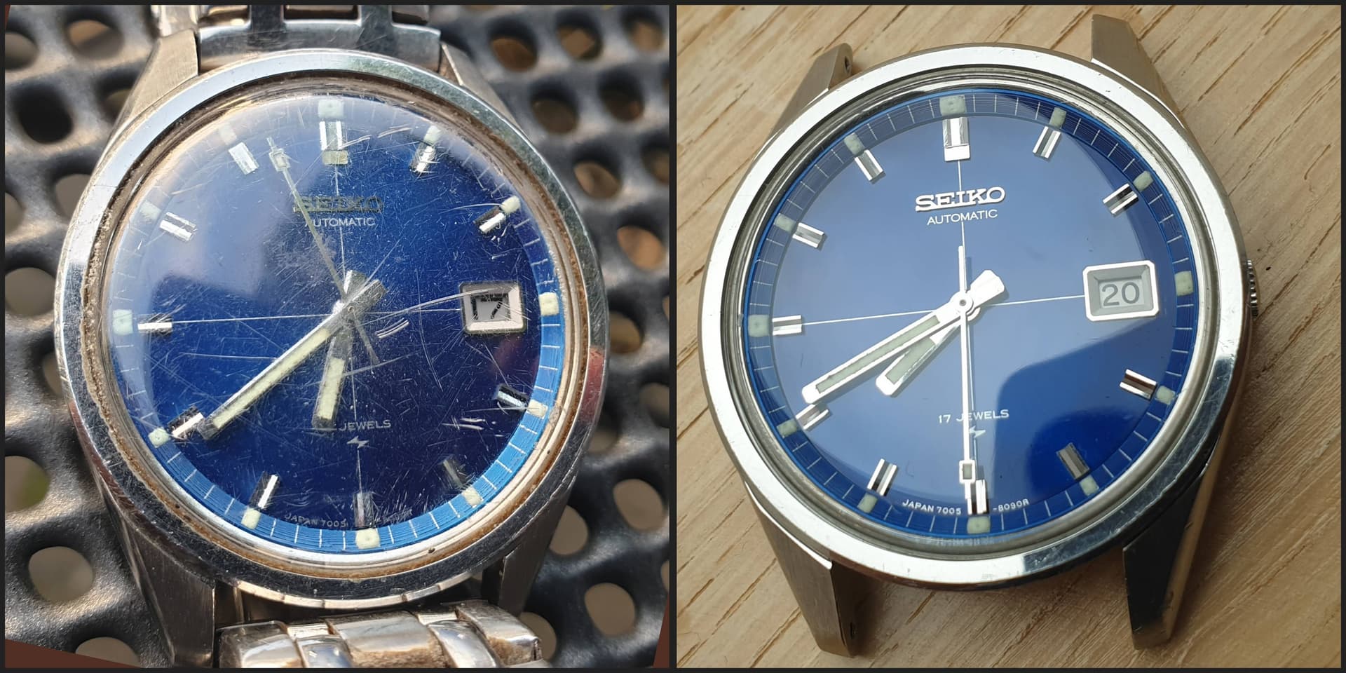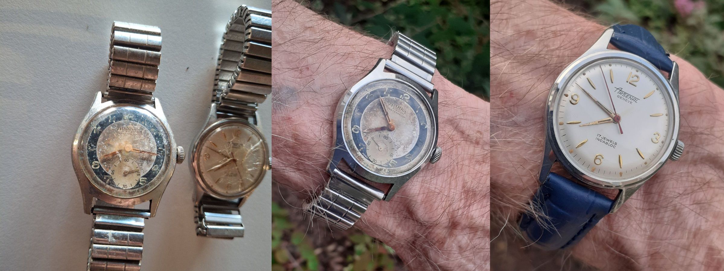 Vandaag een lot van twee horloges uitgepakt en beide onderhanden genomen, zoals je kunt zien is de plaat van de Birka zodanig verouderd dat aan de plaat niets meer is te doen, ik heb het originele glas gepolijst en de kast en flexband in de ultrasoon gehad en over de polijstborstels gehaald.