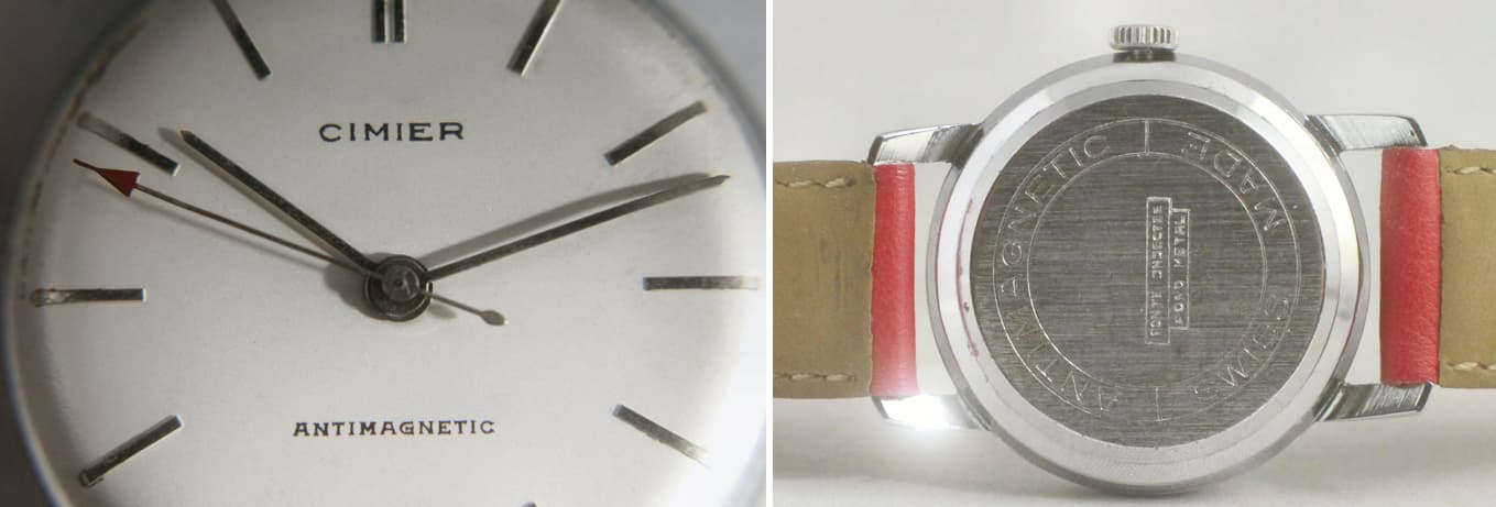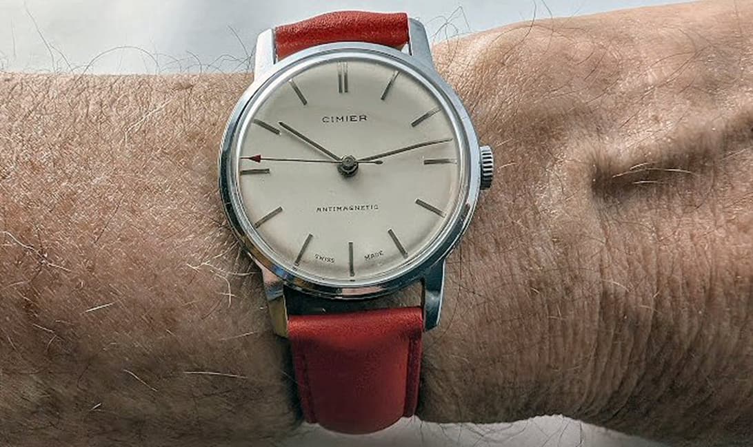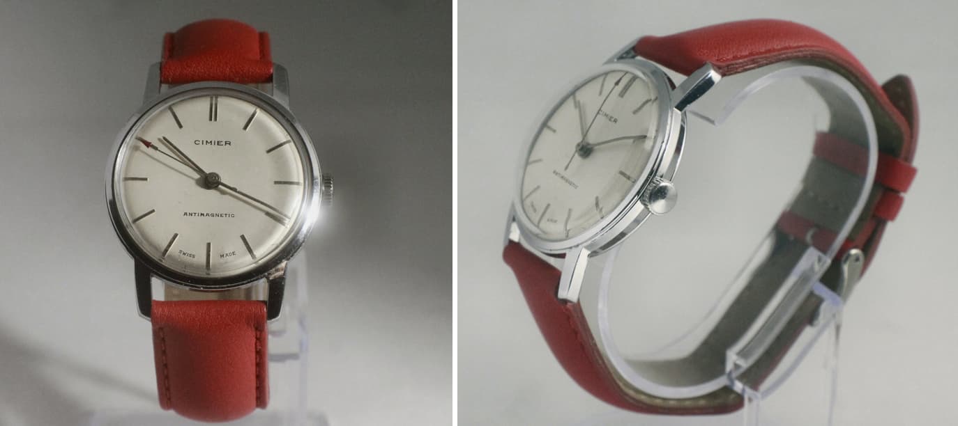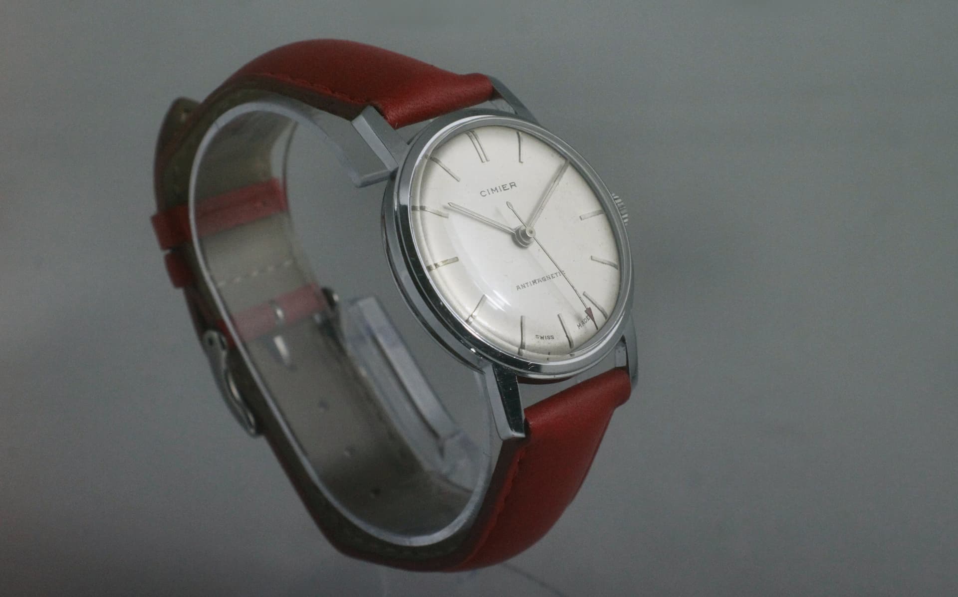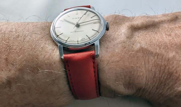 Een volkomen gave ietsje crème kleurige wijzerplaat met het rode pijlpuntje aan de secondenwijzer en de mooie witmetalen opgelegde uren markertjes gaven het horloge toch meer cachet dan je van de (vermoedelijk) lage oorspronkelijke aanschafprijs zou mogen verwachten. Het glaasje was wèl beschadigd met een flinke barst aan de rand, dus onherstelbaar en dat werd daarom vervangen door een passend nieuw exemplaar. Het eigenwijze rode puntje van de secondewijzer deed mij besluiten dat accent te benadrukken door het horloge van een felrood leren bandje te voorzien.