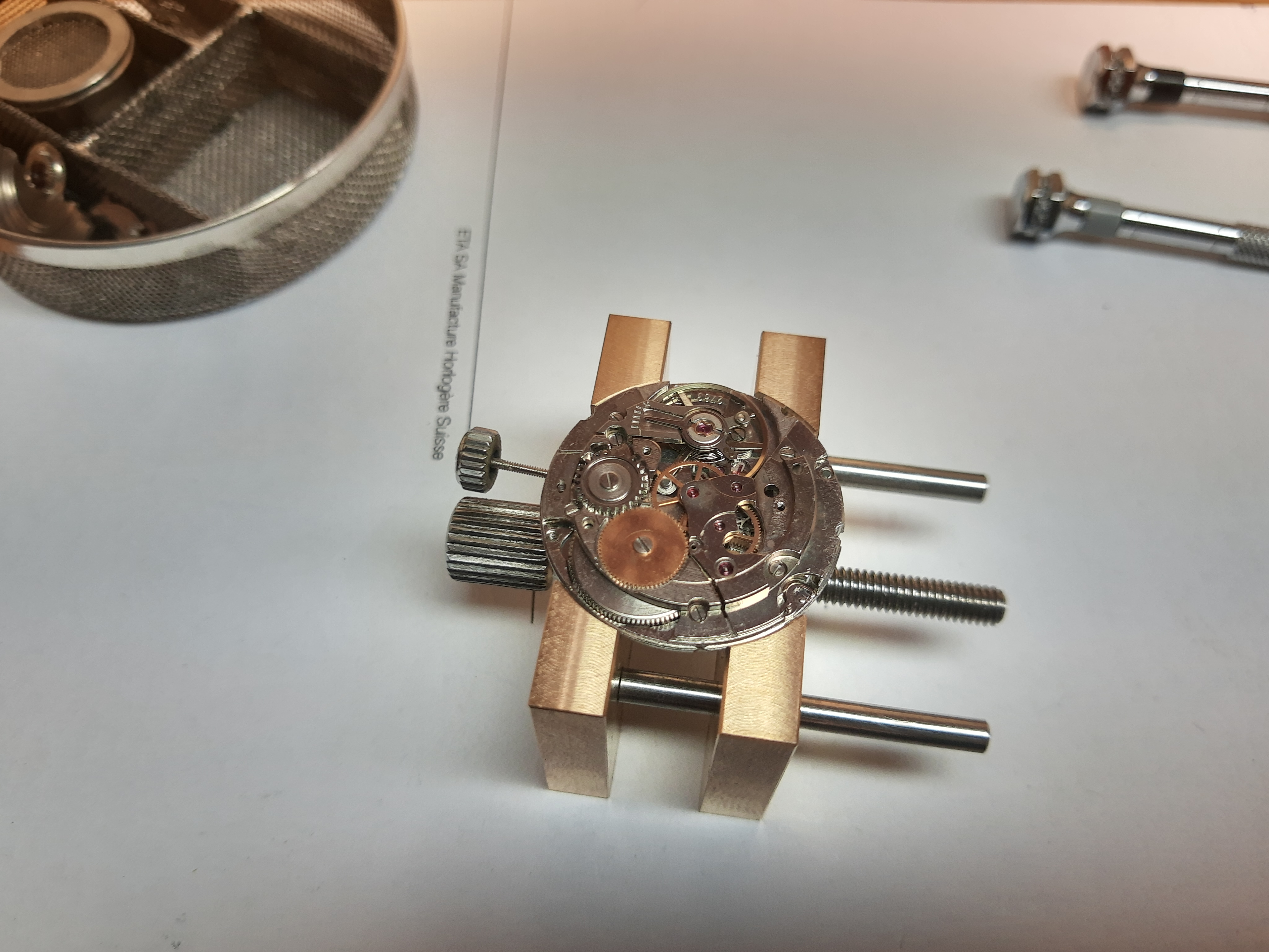 Echt tot leven gemaakt heb ik dit horloge niet. Het liep nog, maar de datumverzet deed het niet. Schijnbaar heeft dit horloge in het verleden een klap te verwerken gehad, misschien eens gevallen of zo, want het uurwiel was uit zijn positie geschoten. Dat draaide nog wel, maar maakte geen contact meer met de datumwielen. En terug gedrukt, en alles doet het weer.