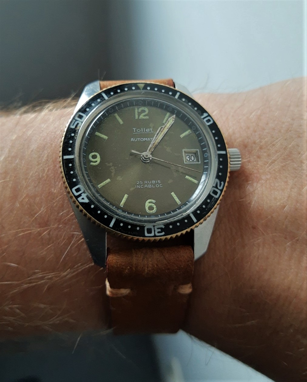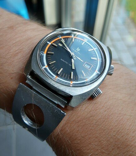 De wijzerplaat is heel mooi. Ben al een tijdje op zoek naar een 300m sous marine (hebben ze met ontelbaar veel merkjes op gemaakt) en die hebben dezelfe markers op 6,9 en 12