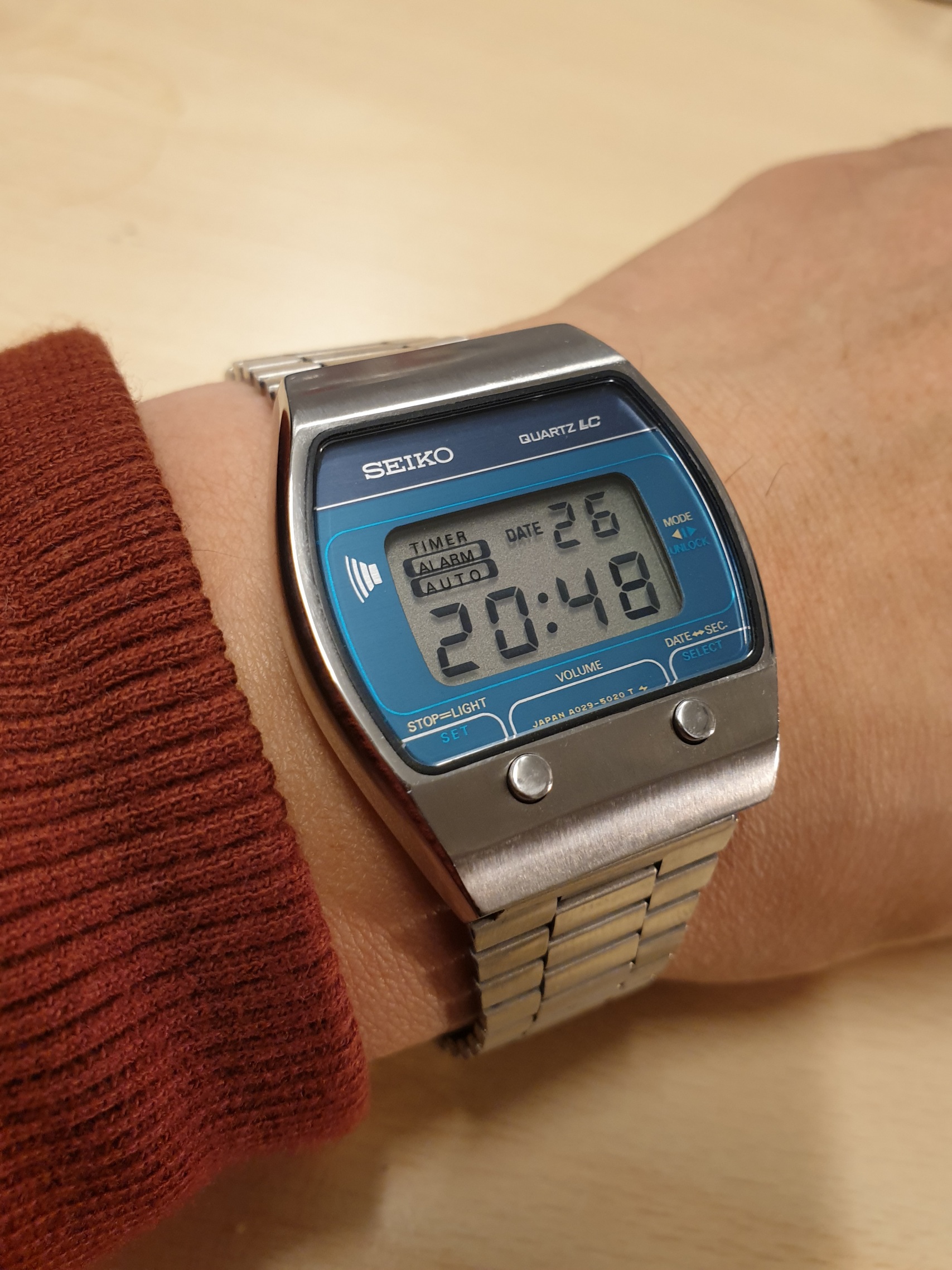 Een werkend Seiko A029 van de allereerste series met alarm uit 1978. Heeft 2 volume standen voor geluid en ook een timer functie.