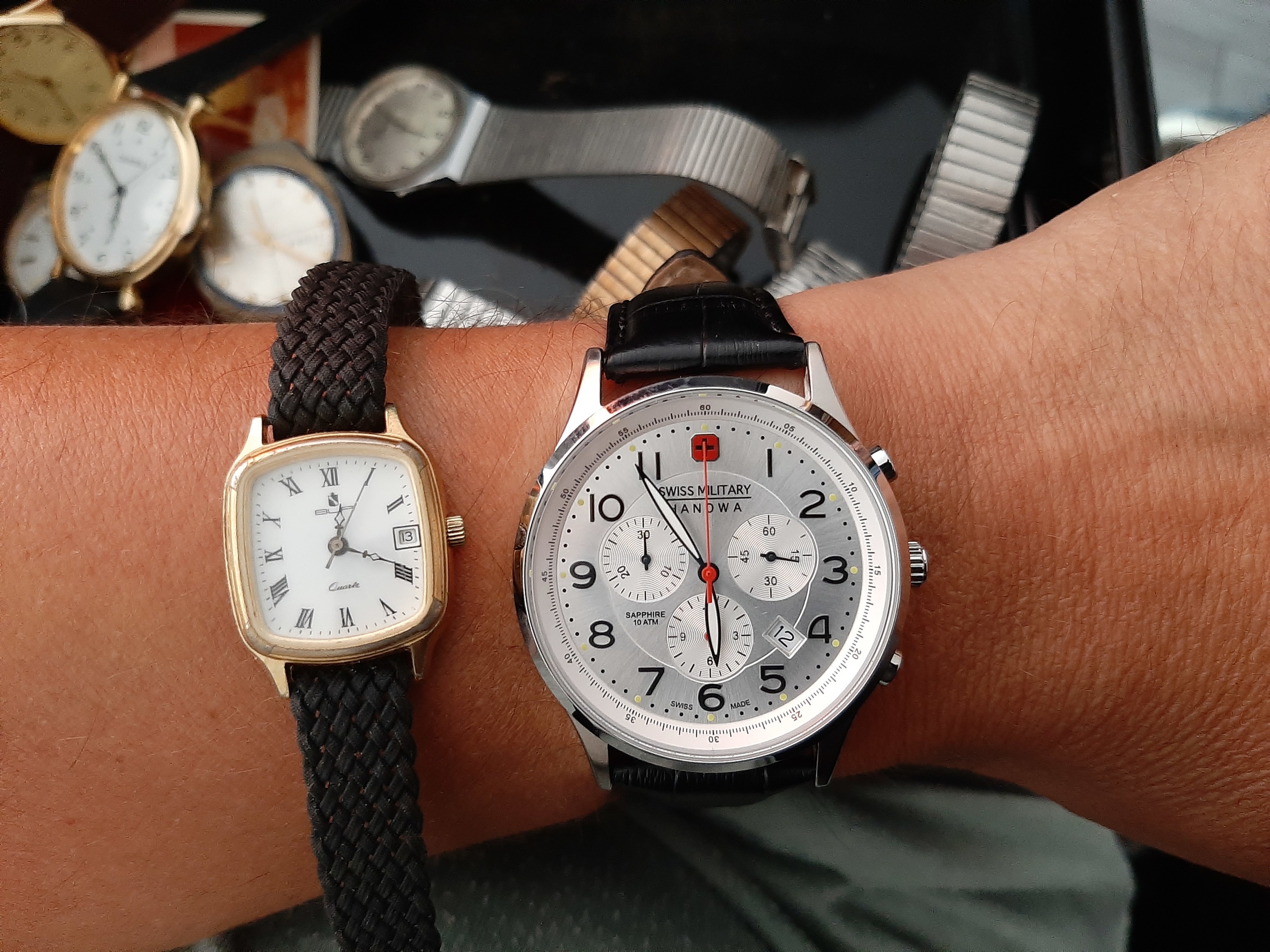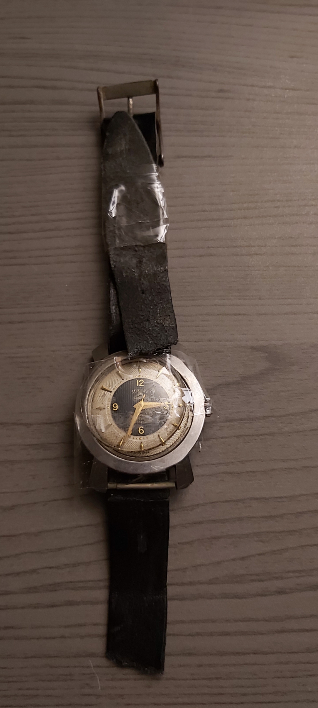 Op de foto samen met een eveneens van de ondergang gered piepklein Zwitsers Anker horloge, dat nu regelmatig door mijn dochter gedragen wordt.
