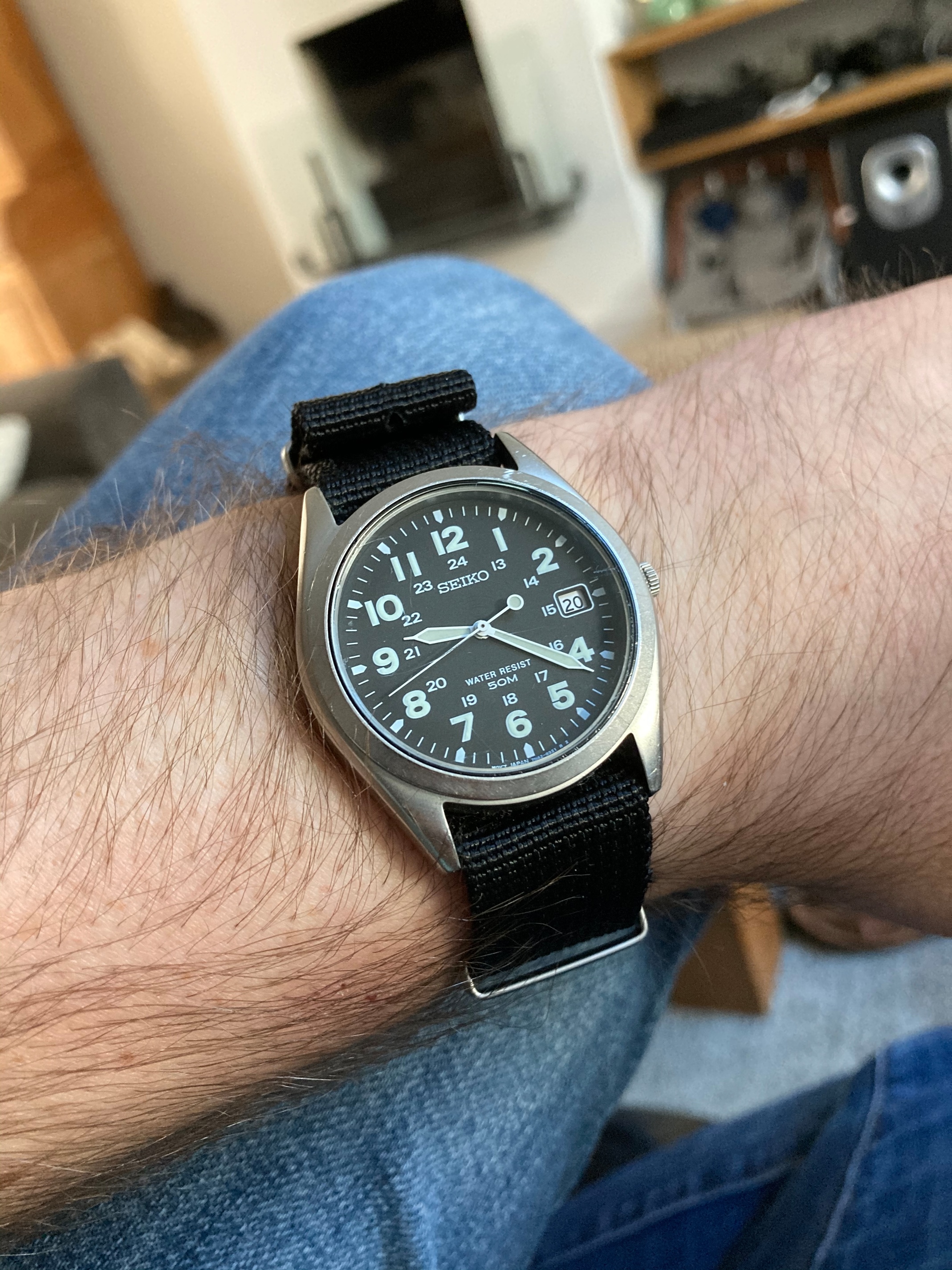 Qua kleur past het perfect bij die groene plaat natuurlijk. Misschien wat sportief bij een gouden, toch wat dresser achtige Seiko? Ik zou het wel doen. De combinatie is wel mooi jaren 70 vintage. Past vast ook mooi bij een English Racing Green Jaguar Mark X uit die periode…