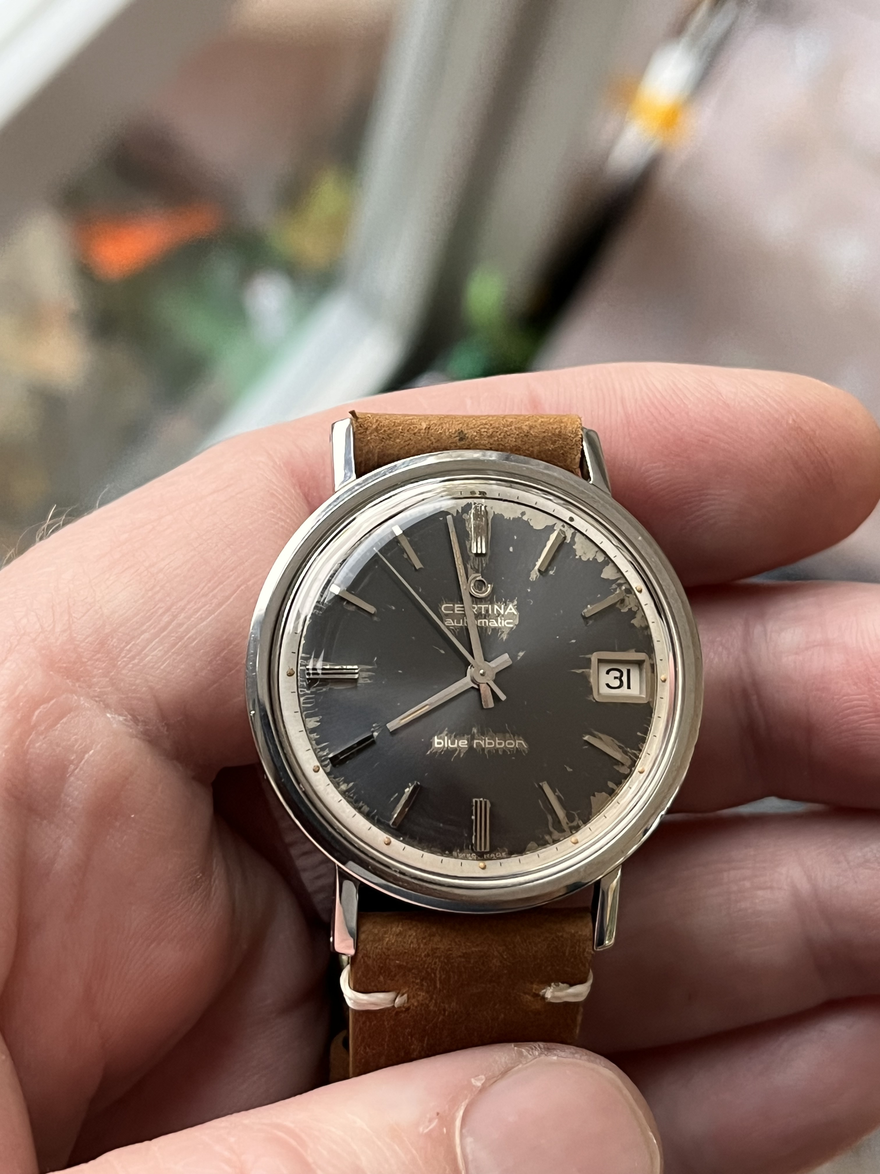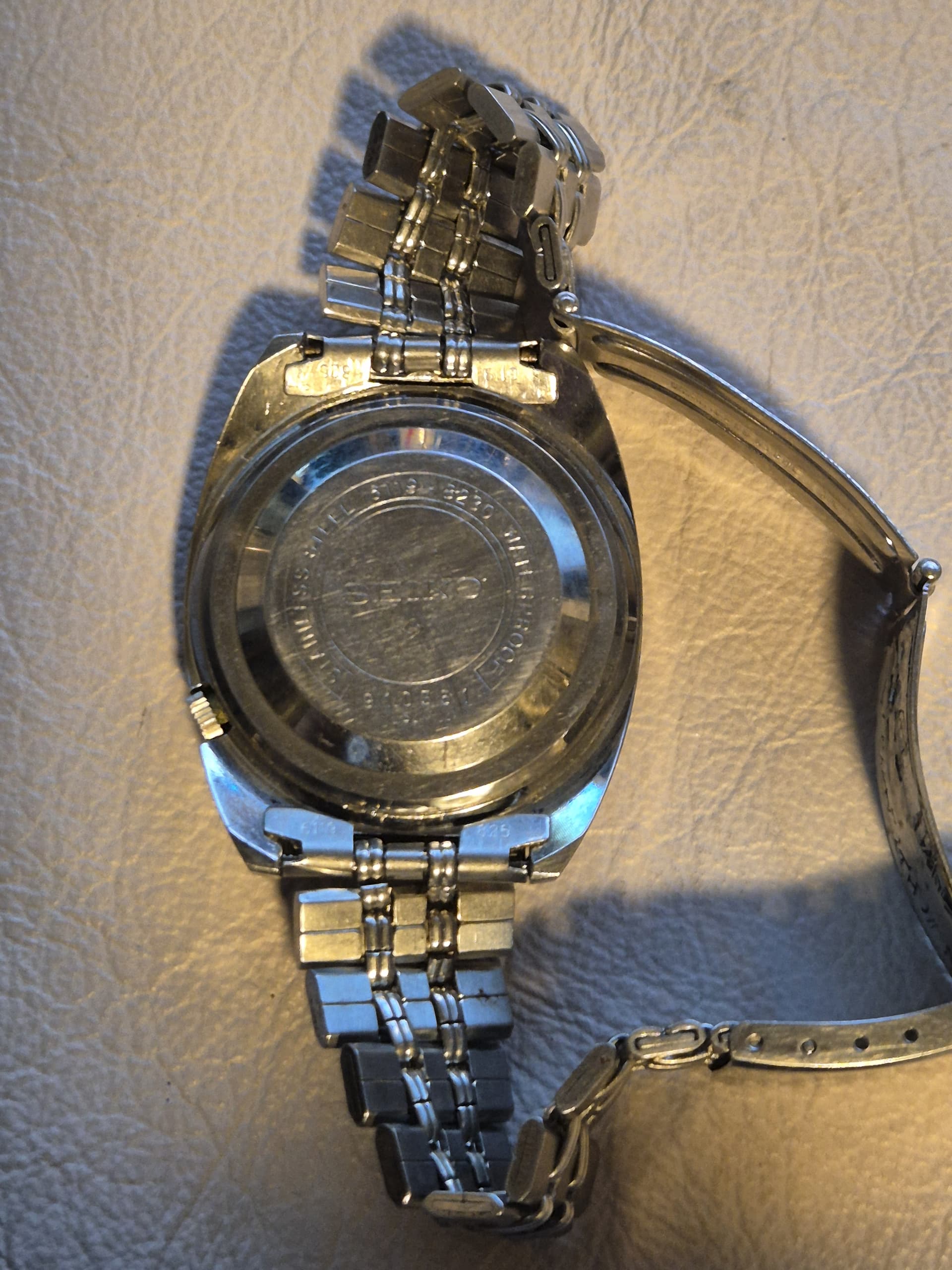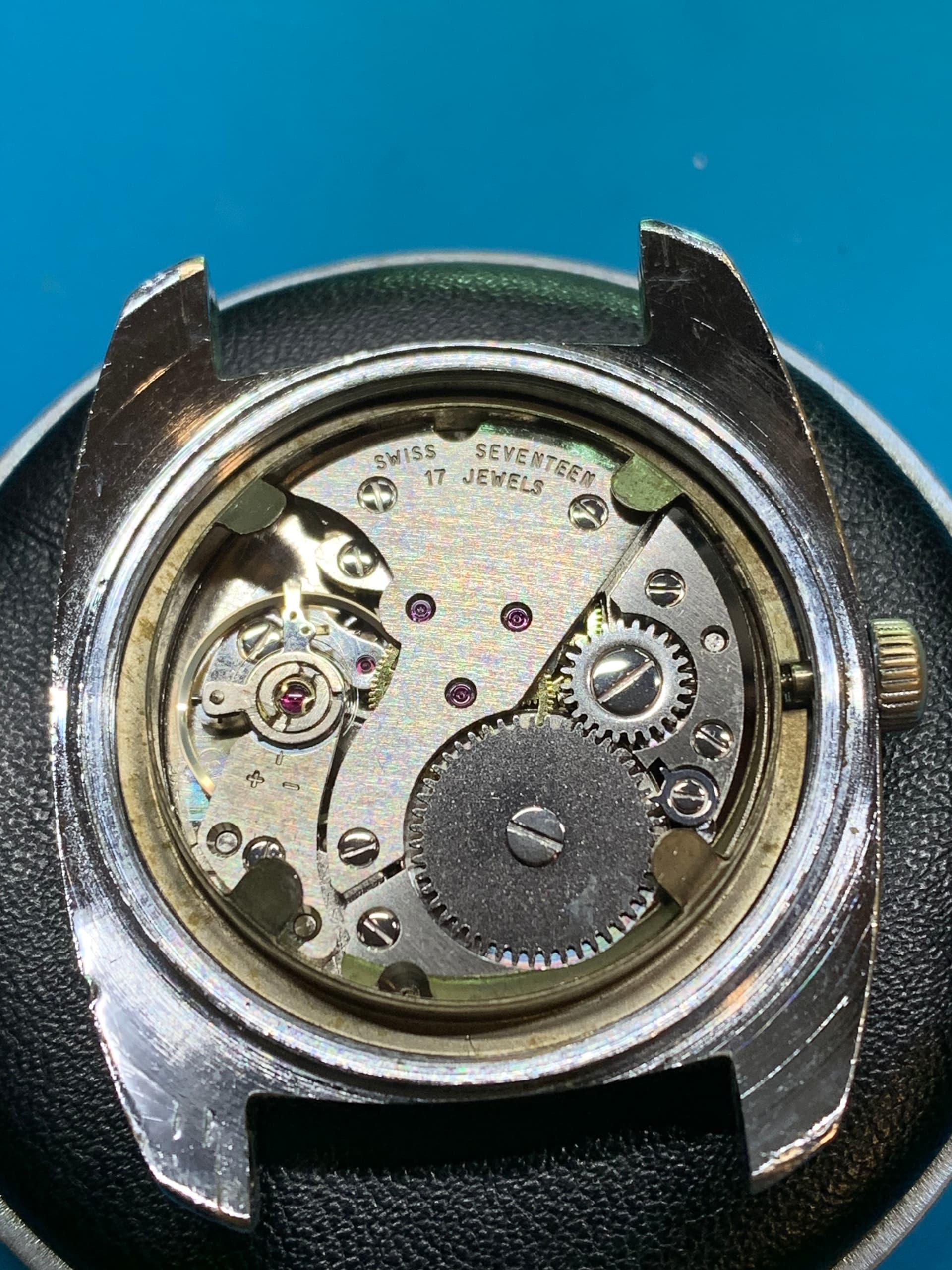 De kast zo goed als mogelijk roestvrij gemaakt en heel licht gepolijst, en daarna het uurwerkje een beurtje gegeven. Het liep zeer slecht en het zou me niets verwonderen, als dit de eerste keer is geweest, dat dit horloge onderhoud heeft gehad… Nu loopt het een stuk beter, echter de amplitude is nog wat aan de lage kant. Voor nu meer dan goed genoeg. Nu nog wat schakels voor de originele bracelet erbij zoeken, dan is het helemaal perfect…