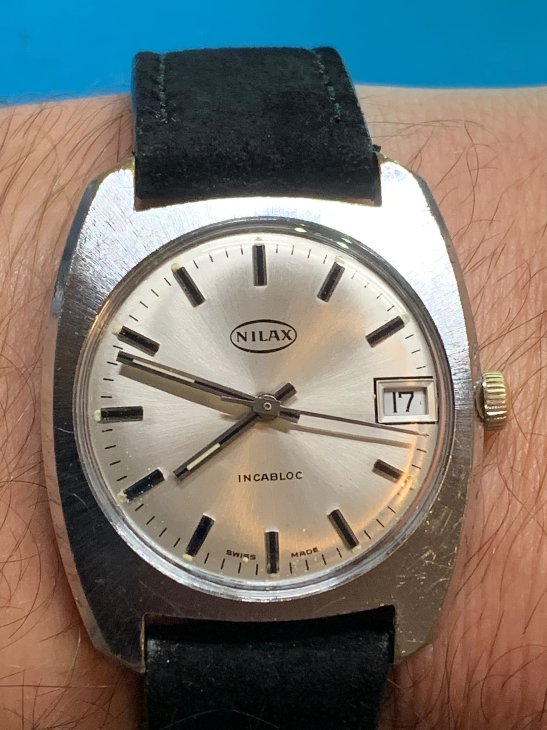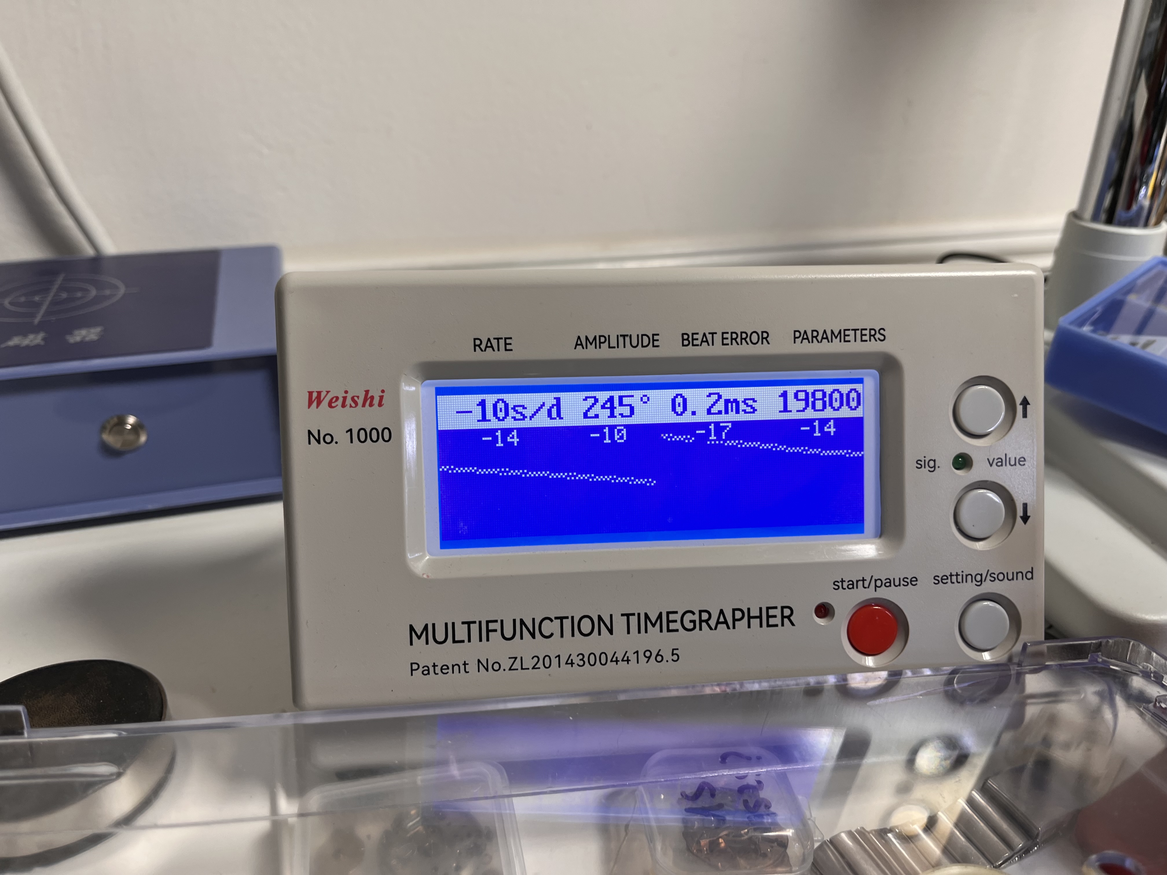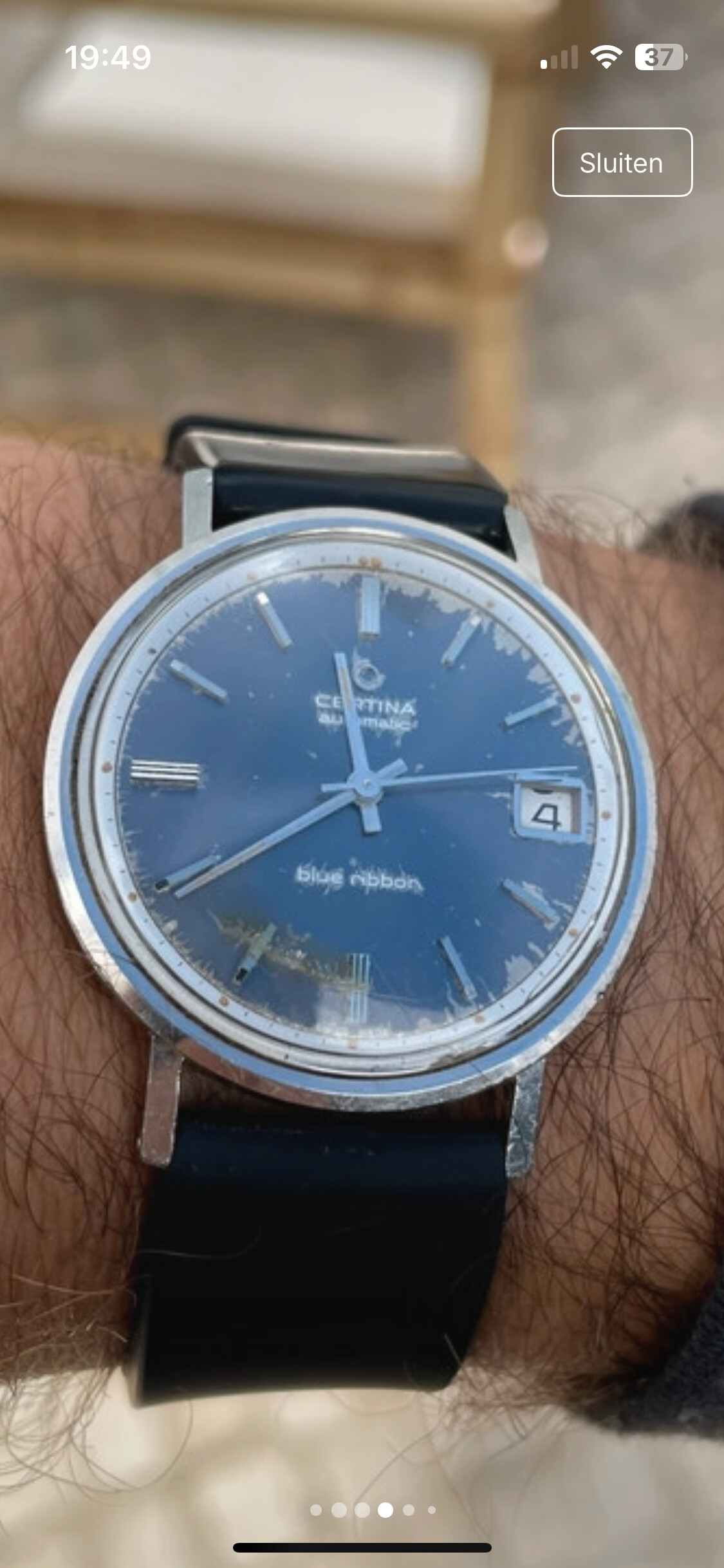 De kast zo goed als mogelijk roestvrij gemaakt en heel licht gepolijst, en daarna het uurwerkje een beurtje gegeven. Het liep zeer slecht en het zou me niets verwonderen, als dit de eerste keer is geweest, dat dit horloge onderhoud heeft gehad… Nu loopt het een stuk beter, echter de amplitude is nog wat aan de lage kant. Voor nu meer dan goed genoeg. Nu nog wat schakels voor de originele bracelet erbij zoeken, dan is het helemaal perfect…