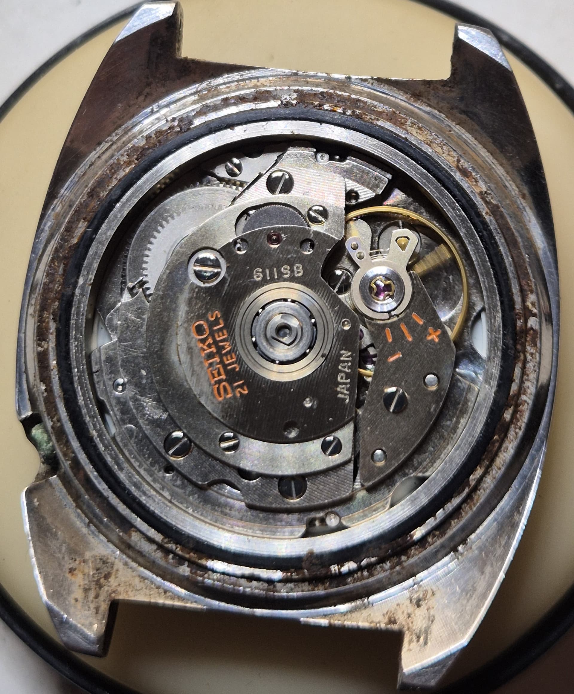 Deze Seiko 5 6119-8230 uit 1969 heb ik weer helemaal opgeknapt. Het was een bonk roest, daar is nu nog maar weinig van te zien. Het kostte nog heel wat moeite om de kast open te krijgen, gelukkig zonder schade. Deze heeft gelukkig nog geen mineraal glas, maar een dikke plexiglazen glaasje, waar de krassen vrij gemakkelijk uit te polijsten waren. De pakkingen hebben hun werk wel heel goed gedaan, wat je niet zou verwachten met zoveel roest… Ze waren zelfs nog lekker zacht. En het uurwerkje had niet eens een spoor van vocht.