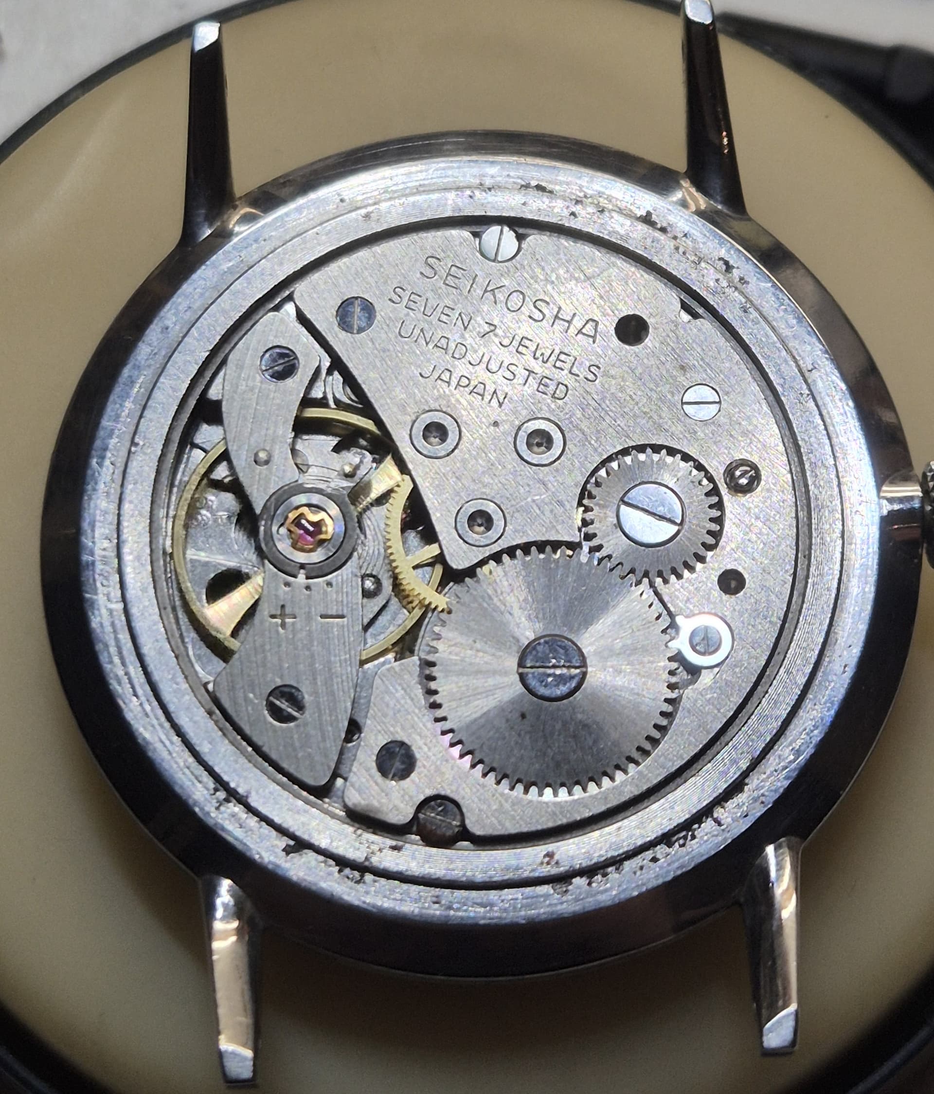 Het getal laat het al raden, een uurwerkje met 7 jewels. Het horloge is nog een best goede staat, zowel kast als uurwerk. Gemaakt in 1962 met een mooie stalen kast.