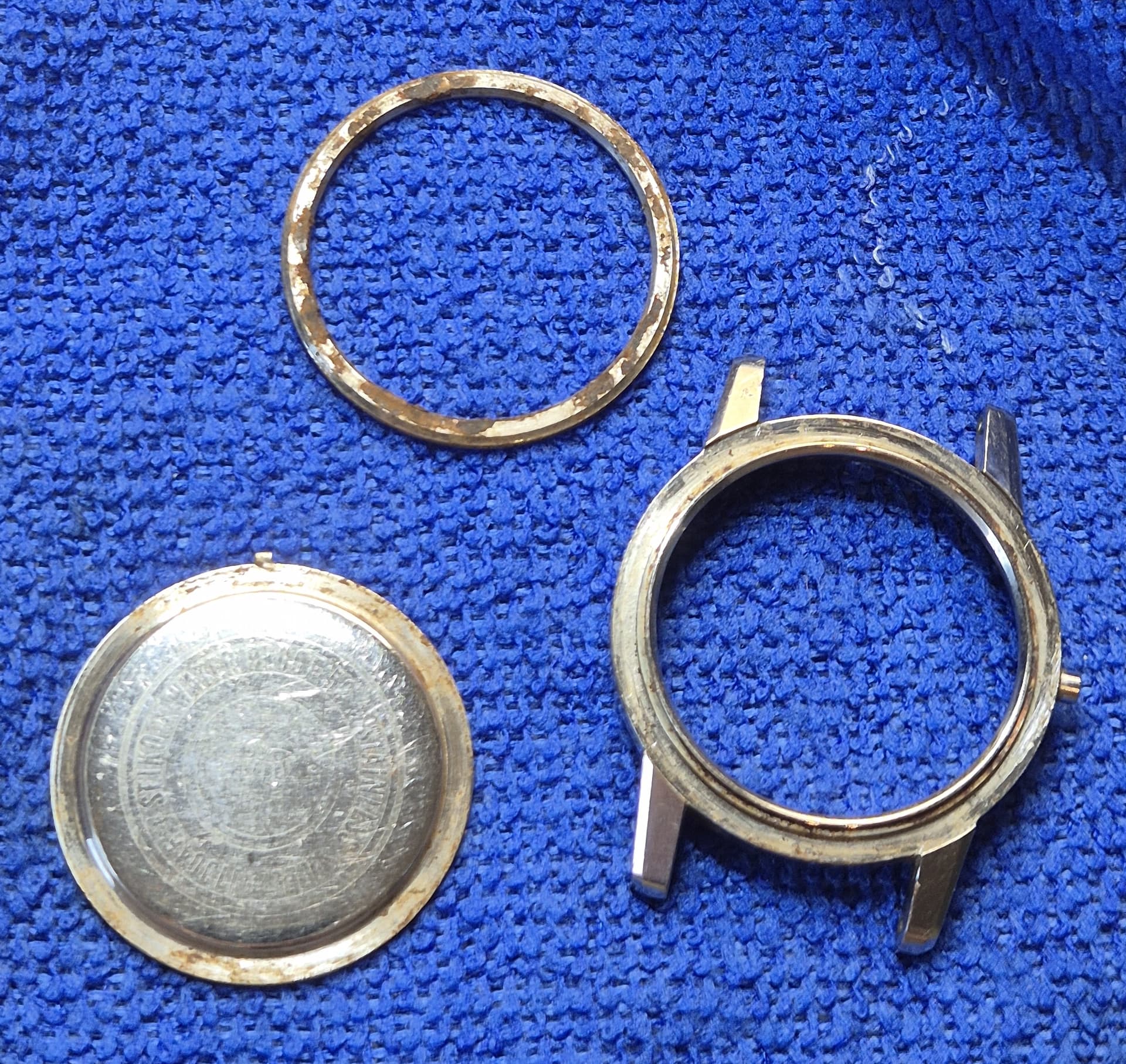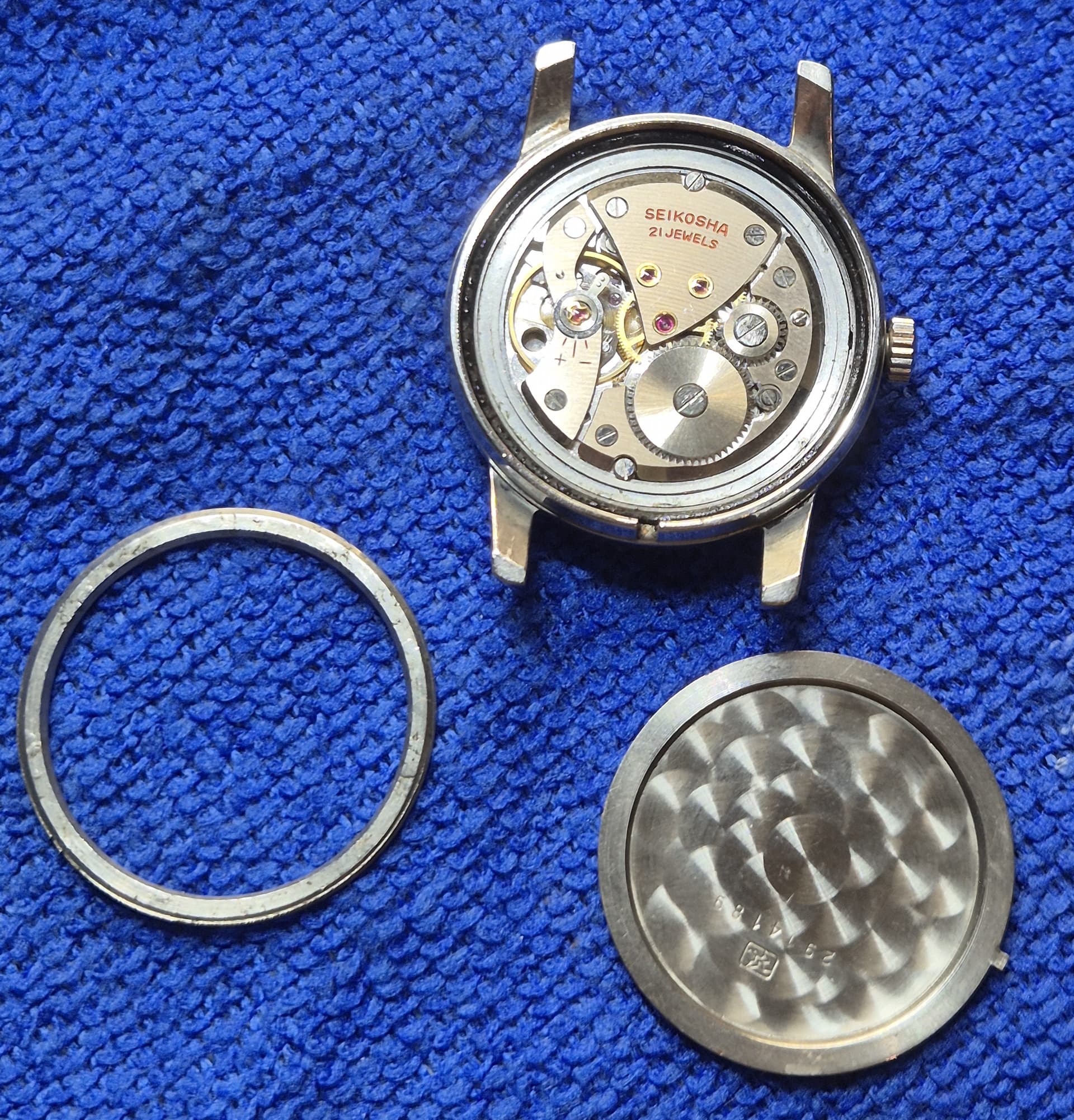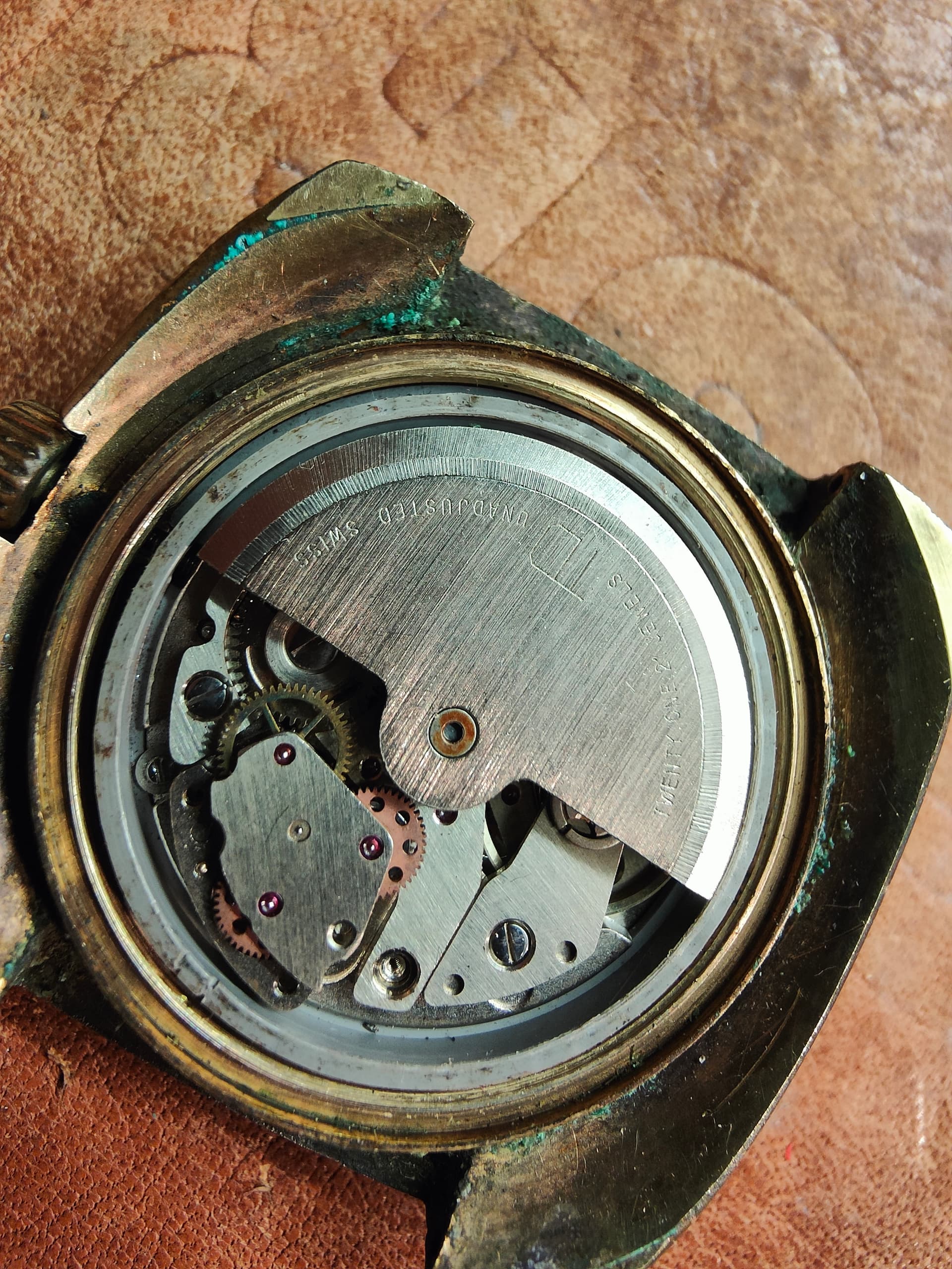 Deze Seiko Cronos J13046 waterproof is afgelopen week uit Japan gekomen. Op het eerste gezicht zag het er niet heel slecht uit, maar toen je eens nader ging kijken, was er toch wel wat loos. De kast zat vol met roest, het glaasje was slecht, en het uurwerk liep wel, maar belabberd. En dan ga je in het horloge kijken, althans dat was het plan. Roest had de caseback geblokkeerd. Maar gelukkig toch zonder schade los weten te krijgen. En dan was al snel duidelijk, waarom het uurwerk zo belabberd liep. Het uurwerkje had wel onderhoud gehad, maar wel met overmatig oliegebruik. En dan bleek, dat de tiretteveer gebroken was, maar gelukkig heb ik er daar een heel aantal van liggen. Verder was er niet veel meer nodig dan een goede schoonmaakbeurt, en loopt het nu met een amplitude van 249° (Wijzerplaat onder), 261° (verticaal), 277° (wijzerplaat boven).