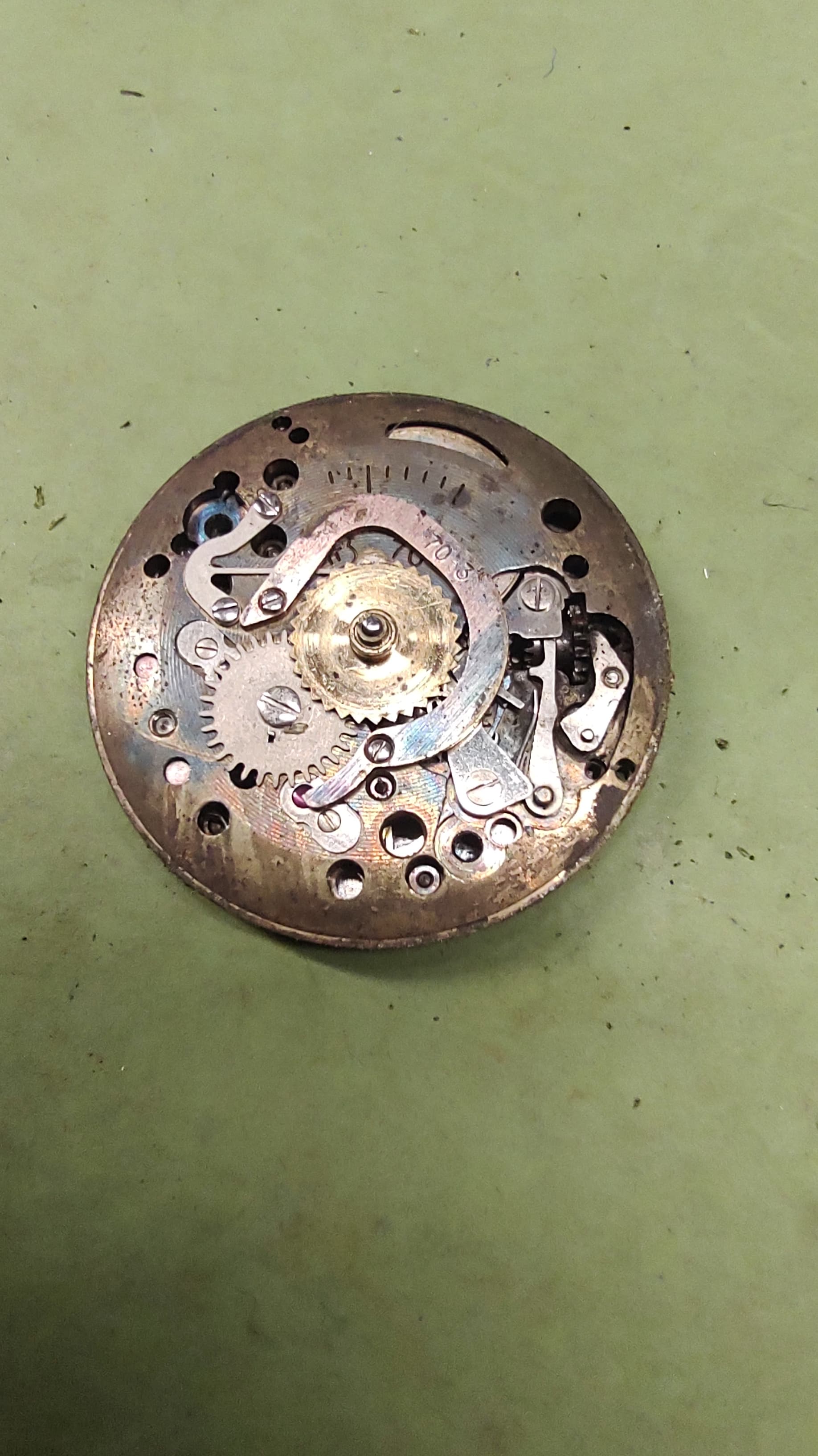 De onderdelen voor dit horloge zijn lastig te vinden, vooral de stem en de kroon beginnen schaars te worden. Ik was gelukkig genoeg om de passende veer voor deze stem te vinden, want die ontbrak. Gelukkig was het tandwieltje om de interne bevel te bewegen, nog wel aanwezig. Want die zijn pas echt moeilijk te vinden. En voor het uurwerk had ik gelukkig genoeg onderdelen liggen, want de veerton had best wel wat speling, en tussen de onderdelen lag nog een goede. Zo ook de balans.