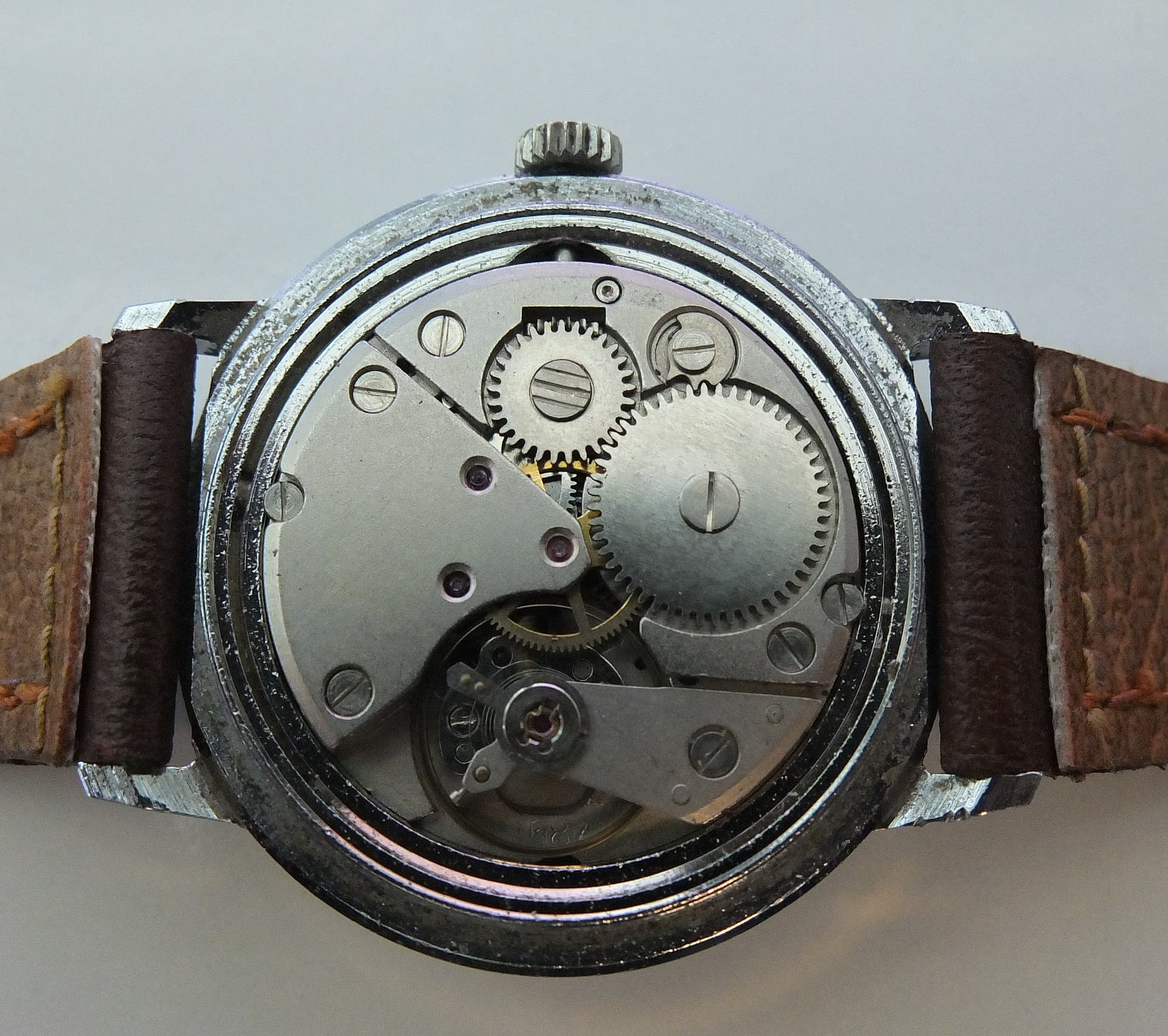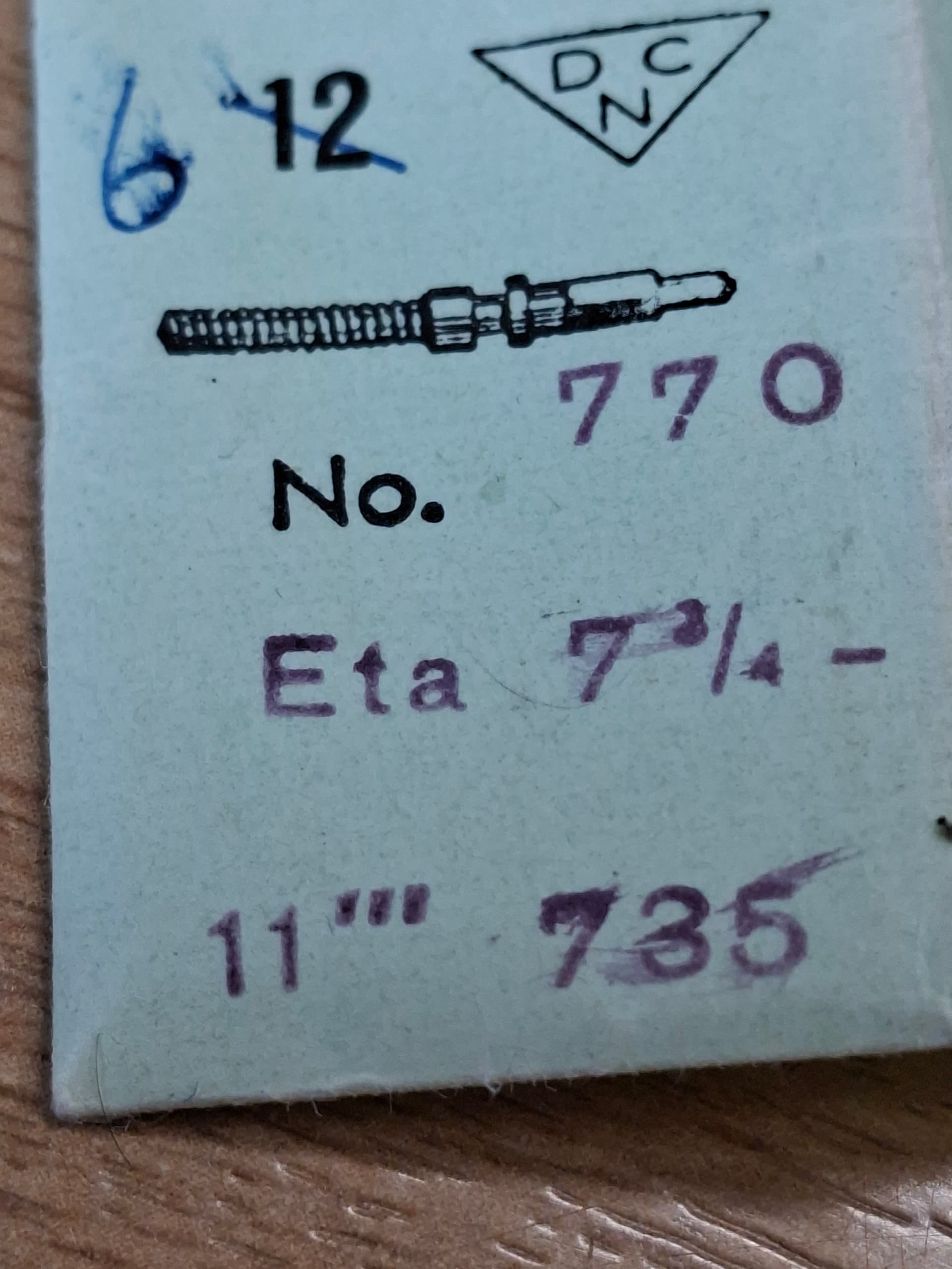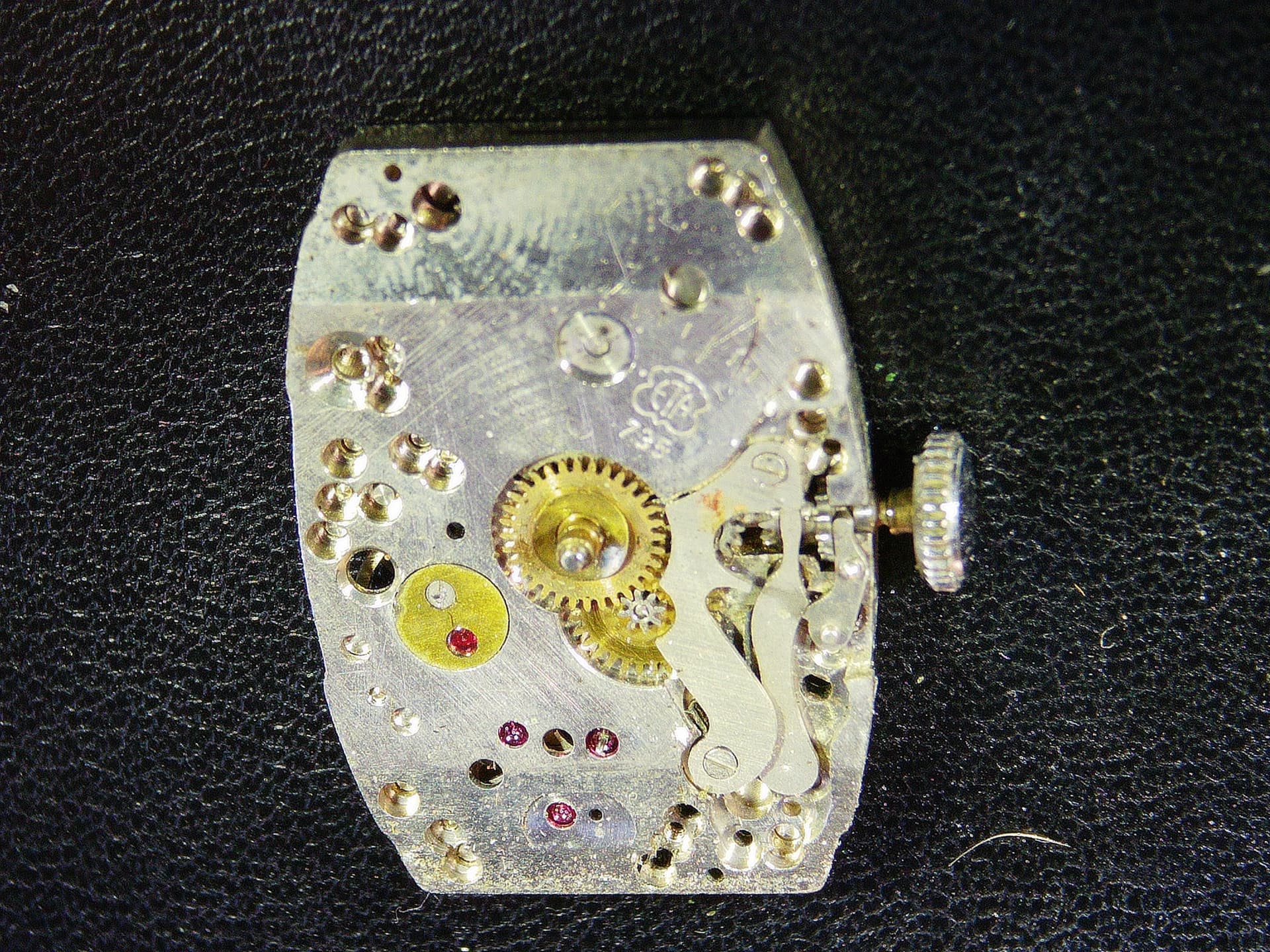 Dus een nieuwe stift gepakt en daar zat echt aanzienlijk minder speling op wanneer ik hem in het keyless mechaniekje drukte. Mooi dacht ik nog. Maar, het opwinden van de veerton ging RUK. De tandwielen knarsten nog steeds over elkaar. Bij een betere inspectie van het transmissierad bleken de tandjes schuin weg gesleten (geen foto van). Wat nu. Nou, dan gaan we maar eens graven in de voorraad. Van een ETA 1080 lijkje het transmissierad gepakt en die bleek identiek te zijn aan die in de ETA 735 en zag er goed uit. Dus die erin gestopt en dat werkte. Kon het horloge opwinden zonder tanden geknars. Blij mee.