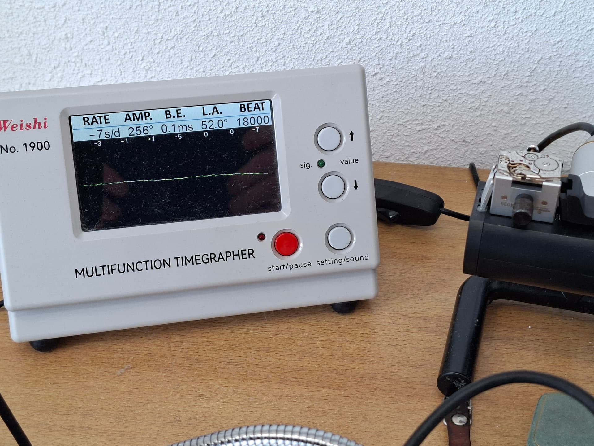 Vervolgens het gehele uurwerk olie gegeven en het spul op de timegrapher gelegd. Zo links en rechts wat afstellen en voor een ouwetje van 1940 liep het heel zo slecht niet. Ook daar aangenaam verrast mee.