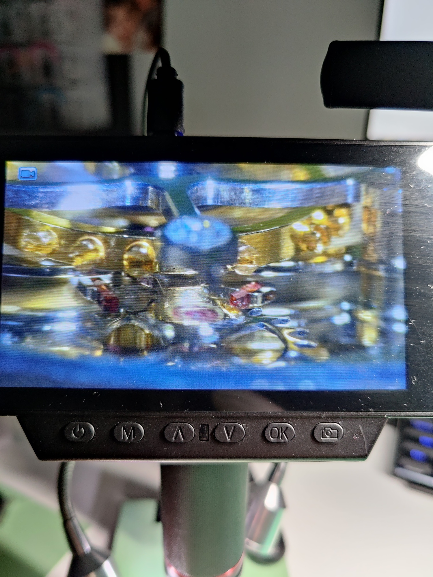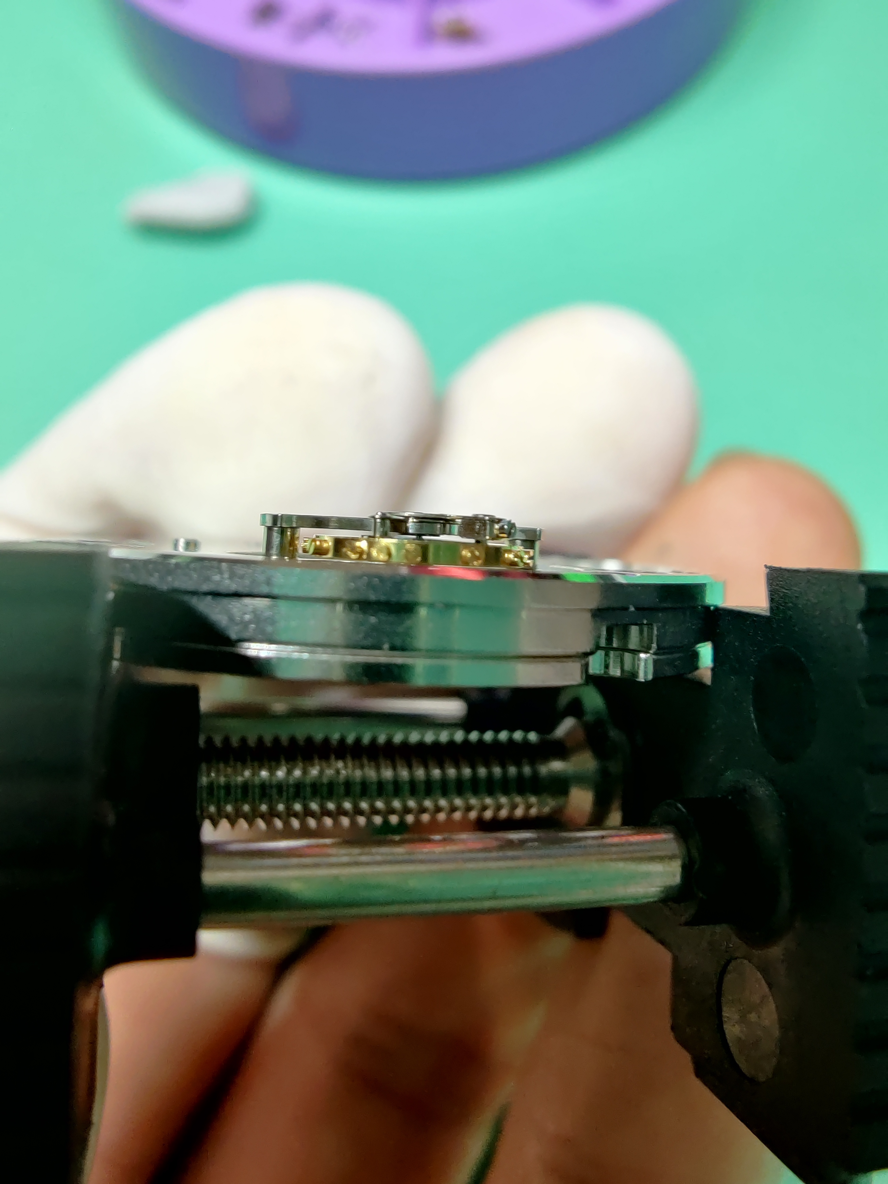 Doordat het een bewegende tourbillon is, gaan de lijnen de hele tijd op en neer. Je kan tourbillons alleen timen op de ouderwetse manier, na 24 uur kijken wat de afwijking is. Idealiter 24 uur in 1 van die apparaten die horloges de hele dag door draaien en cirkelen:
