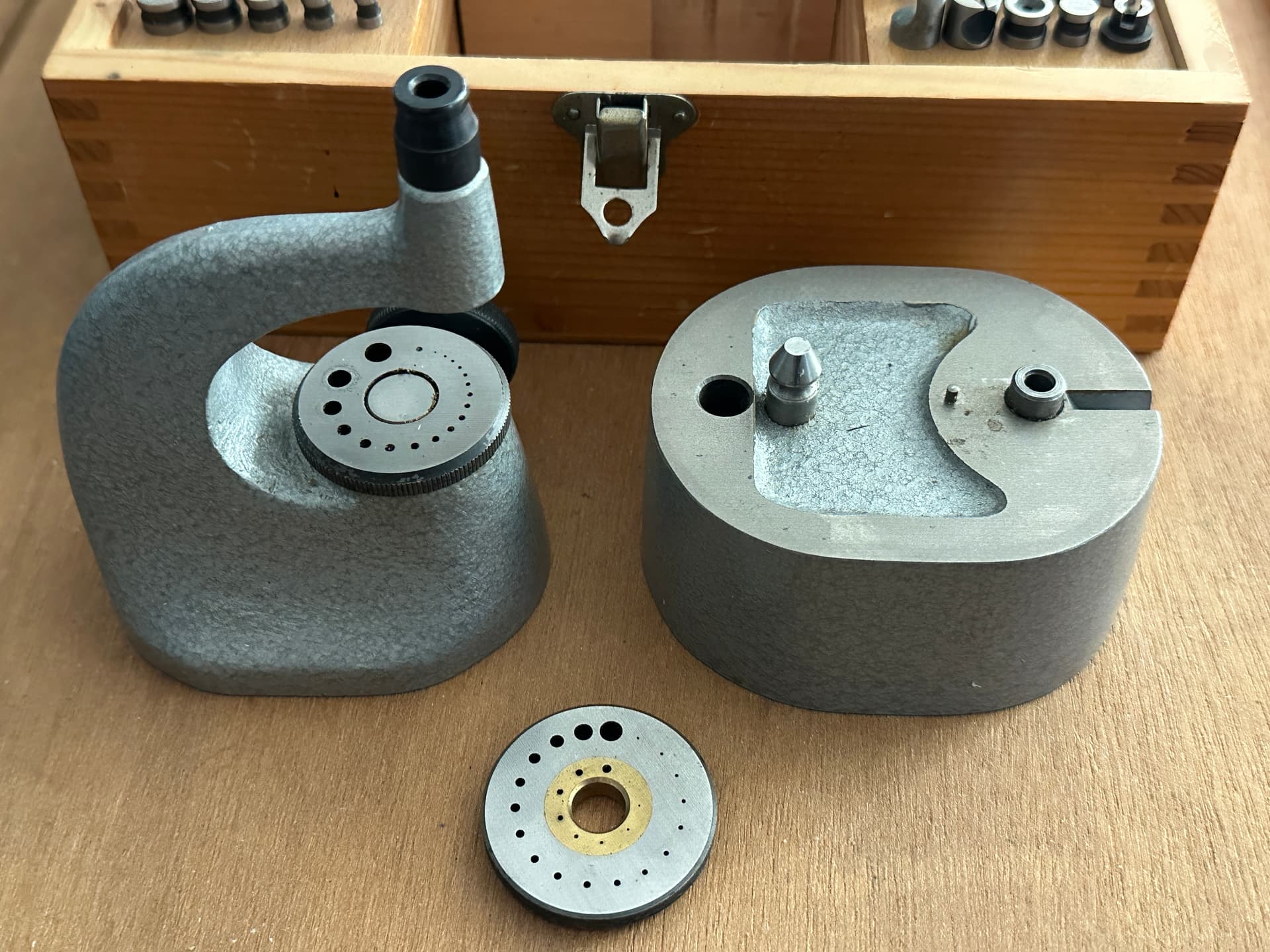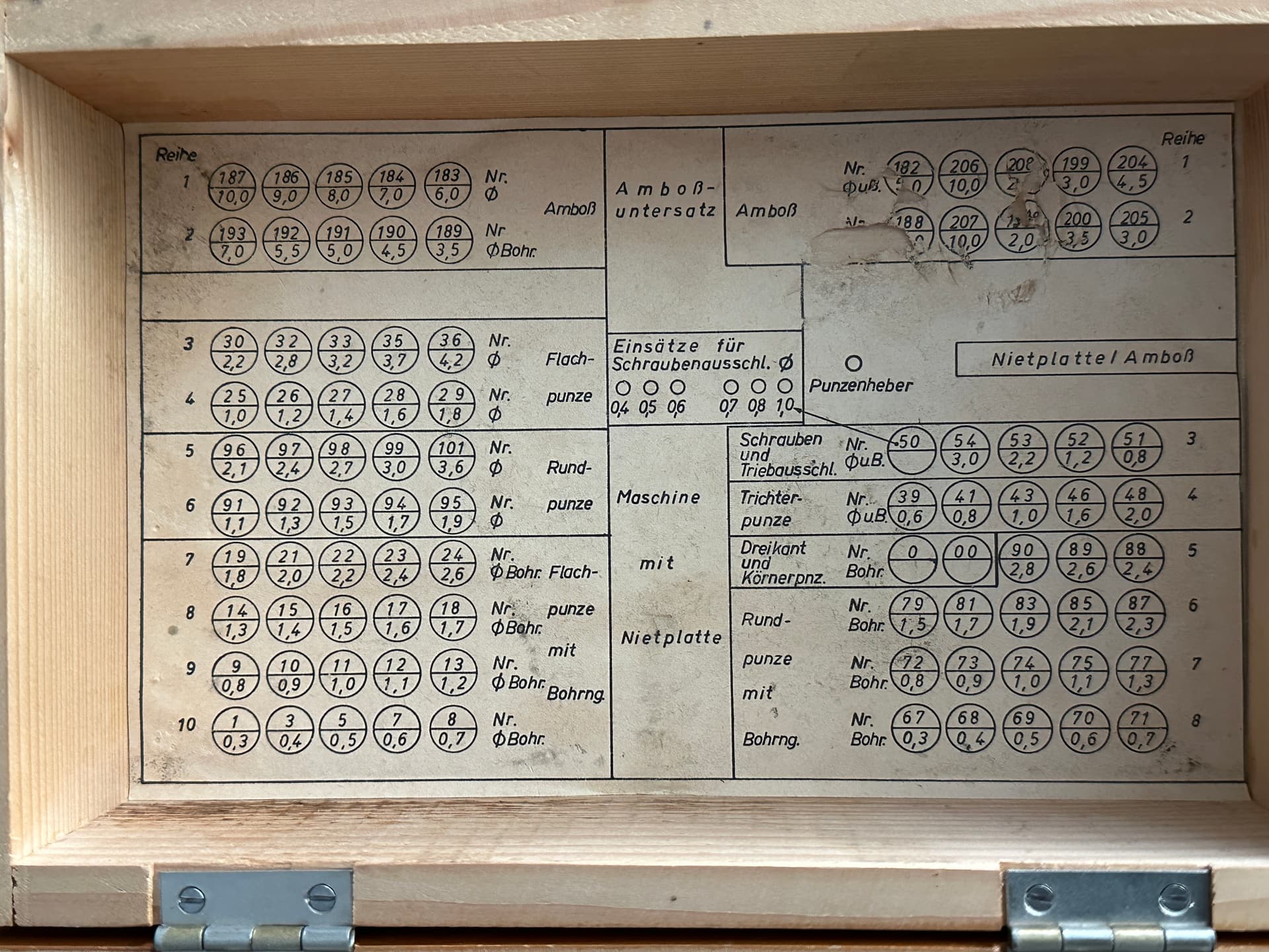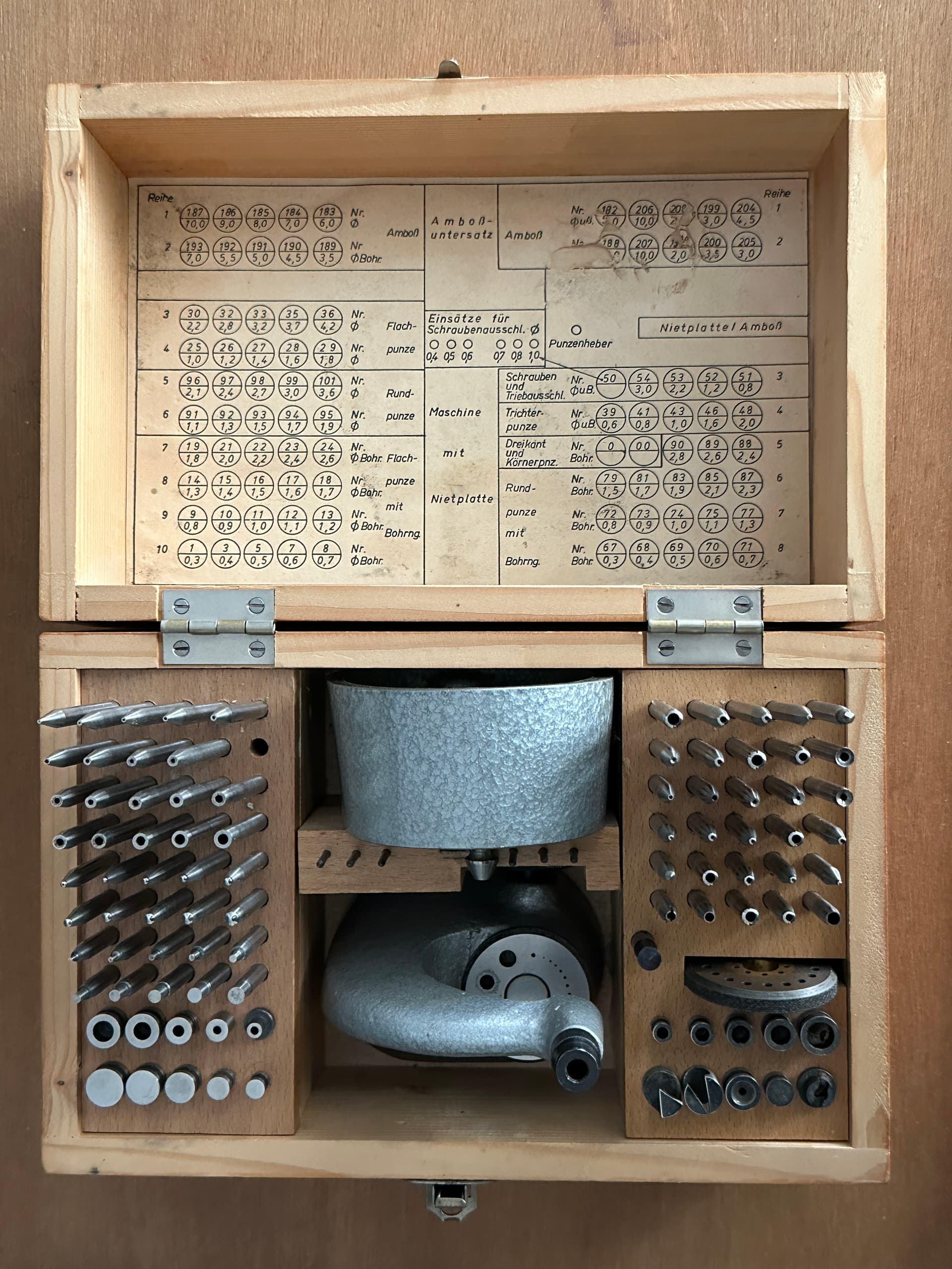Triebniet in bijna nieuwstaat met 49 ponsen, 22 aambeelden en meer accesoires compleet in kist, van Duitse fabrikant 395 euro excl aangetekende verzending of uiteraard ophalen