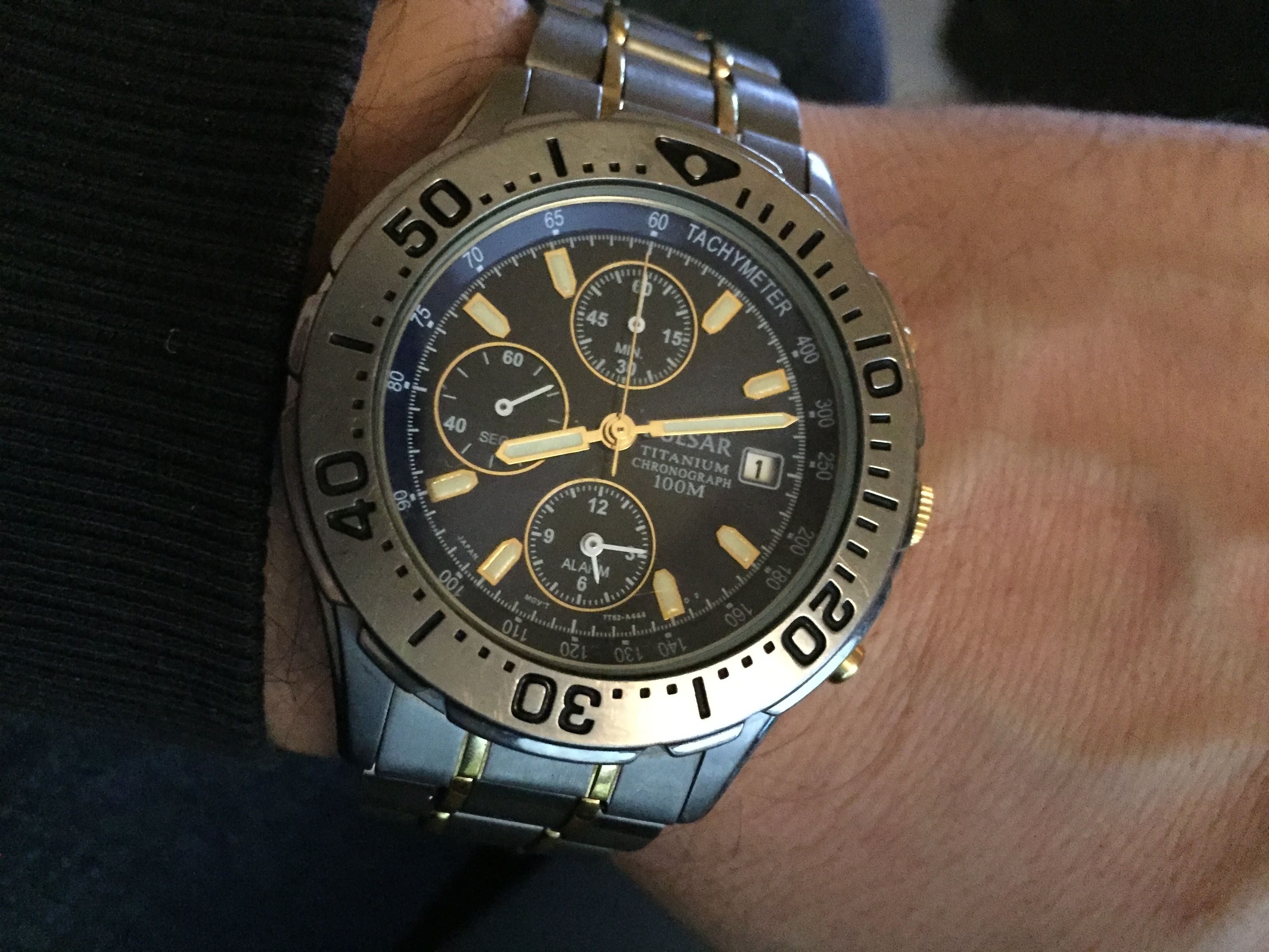Deze Pulsar waar mijn interesse in horloges mee begon stond een aantal jaar stil. Ik kreeg deze met mijn trouwen een jaar of tien geleden. Van de week batterijtje in gedaan en deze doet het nu weer. Nu kan ik deze mooi afwisselen met mijn nieuwe Seiko.