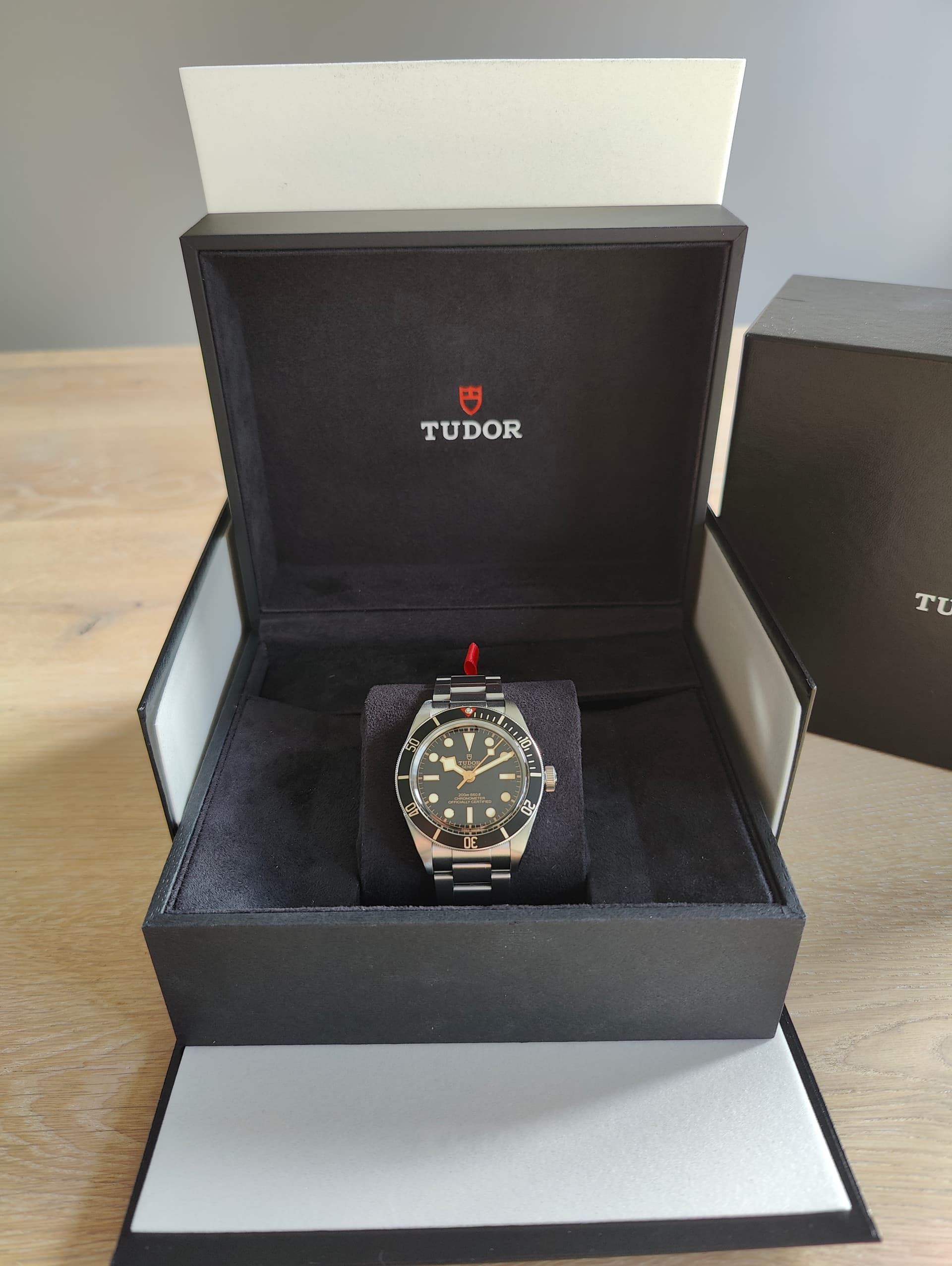 Originele doos en/of eventuele accessoires: doos en omdoos + extra links. Halve schakel en Tudor Ranger band.