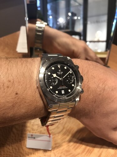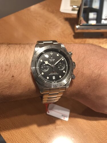 IRL mooi hoor. Wat dikke kast, in lijn met de andere black bays natuurlijk. Maar draagt goed, mooi formaat met 41 mm. Wijzerplaat heeft een korrelig effect, staat m prima. Chronopusher ontschroeven netjes, je moet wal wat hard drukken voor activatie.