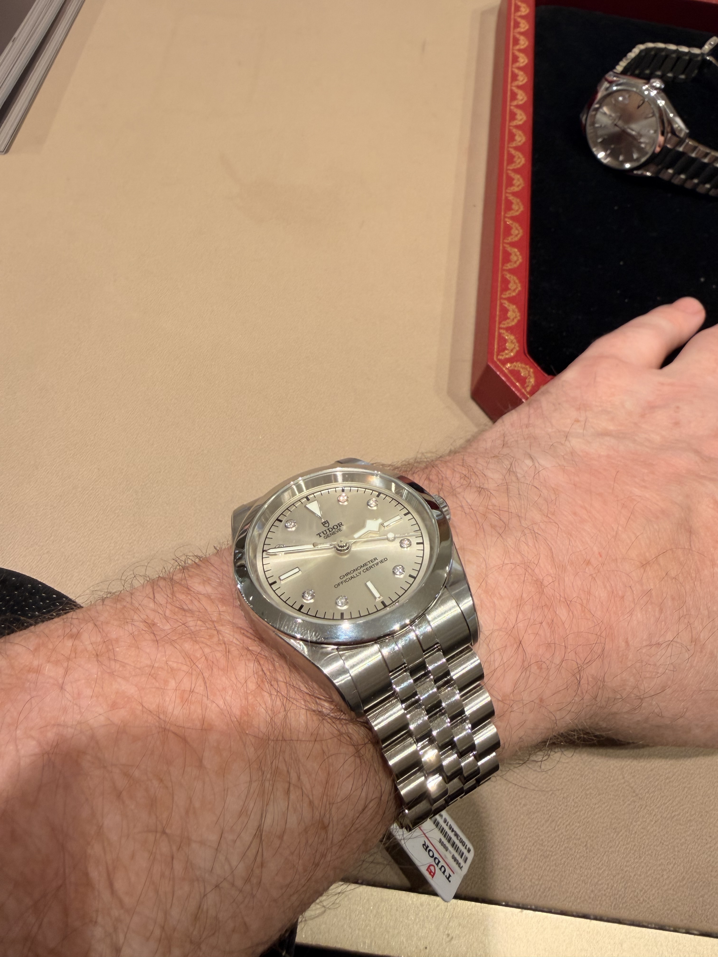 Eens, een jaar of twee geleden heb ik een 39 mm gehad. Afgelopen zomer twee keer de blauwe 42 mm gehad. Dat was echt meer horloge vond ik. Zit supergoed in mekaar, een dijk van een duiker.